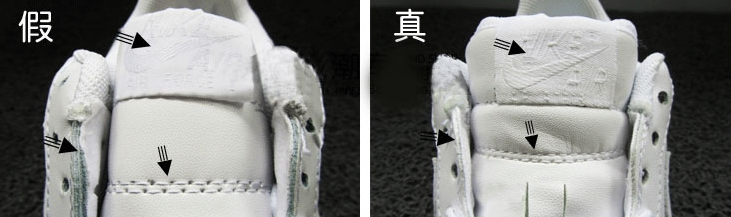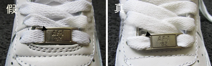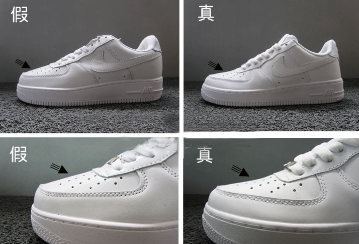 耐克粉们,今天帅气泡芙要分享的大名鼎鼎的NIKE AIR经典系列空军一号的真假辨别方法, 这款鞋子可以称得上是耐克板鞋中的绝对经典,价格较贵,精品货也是层出不穷,更有大批精品版本的耐克空军一号板鞋以高度逼真的用料和做工,足以以假乱真,淘宝上有店铺打着正品价格,出售的却是这种精品鞋子,陷阱极深了。 好了,提醒大家注意鉴别,下面示坟于真假NIKE AIR空军一号板鞋的鉴别对比图解: 一、皮革与整体鞋型 假版:采用市面劣质皮革,容易老化,色泽、光泽度差,鞋型流水线不专业,容易变形。 真版:Nike Air Force 1经典空军运动鞋结合优质鞋面、更流畅款型和更精致细节处理,鞋面覆盖层可为双足带来更强大的支撑和耐用性,透气孔设计全面提升战靴内部空气流通性,帮助双足时刻保持干爽和舒适。 经典Nike Air气垫依然闪亮夺目,为你带来超乎想象的轻质缓震与缓冲保护。 假版:采用二层劣质PU皮,缝接处做工粗糙、车线简单易脱线、鞋舌不厚实硬影响穿着舒适度,lOGO不清晰。 真版:皮质采用头层皮,做工外皮和内布缝接细节处理到位精细,鞋舌与专柜相同,是田两块皮革拼接而成。并非普通做法一张皮革车上两道线。 这样脚裸到不会被鞋舌顶着难受(因为拼接的上半部分是微微上翘的)这是真正优质品的生产工艺。鞋舌上以及后跟的NIKE电绣标志饱满厚实,做工精细,非常上档次。 假版:金属鞋带扣采用铁块喷漆,易掉漆,褪色老化。 另外左边的这三条长长的丝并非线头。AF1的鞋子鞋底均留有3条长线。俗称三线防伪,可以去专卖店看看便懂。二、鞋舌部位的对比