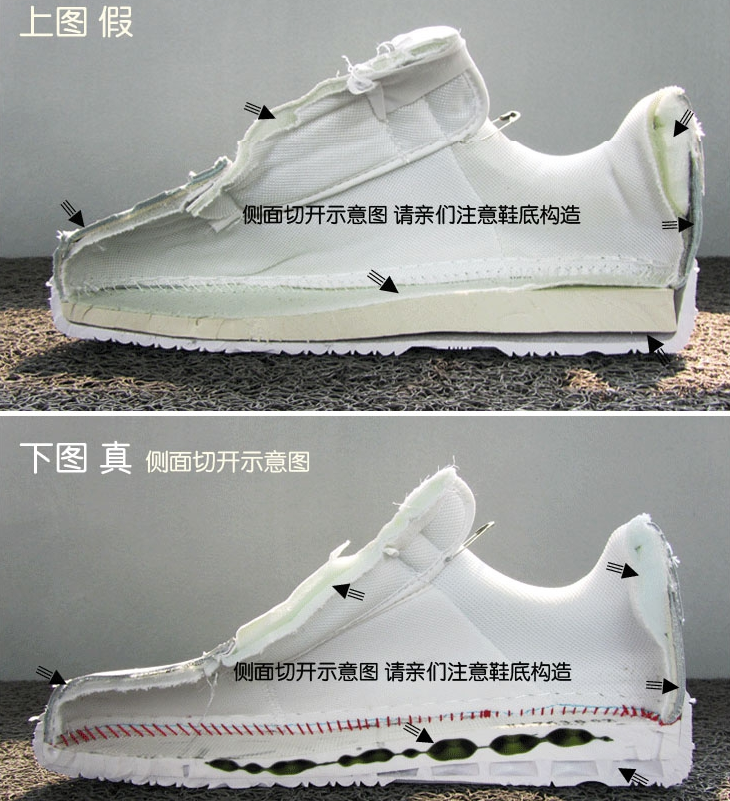 假版:鞋面材质采用二层人造合成革面发涩、死板、柔软性差,鞋舌后脚跟采用一般的棉,舒适度极差,鞋垫与鞋底中间这层不是气垫而是非常普通的塑胶垫,会造成鞋底硬,无减震功能,舒适度差,走路会加重双脚的负重力,引起脚累脚痛等症状。