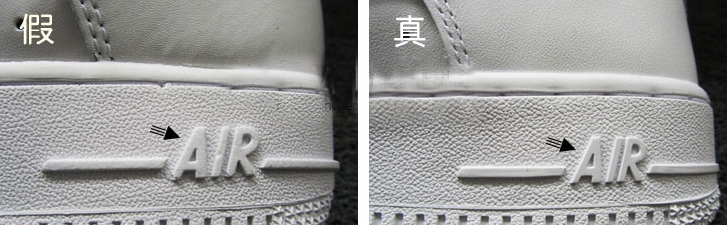 假版:鞋底AIR LOGO属劣质塑胶材质用料不足,做工非常粗糙,不精致。