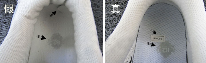 真版:余属鞋带扣采用铜块在高温下机器压印而成,做工精致不掉漆不褪色、不易老化。六、鞋垫LOGO的对比