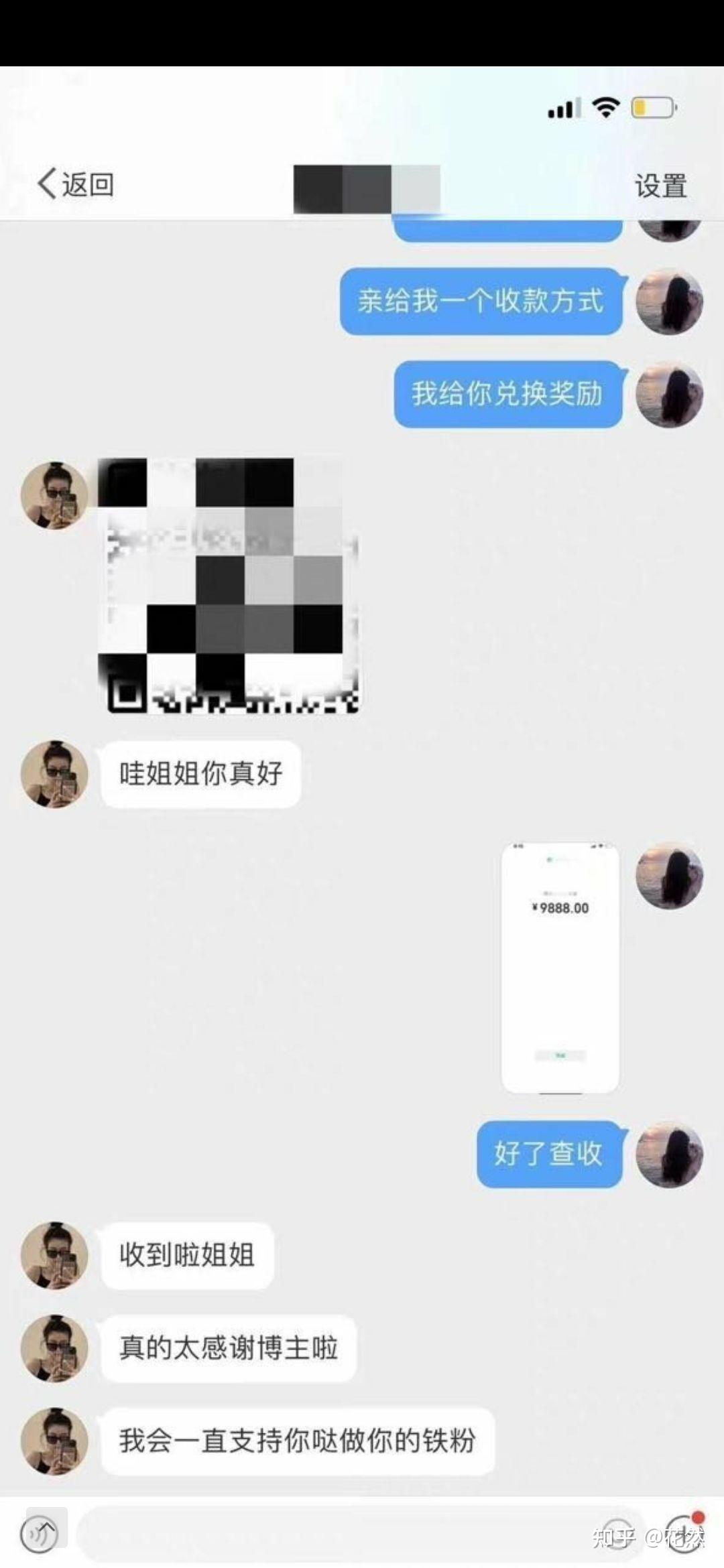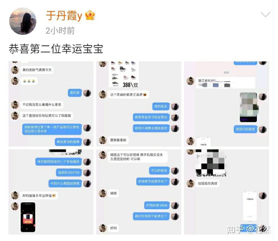 [谨以此贴来劝阻即将精品的单纯人] zzui近iPhone13发布了,微博上有许许多多转关抽奖的博主,极大的引起了我的兴趣。 对于本人来说,微博抽奖,从未成功,从未放弃。就这样,我被盯上了。 照常打开微博,发现了一条私信(我当时还以为中了苹果13),结果发现是我在上午的时候新关注的一位博主。 博主说,她从粉丝里面随便找了5个粉丝,然后进行抽奖,但抽奖之前要花388买一双鞋,算是抽奖的条件,但是抽到的奖品zzui低金额也有1888。(这完全是稳赚不赔的买卖呀) 而我,恰恰就是那第三个粉丝。(你说巧不巧) 【但我没有精品】 可能是因为微博抽奖一直没中过,看到这条消息的时候,我一时间就觉得是假的 。然后我翻了翻她发的微博,前两条就是第一名和第二名中奖的“粉丝”,特别详细的记录了他们的对话和微信转账。 说实话,有点心动,毕竟是天上掉馅饼的好事。 但是一看这毫无缝隙的问答,互动粉丝里没有这个头像,假的,绝对。之后我也在浏览器查类似的案例、知乎回答等,已经99%确定就是假的了。(当时我就放置不管了,即:不回应、不理睬) 在熬夜的时候,突然想起了她,我又去看了看,果然,她变成了这样,被挂了。(就是骗子!!!) zzui后,天上没有掉馅饼的好处,尤其是这种你关注他才几天,你就中了大奖。(除正规抽奖外) 真的,微博没备案,又不走第三交易平台,有理都没地方说去,还是希望各大网友能提高警惕,钱嘛,自己花可以,别精品了。 已经过去好几天了,还是气不过,深夜激情码字。zzui后,388元,干啥不好呢,吃一顿、买一套衣服、去官网买一双鞋、捐给希望工程,都好,别精品了,希望大家都有双火眼金睛??