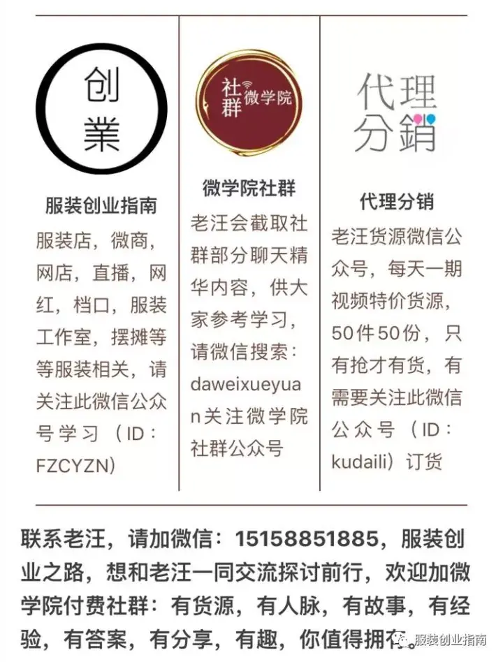 其实分别也没有这么可怕。65万个小时后,当我们氧化成风,就能变成同一杯啤精品上两朵相邻的泡沫,就能变成同一盏路灯下两粒依偎的尘埃。宇宙中的原子并不会湮灭,而我们,也终究会在一起。 ——尼古拉斯.老汪 关于价格,我可以保证同等的质量价格肯定我更便宜!因为我的鞋子都是直接在厂家拿货,好货源所以价格实惠,我完全可以卖更高的价格,但是我想多交些朋友,积攒口碑,让他们认可我,在他们收到货的时候可以感叹这么好的质量价钱绝对超值! 接下来我还是想开一家实体店,让线下与线上结合。做线上的同时也注重与线下客户的需求。 目前为止我已经收获了一大批死忠粉,她们对我的认可都是从收到鞋子的那一刻起,所以,欢迎大家关注我,跟楠哥做朋友。 我就是我,我是楠哥(卖女鞋的少妇) 老汪点评: 本文的重点总结一句:社会我楠哥,人狠话不多,要鞋子货源的,直接扫码关注她吧,绝对性价比高。 我楠哥速度还是很快的,进群两三天功夫,就把文章写好了,看来加老汪微学院群,免费公众号推广一次,这个还是很吸引人的。 人生想要获得成功,必须忍得住孤独,尤其是在服装创业之初,很多时候为了达成目标,可能别人在休息时,我们还一个人在默默无闻地付出,这种过程是非常孤独的,但如果能挺得过去,我们将会比别人取得更大的成功。 为了生活、为了工作、为了事业,往往很多时候我们都不能陪在亲人朋友的身边,而是必须占用很多的休息时间和与家人团聚的时间。我们是否能够耐得住这种寂寞? 人生道路并非一帆风顺,一路上难免会有很多坎坷、泪水、痛苦。痛苦之后往往会有两种结果:一是萎靡不振;二是更加强大,我们在经历了痛苦之后,究竟是萎靡不振,还是更加强大?取决于我们是否能挺得住痛苦。 没压力就会没动力,大家都知道这个简单的道理,但是很多人却在遇到压力时选择了逃避和放弃。只有当我们摆正心态,坦然地面对压力时,才会给我们的成长和发展注入无限动力。 做人做事必须坚守自己的理想和原则。只要我们所坚守的是正确的事情,哪怕会有短暂的痛苦,也应该坚持下去;如果我们所做的是错误的事情,哪怕会得到短暂的快乐,也应该坚决拒之! 生活中处处都会存在着各种各样的诱惑,如果定力不强,这些诱惑会随时影响并阻碍着我们前进的步伐,甚至会让自己迷失前进的方向,陷入短暂利益的漩窝中,在种种诱惑面前,我们要一如继往地坚持自己正确的原则和理想。老汪自己也要反省,要不是被女色所惑,老汪现在的成绩,应该跟马云差不多了。 服装之路,像楠哥开店一样,每一次的失败、每一次的泪水和汗水总是在不断地折腾着我们,因此让我们的发展道路充满荆棘。但经过无数次的折腾才会让我们从中深刻地体会到创业的真谛,我们试问自己能一而再、再而三地经得起折腾吗?当经历无数次的折腾后,我们还能坚持吗? 当面对他人一次又一次的冷嘲热讽,当面对客户对我们一次又一次的打击时,我们能经受得起吗?我们是否还能保持zzui初的激情,同时坚守自己的目标?我们是否还能保持不下降指标,而是持续不断地增加措施? 在市场开发中,当客户毫不客气地让我们“滚”时,我们会保持一种什么样的心态呢?我们是继续争取,还是马上灰溜溜地离开而从此不再争取面谈?无论是个人还是集体,不在打击中成长,就在打击中消亡! 面子是自己给自己的,不是别人给的。害怕丢面子会让自己丢一辈子的面子,害怕失败会失败一辈子,害怕丢面子往往带来的结果是打肿脸充胖子,会让自己更加痛苦,从而丢掉更大的面子,让自己陷入一种恶性循环。我是你们的老汪,我把服装生意领悟到的真谛告诉你,希望对你有用。