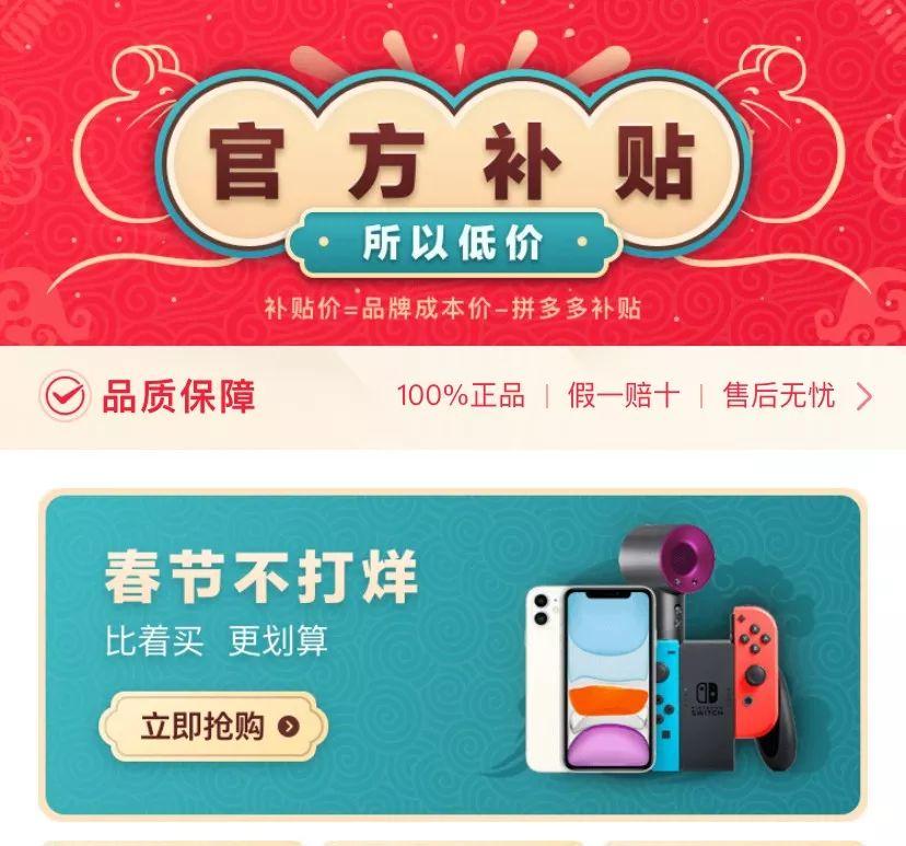 这可怎么办?有一个笨办法,加入购物车,静待鞋款掉价。可是看着心水的鞋款却不能买,难免会心痒难耐。 这一次,Rookie君再一次带上链接,让哥几个可以简单粗精凭夫到便宜的球鞋。譬如这双黑曜石北卡蓝AJ1,二级市场的价格在2700元左右,潮鞋馆的黄金码比这还要低二百; 又比如这双Air Jordan 1 兔八哥,2000块的市场价,被拼多多直接砍掉三百元; 还有更多好价球鞋,譬如上回Rookie君参加百亿补贴活动,309元淘到了这双李宁闪击,性价比与颜值齐具。值得一提的是,这些优惠,并非像以前那样定时调价,而是长期性的补贴。 为什么Rookie君一再推荐?因为这一次,拼多多百亿补贴推出了“多多潮鞋馆”,在这里,咱们尽情挑选自己喜欢的潮鞋,既保正,又便宜。“多多潮鞋馆”,将随着百亿补贴活动,一直持续为消费者放送福利,所以哥几个可以在里边逛逛,慢慢挑选,不必再急赶慢赶拼手速。 买鞋,选拼多多就对了!▼ ▼ ▼ 有球迷该问了,这么便宜的球鞋,不会是莆田货吧?Rookie君表示,说拼多多不稳,那都是以前的刻板印象了!zzui近拼多多打假打得特别厉害,您要是真能在上边买到假货,那可真是赚到了。他们联合中国人财保险,购物时附送每一位消费者正品险,假一赔十,并且支持鉴定。 那么问题又来了,卖家不会低于市场价卖鞋,拼多多怎么能卖这么便宜? 说白了,赔本挣吆喝呗。拼多多百亿补贴,顾名思义,砸出整整一百个亿,参与百亿补贴计划的商品,会在成本价的基础上补贴5%-50%,做一道简单的公式——商品的销售价格=成本价-补贴金额。 也就是说,参与拼多多百亿补贴的商品,一定低于市场价。还有网泳坟地去翻了拼多多的财报,自打百亿补贴活动上线以来,拼多多亏了21.2亿,这是真金白银的拿钱往外砸。 其实早前,拼多多百亿补贴这个活动,Rookie君已经推荐过许多次,很多粉丝也在他们的平台上,买到了自己的心水的鞋款。拼多多百亿补贴让众多用户逐渐对拼多多改观。虽然拼多多已经为“百亿补贴”注册了商标,但并不能阻止其他电商平台同样打出了“百亿补贴”的标语。 拼多多百亿补贴与其他平台zzui大的区别是,不限时,不限购,更不用精品券拼手速,从拼多多第一次举办百亿补贴活动至今,这个活动已经持续二百多天,未来,还将继续为消费者带来优惠。 点下方小程序进入百亿补贴主会场▼ ▼ ▼ 参与拼多多百亿补贴活动时,Rookie君还发现,拼多多上线了一项特别有意思的系统——“防黄牛系统”。寻思着拼多多也不希望自己花钱打价格,让黄牛捡了便宜,但这系统貌似很容易误伤友军啊!!据说已经有粉丝被系统当做黄牛误伤,所以强烈建议哥几个,没事在上边多逛逛薅羊毛,精品精品存在感,要不然被当做黄牛关进小黑屋,岂不是尴尬了? 补贴计划的范围很广,包括手机数码、家电生活、食品饮料、母婴用品、运动户外、洗护纸品、精品海淘、家纺家装、汽车用品、居家日用等,近乎包括了咱们日常能接触到的所有,Rookie君前段时间,还在上边入手一双鞋,一个kindle,价格相当美好,安全下车。 百亿补贴中还上线了春节不打烊区域,专区内的商品春节正常发货。 有兴趣不妨点击下方链接,了解更多补贴商品,一起薅拼多多羊毛吧! 速戳下方阅读原文,体验百亿福利