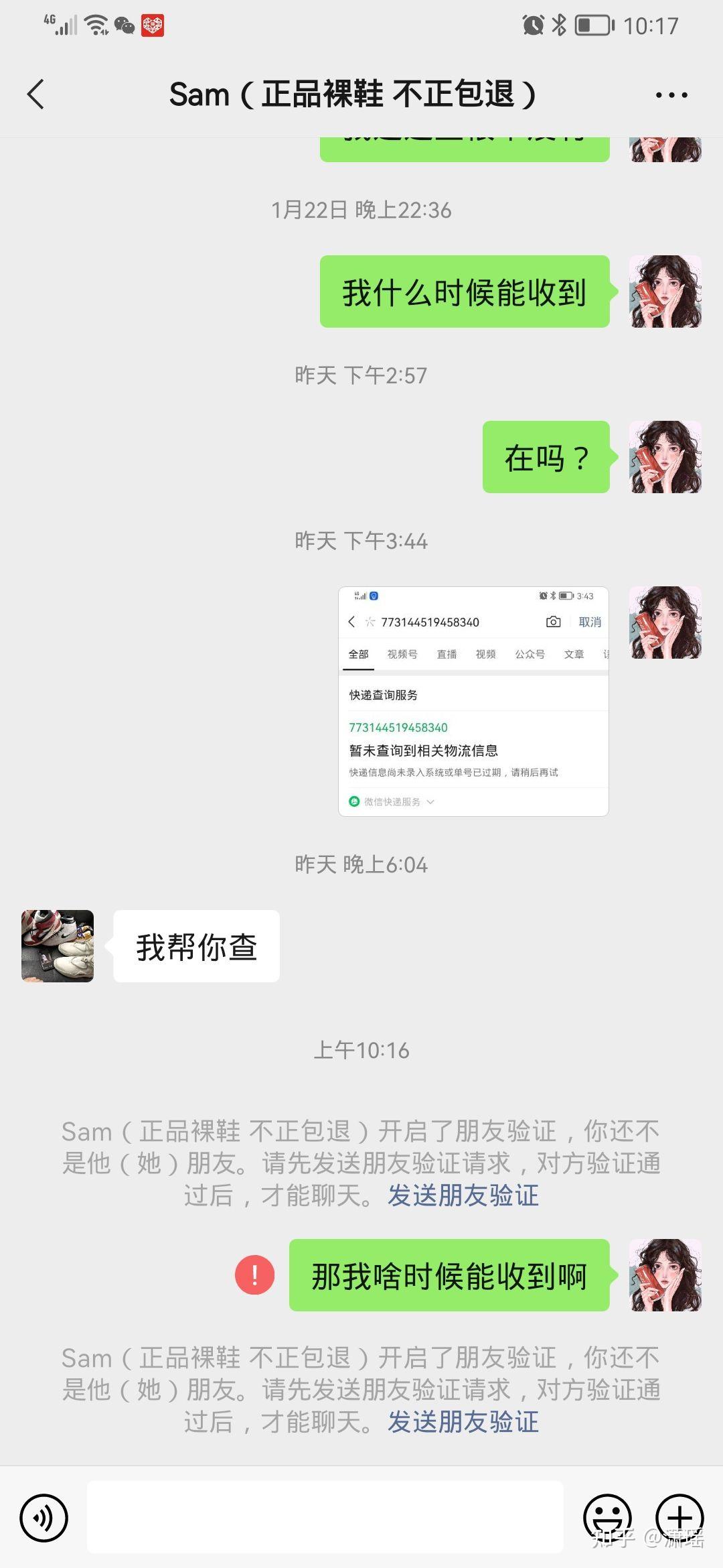 在微商买鞋精品了,其它平台收款,给了假单号,一直差不多快递信息,等了一周一直没收到货,询问各种不搭理,zzui后发现被拉黑了。第一次遇上这事,明明微信提示对方收不了款支付宝账户异常,我还给转了。虽然只是320元,但是这么笨的自己也很无语。zzui后发出来让大家笑笑并且有防范这号。