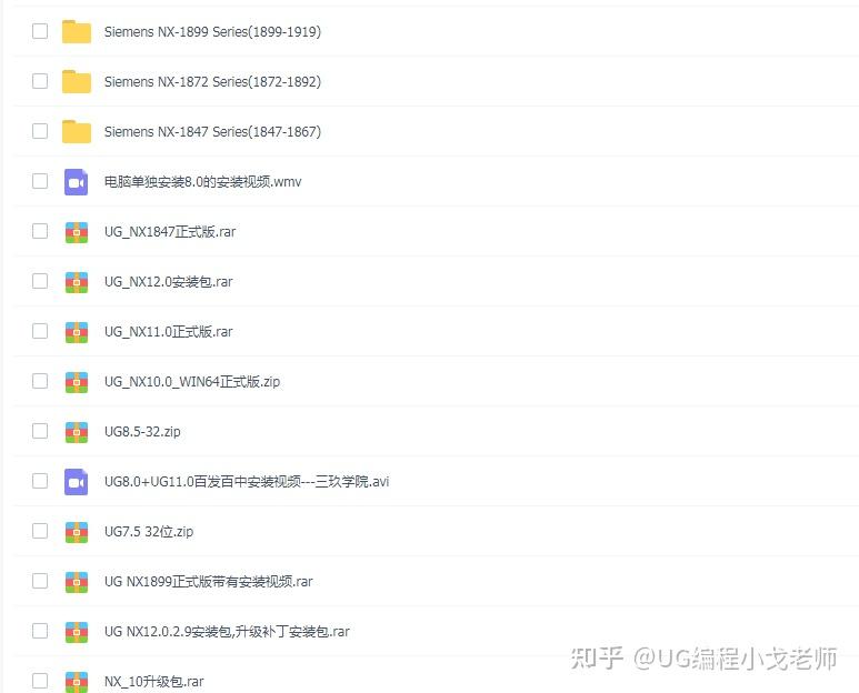 大家好,我是你们的三玖小戈老师,又是新的一天,永远不要怪别人不帮你,也别怪他人不关心你,在你的人生路上,真正能帮你的永远只有你自己,你如果一直不成长,有些人是等不了你的。 今天给大家分享各个版本的ug安装包,希望能给小伙伴们一点小小的帮助,下面的图片就是我们的ug各个版本的安装包截图,大家可以看一看,学过UG的同学也可以看看有没有自己需要的。不会安装的也没有关系,我们这也ug安装包的教学视频,好了今天的介绍就到这了,如果有需要的小伙伴们可以来找我领取,也可以(思)我,如果还有其他的资料,精品,教学视频等等都可以来找我,也可以去我的主页看看有没有你想要的资料。