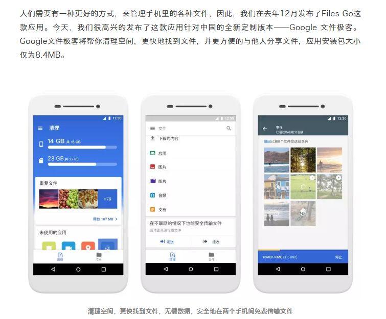 今天世超想和差友们聊聊的就是这款谷歌亲生的文件管理 App 在中国的表现。 值得一提的是, App 还有一个类似苹果 AirDrop 的功能。两台安装了 App 的手机可以在完全没有网的情况下,通过蓝牙快速高效的批量传输文件。 并且文件传输的过程完全是加密、快速( 速度曾达到 488 Mbps )并且免费的。 综合来说,国内的这个 Google 文件极客和海外版的 Files Go 基本一模一样。主打轻、快的思路也如出一辙, Google 文件极客的应用安装包大小仅为 8.4 MB,该有的功能却一个不缺。 麻雀虽小,五脏俱全,可能是形容它zzui贴切的词汇了。 目前它已经上架了百度、华为、腾讯和小米的应用商店。或者差友们可以长按识别下面的二维码下载~ “ 亲儿子,就是好用 ”