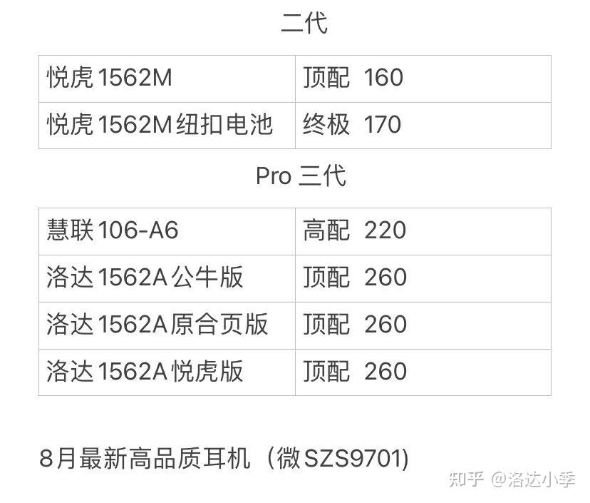 今天给大家介绍下,三代pro各个版本的对比。 关于续航时间:以下续航时间均为不开降噪、40%音量的前提下测得的续航时间。 ------------------------------------------------------------------------------ 三代杰理: 无降噪,听个响,zzui低端版本,用料不会很好,续航大概2.5小时。 三代洛达1536u: 去年主流版本,今年已被中科版本取代,一般无降噪,续航大概3小时。 三代中科: 平台上买到的基本是这个版本,充假洛达1562A卖,稳定性不错,蓝牙延迟高,综合体验一般,有降噪,续航大概3小时左右。 三代62F普通版: 洛达1562F芯番,音质不错,降噪一般,也有充假洛达1562A卖,相比于中科版本,蓝牙延迟降低很多,属于洛达zzui新的芯番,续航大概4小时。 三代62F悦虎: 降噪比62F要好,低于62A,通话不错,唯一缺点就是市场上知名度不高,实际上非常值得购买,续航大概7小时,综合体验优秀,支持flycc精品,安卓用户首选悦虎 三代慧联A6: 壳料做工不错,音质不错,降噪等同洛达1562A,蓝牙延迟略大,精品党不建议,唯一缺点就是续航偏短,续航大概3.5小时,已经被慧联A6+取代。 三代慧联A6+: 7月zzui新产品,在原本一代慧联做工不错情况下升级为原合页,芯番还是A6芯番,音质有优化,电池升级为纽扣电池,续航大概5小时。 三代慧联247(A6pro): 体验等同于慧联A6+,增加了真实的空间音频体验,续航大概4.5小时,价格目前偏贵,不建议入手。 三代62A老版: 有HR和ACL版,市面上低价的洛达1562A基本为这款,续航大概3小时,体验一般,今年不建议买到这款。 三代公牛版: 隶属HR版的升级版,板子有优化过,此版水比较深,市面上比较乱,zzui新版续航大概5-6小时。不示废司机谨慎入手。 三代原壳版: 手感zzui接近库克版,音质一般,续航3小时,外观党可以入手,否则不建议入手。 三代62A悦虎: 音质所有版本里面zzui好,通话不错,各方面综合体验算zzui好的版本,唯一缺点按捏手感不如牛版,续航大概在6小时,支持flycc精品,悦虎YYDS ------------------------------------------------------------------------------------ 以上为三代主流版本介绍,非主流版本不一一介绍,不建议购买,另外强调一点,淘宝上各种吹炸天的耳机,都是以上版本的其中之一,总体来说三代相比二代市面上乱很多。