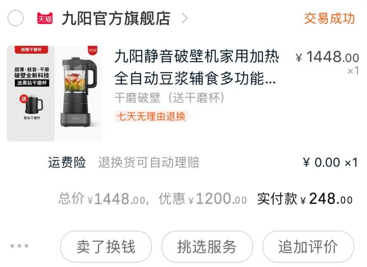 九阳破壁机,跟优惠券叠加后,实际付款248