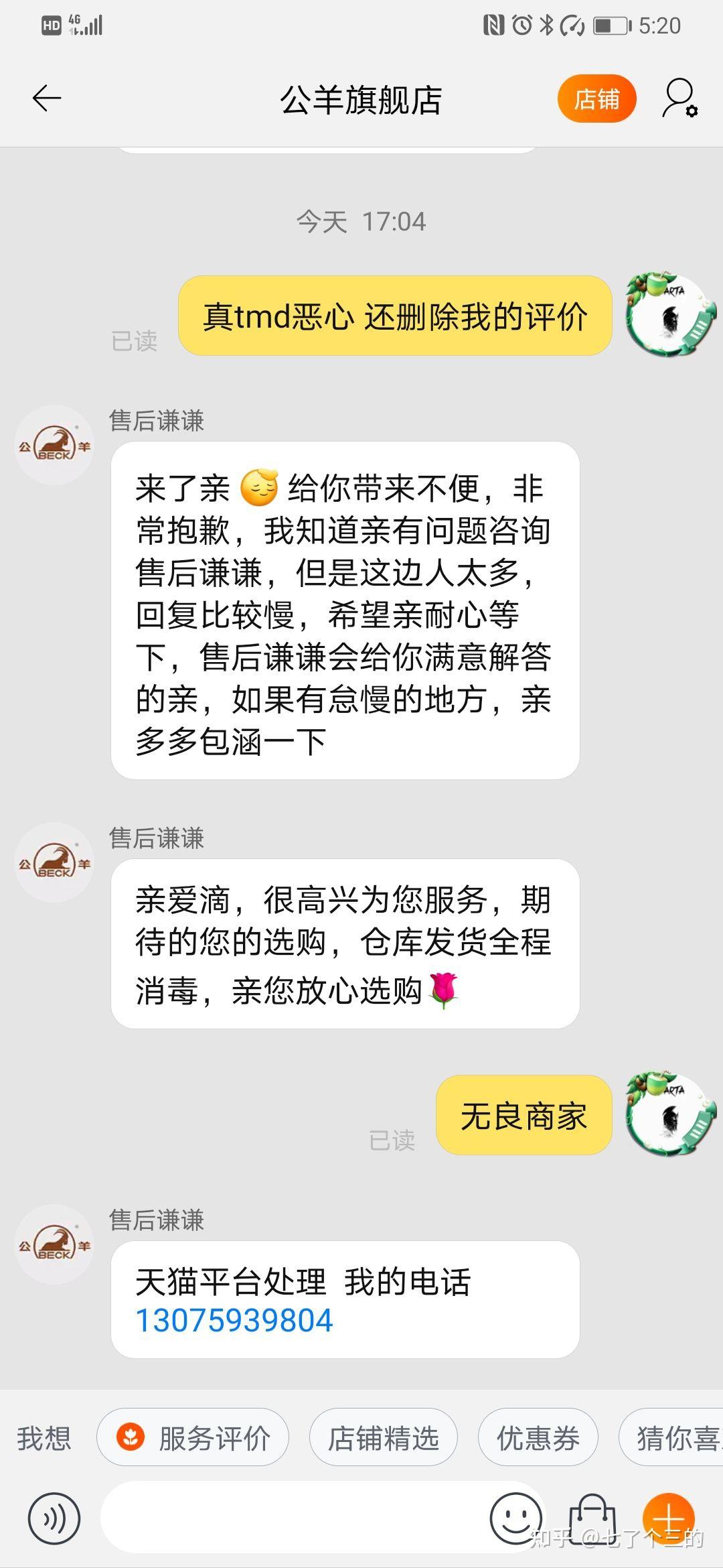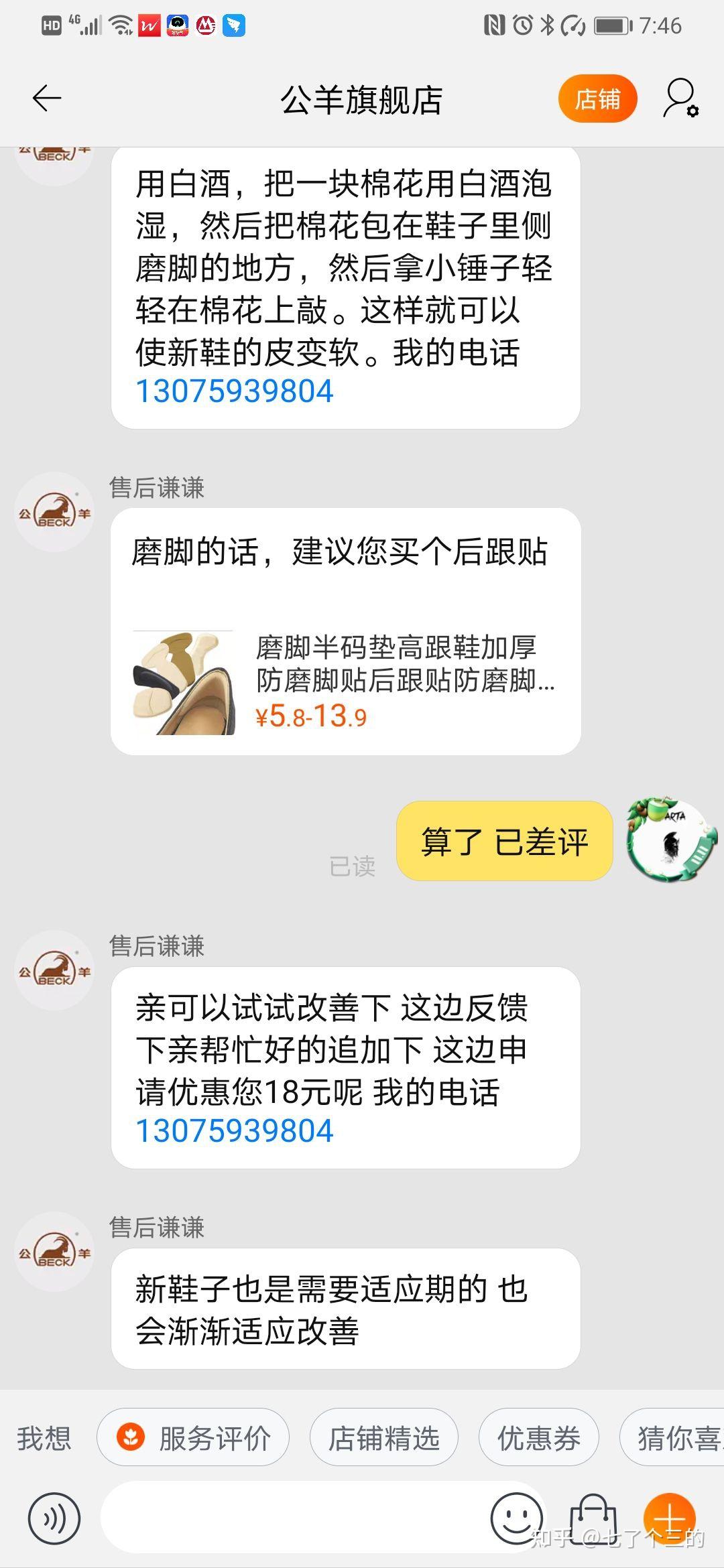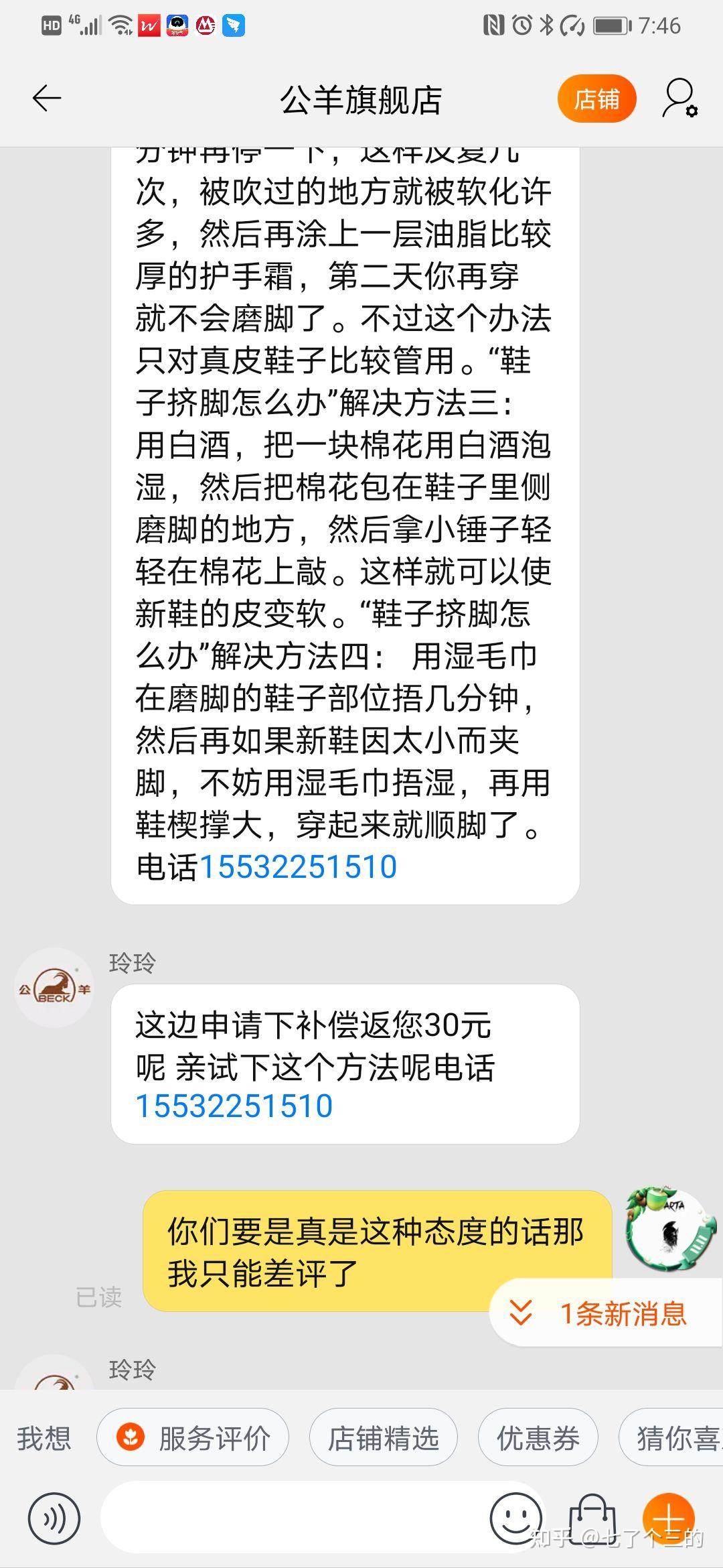 前段时间在天猫 公羊旗舰店买了一双鞋子,试穿的时候没感觉到什么,除了稍微有点大还能接受,但是但是,穿了一天下来,左脚被磨的严重,差点出血,本人两只脚绝对没问题,之前在网上很多鞋子了,都没出现问题。 出现这种情况后联系卖家协商,总结下来卖家的观点是: 1:鞋子你穿过了,不能退换; 2:鞋子有问题他们人,但是没有退换,只赔偿,30元, 鞋子差不多300快,不能穿只赔偿30。 3:按照他们的说的去自己动手改造鞋子,凑合着穿吧; 于是差评,神奇的事情出现了,后台竟然把我的差评给删除了,再追加评价也看不到了,于是生气的骂了一句 无良商家,人家的售后直接回复,找天猫平台处理,并且附上了电话,我tnmd,真郁闷的一次购物。