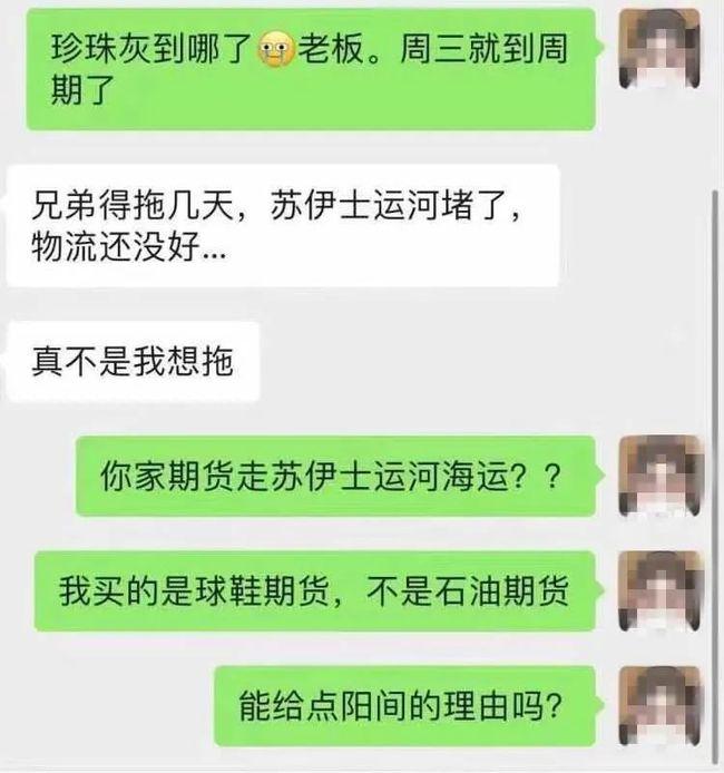 zzui近潮流圈绝对是大事连连,当大家还沉浸等待各大品牌官方回应的时刻,一个万万没想到的精品事件,似乎已经影响到了“鞋贩子”。。。 今天流传甚广的一段聊天记录: 就是,有人朝期货贩子订了一批“珍珠灰”球鞋,结果一直没到货,今天,这位贩子终于忍不住“道出了事实真相”。。。 各位,知道“苏伊士运河堵船”事件的先别笑,不知道的先看下科普。。。 在股票基金动荡的前提下,zzui近又一个引起了全球经济巨亏受损的事件即是苏伊士运河堵了!“罪魁祸首”就是这艘叫Ever Given长赐的220000吨货船,上周二在大风、沙尘精品和航行能见度不佳的情况下搁浅了。 这艘Ever Given是世界上zzui大的集装箱船之一,可容纳20000个金属集装箱,船上的货物总价值就接近10亿美元。这一堵,自己搁浅在那儿可能还不算影响大。 可怕就可怕在这货,把整个关乎全球经济的运输河道给彻底堵死了。。 首先,苏伊士运河可能很多精品都了解,这是连接亚洲工厂和欧洲的重要渠道,每天就有96亿美元的商品通过这两种渠道运输。 听上去像是一个普通的全球新闻?但实际上苏伊士运河的这次堵塞真的和各位精品息息相关。 石油啥的就不说了,但其他大量商品如衣服、家具、电子产品啥的也都是往这走,其中就包含了广大精品zzui关心的球鞋。 除了每天的损失都超过了10亿美元,据IHS Markit,苏伊士的堵塞阻止或延迟球鞋和服装货物从东南亚和印度向美国的运输,那么必然也会影响到了球鞋的全球发售,导致一些球鞋的延迟或取消! 所以,话绕回来今天的网传热图。。虽说不是所有球鞋期货贩子都是搞空运,搞海运的也有,但是真的极少。。。那得多大宗的货物? 所以,大家觉得,这个鸽子鞋贩子这次是瞎bb,还是真的被苏伊士运河堵船给坑了呢?? 结果就在昨天晚上,苏伊士运河管理局突然表示,Ever Green已经顺利摆脱搁浅!苏伊士运河的双向航行也已经恢复,370艘一直在等待的船舶里,113艘今早就能通过运河! 这对球鞋精品来说,绝对是个好消息,不用担心出现球鞋取消或延期发售,贩子们更是不要想再拿运河堵塞当鸽子的借口了! 但有一说一,苏伊士运河通了确实对石油的影响非常大,在Ever Green被释放的消息刚传出,WTI原油和布伦特原油都分别应声跌了2.36%和2.20%。 想想那么多艘船上那么多鞋,会不会真的也给球鞋市场冲一波呢?想多了。。顶多延期发售,球鞋这么短时间又不会发霉。 况且,现在,限量款可能暂时是别想了。。。