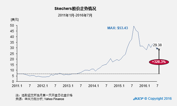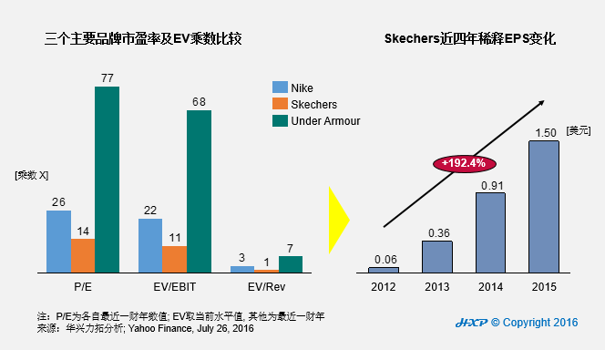 1. 从纽交所的黑马说开去 2015年7月,中国国内A股市值在三周内蒸发15万亿元,上证指数下跌30%,股灾记忆尚存。如果将视角平移至此时的美国东海岸,纽约证券交易所却有一只股票表现亮眼,它就是Skechers。 去年7月,Skechers(纽交所:SKX)股价zzui高曾达53.43美元,相较于2011年,超出近7倍。即便从去年年中至当前持续回落,但现股价相较于2011年初也增长逾300%。 美国消费品市调公司NPD去年曾发布运动鞋市场份额数据,Skechers成为美国仅次于Nike的第二大运动鞋品牌商,市场份额超过5%。当然,Nike的霸主地位还是非常巩固的,拥有62%的份额,此外UnderArmour尽管仅有约3%的份额,但同样被外界看好。 因此,我们可以从资本市场的视角对比一下当前这三家公司的状况。如下图,Under Armour具有三者之间zzui高的市盈率,达到77倍,而耐克的市盈率也接近Skechers的一倍,至26倍;如果从EV乘数来看,Skechers也是zzui低的,EV/Rev接近于一(实际1.2x)。 而从稀释EPS来看,Skechers近四年也有接近200%的复合平均增长。再结合Skechers在 2015财年销售收入已突破30亿美元,5年内复合年均增长率(CAGR) 达到18.3%等因素,应该说Skechers在资本市场的短期市值被低估了,未来结合其成长前景,其将持续成为运动鞋行业在纽交所的黑马。 那么,Skechers究竟为何能做到如此成功? 2. 一位拥有业界终身成就奖的传奇CEO 2015年,作为Skechers CEO的Robert Greenberg获得了Manolo Blahnik终身成就奖。该奖项由拥有70余年历史的业内zzui具权威性的鞋履媒体 “Footwear News” 颁发,Robert Greenberg是继奢侈鞋履设计师Manolo Blahnik、现任第一夫人钟爱的Stuat Weitzman、传奇设计师Vince Camuto之后,获得该奖项的全美第四人。在业内得到极高肯定的Robert Greenberg到底拥有怎样的传奇经历? RobertGreenberg生于商业家庭,父亲在零售行业从商,受其濡染亦颇具商业头脑。其年少时进入美发行业,先后拥有Talk of the Town, Wig Bazaar,Wigs’n Things, Europa Group, Europa Hair等多个业务. 1977年成为Removatron投资者,1979年成为Roller Skates of America拥有者。 1983年成立了大名鼎鼎的L.A.Gear品牌,1992年创立Skechers,在整个世界经济低迷的大环境下,7年时间即成功登陆纽交所,过去近20年时间将Skechers打造成为仅次于Nike的北美运动鞋品牌。Robert Greenberg作为创始人,将其开挂经历也注入了对Skechers的打磨中。 塑造其传奇经历很重要的一点即Robert Greenberg对于时尚的把握和创造能力。从名声大噪的L.A.Gear开始,Greenberg的时尚嗅觉就大放光彩。当上世纪80年代Reebok(锐步)在有氧运动鞋引领风尚时,他借鉴其时尚元素加以改造成为L.A.Gear旗下的产品,并且用丰富的SKU对产品线进行扩充,比如一款产品高达12种色号。 塑造时尚,Robert Greenberg同时长于打造品牌,善于营销传播。Greenberg在电影E.T.中让其鞋履出境而大卖,得以获资本创立L.A.Gear。随后,其让“雷鸟”穿着L.A.Gear不同颜色的鞋子出现在订货会上就曾轰动一时。 流行音乐之王Michael Jackson生前唯一代言的鞋就是一款银色L.A.Gear的鞋子,RobertGreenberg的营销能力可见一斑。1992年Greenberg离开L.A.Gear,由Doc Marten鞋履分销商变为Skechers创始人之一,其产品快速借鉴Doc Marten大热元素,迎合当时一反花哨而崇尚简洁的口味,并结合当时zzui热的流行趋势而大获成功。 3. Greenberg怎样玩转Skechers营销? 尽管Robert Greenberg本人颇为善于营销造势,但在规模化发展过程中,事实上Skechers的营销投入在行业内甚至算是保守的。如下图,劲敌Nike与Under Armour几乎非常一致的保持了10%上下的广告/收入比,而Skechers即使广告费近三年有26%的复合平均增长,但实际广告/收入比却只有约6%,近两年比2013年还有略微下降,由此可见其广告驱动销售的效率还是比较高的。 虽然广告投入占比(相对于收入规模)在业内不算高,Skechers应该算得上善于投入的每一美元。且不论早期签约Britney Jean Spears成为其全球代言人,加速其品牌在全球的曝光度(2000年初)。 近几年为了吸引美国年轻消费群(特别是90后)的关注,Skechers并没有选择美国流行音乐的品质女歌手做形象代言人,如Taylor Swift或“水果姐姐”KatyPerry等大咖,而是签约了唱红《Let it go》(电影《冰雪奇缘》主题曲)的流行歌手DemiLovato等为其休闲鞋履品牌代言(合约期:2015-2017年)。92年出生的Lovato从小就出演过多部迪士尼的影视作品,同时不到18岁时就拿过美国Billboard公告牌榜冠军,形象健康与富有活力,无疑是影响年轻消费一代的“高性价比”的女艺人。 当然,由于Skechers的产品线比较广,其明星代言策略因此采取了非常丰富的组合。如2014年邀请前总统Clinton参加Skechers全球年度大会;在专业运动领域,赞助美国奥林匹克马拉松奖牌获得者Meb Keflezighi等,签约高尔夫球运动员Belen Mozo以推广其专业运动风格系列如GOGOLF等。 值得一提的是,Skechers也非常注意在Facebook, Twitter, Instagram, Pinterest,Snapchat甚至微博等社交平台掀起紧密的客户互动。在创造大热单品和把握消费者新的消费趋势上,很好地利用了影视剧和社交营销传播的效应。例如,2013年年底至2014年年初韩剧《来自星星的你》大火之时,Skechers对男主角金秀贤所穿D’lites黑白熊猫鞋进行造势使其成为当季大热单品。 2015年,Skechers签约Meghan Trainor加入“斯凯奇全球活动”,青年超级偶像的加入触及了更多年轻消费客群,其中Meghan Trainor在个人社交主页发布的一条Skechers商业广告达到了13万点赞数量,并显著带动了Skechers鞋销售。 4. 另辟蹊