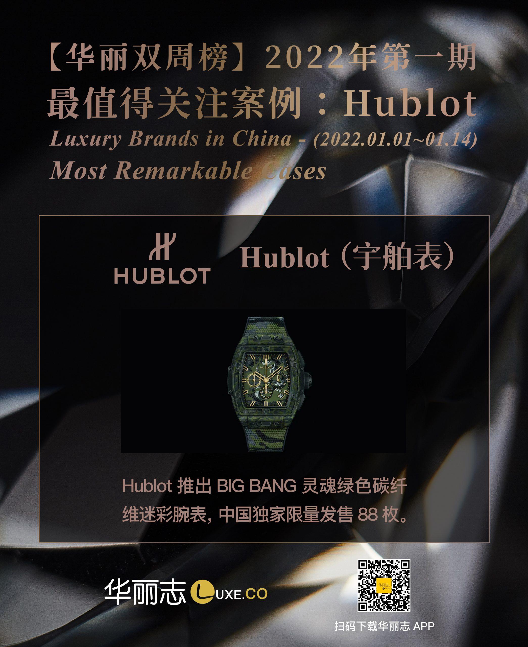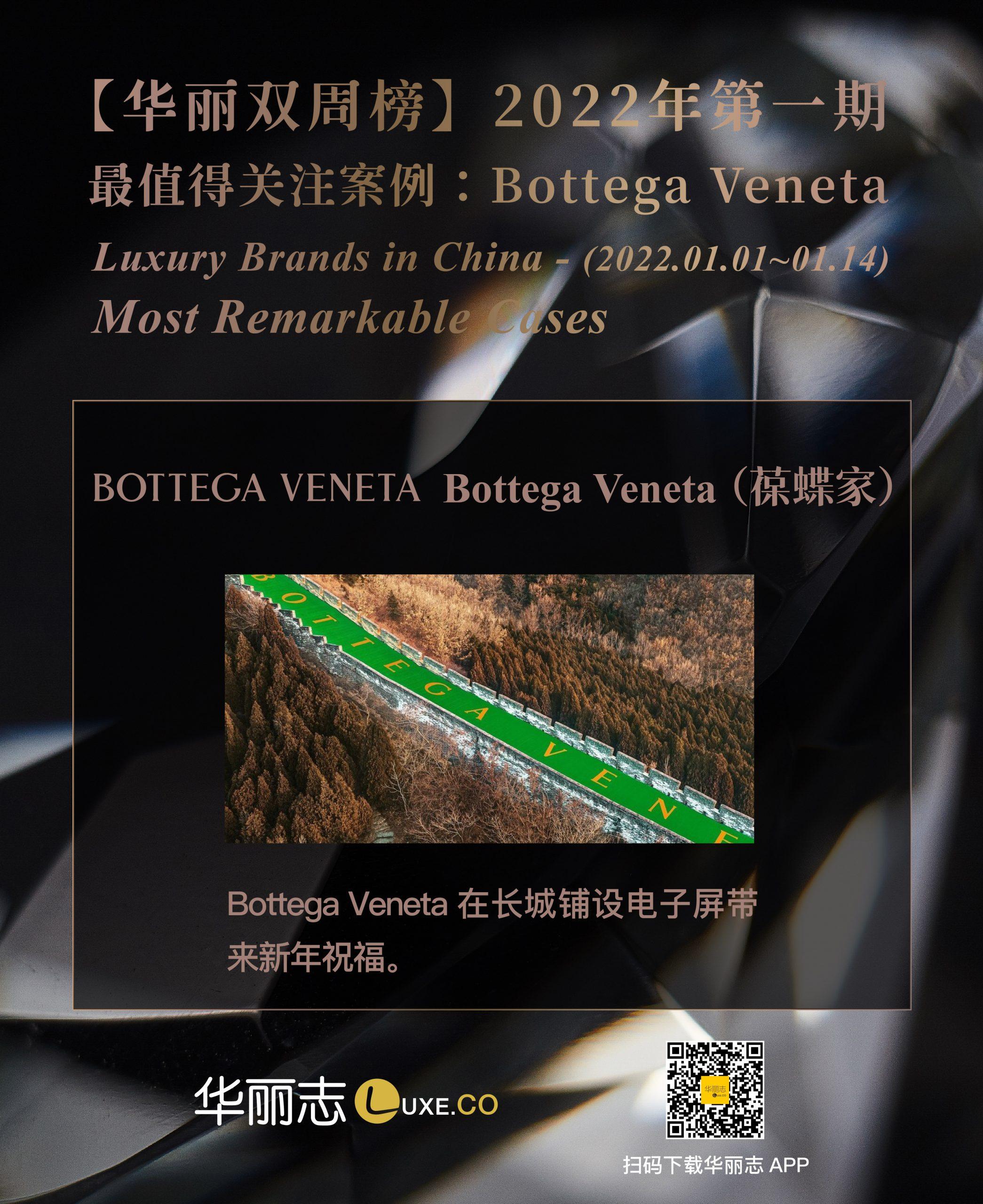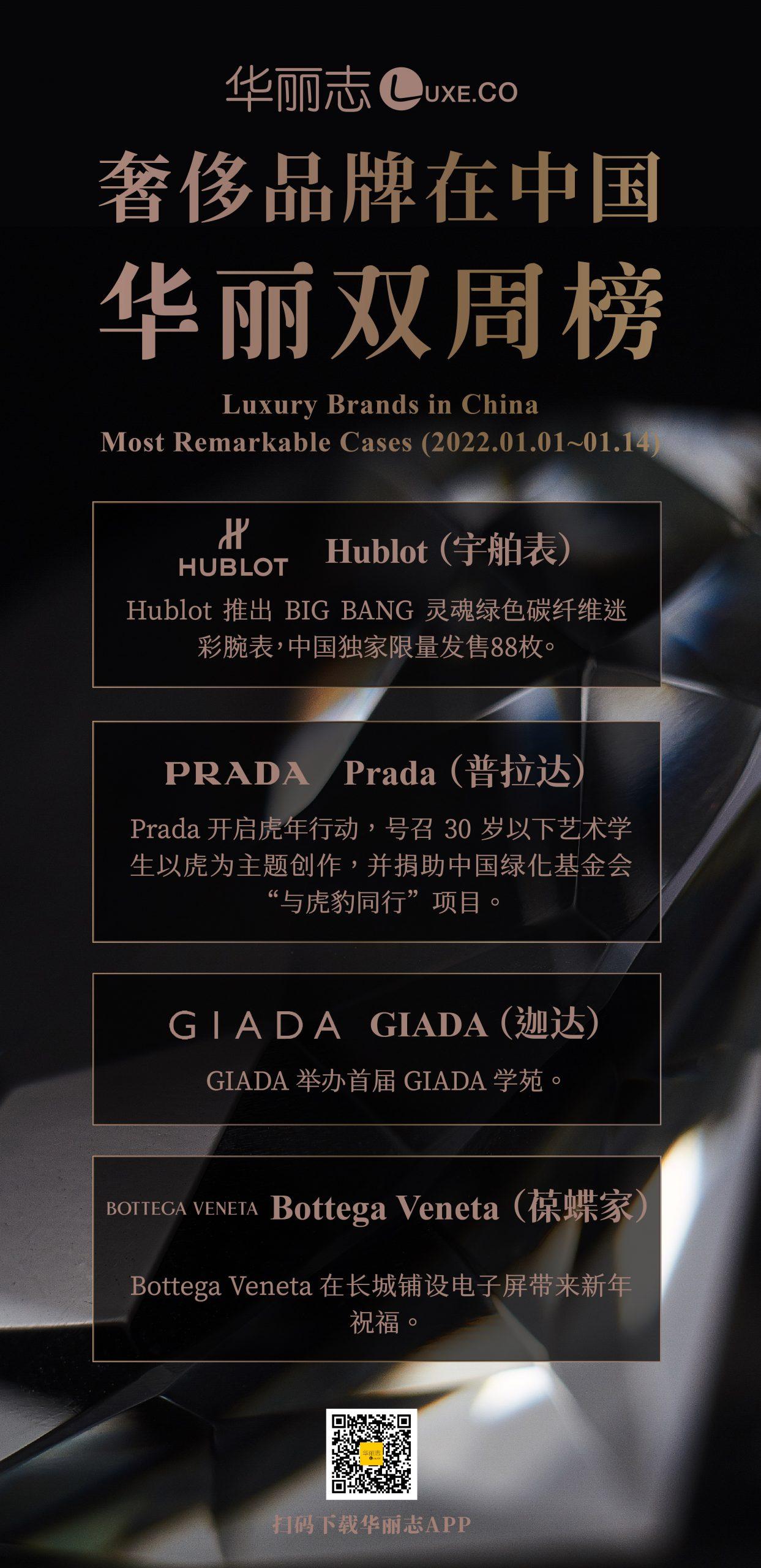 2022年1月1日 – 1月14日,【华丽双周榜】共收录17条奢侈品牌在中国的营销动态、9条奢侈品牌在中国线下拓店的消息、23条奢侈品牌开设快闪店的消息、1条奢侈品牌在中国线上拓展的消息、3条奢侈品牌宣布中国艺人代言的消息,从中我们发现两大zzui新动向: 经“华丽评委会”甄选,以下四家品牌:瑞士奢华腕表品牌 Hublot(宇舶表)、意大利奢侈品牌 Prada(普拉达)、意大利奢侈品牌 GIADA(迦达)、意大利奢侈品牌 Bottega Veneta(葆蝶家)入选本汾【华丽双周榜】Top 案例榜单,并直接进入“华丽志 2022奢侈品牌创新营销年度大奖” 候选名单! 1)瑞士奢华腕表品牌 Hublot(宇舶表)再度创新性地将机械美学与卓越材质相融,并将迷彩奢潮元素注入其中,推出全新 BIG BANG 灵魂绿色碳纤维迷彩腕表,中国地区独家限量发售88枚。值得一提的是,这款腕表定价 22.27万元人民币,仅通过线上限量发售,再一次验证了硬奢数字化营销的可行性。 相关阅读:特写|一旦停止创新,就会沦为跟随者!宇舶表大中华区总经理接受《华丽志》独家专访 「兴」风精品已入境 点评:2021年1月举行的 LVMH钟表周期间,宇舶表首席执行官 Ricardo Guadalupe 曾向路透社披露,“中国内地市场已经成为品牌增长的主要动力”。 去年 Hublot 宇舶表相继在北京王府中环、上海前滩太古里、武汉恒隆广场开设专卖店,并于近日宣布张艺兴为品牌大使。宇舶表大中华区总经理 Loic Biver 向《华丽志》透露,宇舶表还将在海口、苏州、厦门和天津布局全新门店。 2)2022中国生肖虎年之际,意大利奢侈品牌 Prada(普拉达)开启虎年行动。一号行动为号召30岁以下中国乃至全球艺术院校学生,以虎为主题进行创作并投稿;二号行动为捐助中国绿化基金会“与虎豹同行”项目,以保护野生东北虎。 相关阅读:虎年行动 点评:截止1月20日,微博话题 #Prada 虎年行动# 收获了1.3亿的阅读量。中国农历新年是奢侈品牌的重要营销活动,除了以中国生肖为主题,Prada 还进一步支持了本土创意人才和濒危动物,多元的活动形式不仅呈现了品牌对当地文化完整性的理解,也有效拉近和本土消费者的 “心”。 3)意大利奢侈品牌 GIADA(迦达)在北京举办首届GIADA学苑,通过 GIADA Talks 主题分享、GIADA Workshops 体验工坊、GIADA Portraits 人文肖像以及 GIADA Cheers 私享晚宴四个板块,聚焦艺术美育与女性力量,深度探索女性的多元性。 相关阅读:第一届GIADA学苑 · 看过世界更懂美 点评:GIADA 在中国市场就艺术设计和生活方式领域的投入还包括:去年在北京中国大饭店正式开业旗下首家高仿意大利餐厅GIADA Garden迦达花园,GIADA Garden位于精品店三层,与大堂层的GIADA精品店相通,是北京唯一一个集奢侈女装零售与高仿餐饮为一体的生活方式品牌空间;在北京中国大饭店举办品牌首部艺术短片,“Art to Art”系列影片第一部“The Becoming of a Virtuoso: Claudio Silvestrin”首映礼。 4)为庆祝中国农历新年,意大利奢侈品牌 Bottega Veneta(葆蝶家)用标志性的 Bottega 绿色和鲜橙橘色为主色调,在长城铺设巨型电子显示妨带来新年祝福。 相关阅读:Bottega Veneta吉色贺新春 点评:没有跟随主流借鉴生肖元素与传统的红色,Bottega Veneta 选择在中国文明古迹长城为观众带来艺术装置,表达新春祝福,其策略极具差异化,也彰显了品牌对当地传统习俗的地道理解。同时 Bottega Veneta 已启动赞助山海关景区和角山长城的日常维护和翻新工作。 5)意大利奢侈品牌 Valentino (华伦天奴)与中国漫画家不二马大叔合作呈献虎年表情包。 6)为庆祝中国农历新年,瑞士奢华腕表品牌 Hublot(宇舶表)邀请中国新锐潮流艺术家 IKKY LIN 设计《虎虎生丰》新春图。 7)意大利奢侈品牌 Salvatore Ferragamo(菲拉格慕)邀请中国艺术家孙原、彭禹创作以生肖虎为主角的印花图案 ,该图案运用在了菲拉格慕2022中国新年特别胶囊系列中。 8)法国奢侈品牌 Balmain(巴尔曼)与时尚博主、插画师季未燃合作推出福字、老虎窗花等春节礼包。 9)为庆祝中国农历新年,瑞士高级珠宝和腕表品牌 PIAGET(伯爵)推出新春定制春联,大众可在品牌官方微信号预约,线下到店获取。 10)在英国奢侈品牌 Burberry(博柏利)于上海打造的“交融边界”展览中,中国视觉艺术家 Shane Fu 打造了一个大型数码互动装置,以裸眼 3D 的方式,焕新 TB 专属标识。 11)英国奢侈品牌 Burberry(博柏利)邀请中国金属艺术家陈英泽铸造艺术作品《当局》。 12)英国奢侈品牌 Burberry(博柏利)邀请中国玻璃艺术家杜蒙,为品牌创作中国象棋艺术作品《我能和你下盘棋吗?》。 13)为宣传全新 DIOR VIBE 运动系列,法国奢侈品牌 Dior(迪奥)特邀中国击剑奥运冠军孙一文、冲浪运动员刘丹、艺术体操运动元张豆豆带来 DIOR VIBE 型动课堂,介绍以热身运动、有氧核心及器械力量为主题的主题运动。 14)法国奢侈品牌 Lanvin(浪凡)与三亚亚特兰蒂斯精品店合作开设限时咖啡厅。 15)意大利奢侈品牌 Marni(曼黎怡)携手成都博舍精品店推出虎年限定新春双人下午茶套餐。 16)意大利奢侈品品牌 Moncler(盟可睐)与潮玩品牌 POPMART 泡泡玛特共同推出 MEGA珍藏系列 1000% SPACE MOLLY × MONCLER,本次联名全球限量2000体。 17)法国奢侈品牌 Lanvin(浪凡)与时尚博主包先生合作情人节限量款迷你手袋,该手袋的设计灵感源于品牌经典PENCIL手袋,全球限量155只,每款自带限量编码1-155。 1)德国奢华运动品牌 BOGNER(博格纳)在上海恒隆广场开设精品店。 2)高仿中式
