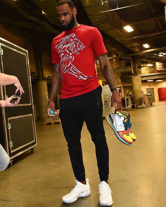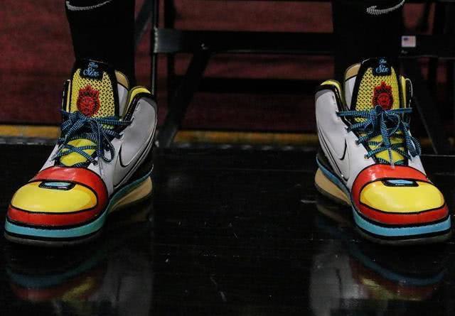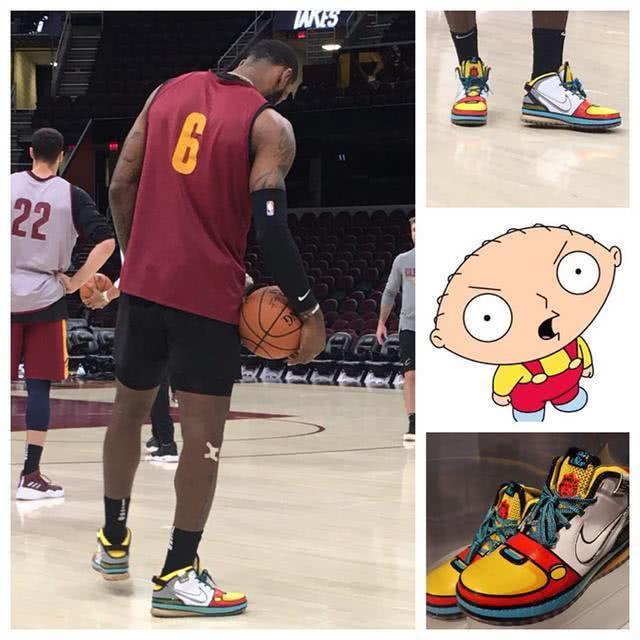 这双鞋价值超 20 万!詹姆斯上脚 LeBron 6 “Stewie” PE。 在总决赛 G3 前的球队训练中,詹姆斯上脚一双老鞋 Nike Zoom LeBron 6 “Stewie” PE。 以动画片 Family Guy 中角色 Stewie Griffen 为灵感,以红、黄、白、蓝等颜色装扮,鞋面线条以黑色勾勒,塑造动画般的视觉效果,可以说是二次元风格球鞋的鼻祖了。 这款 LeBron 6 “Stewie” PE 目前价值超 20 万 RMB,足见其稀有,期待它有朝一日能够复刻回归。