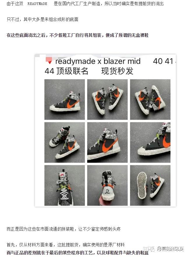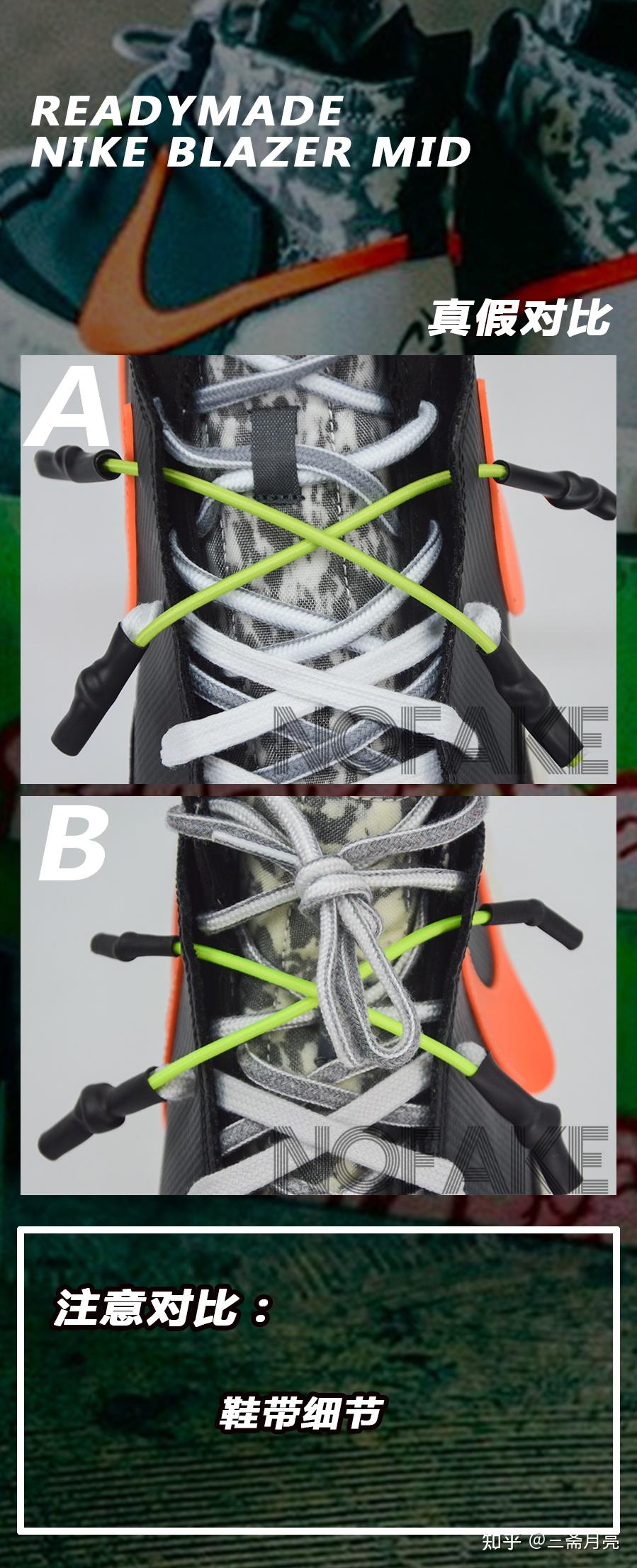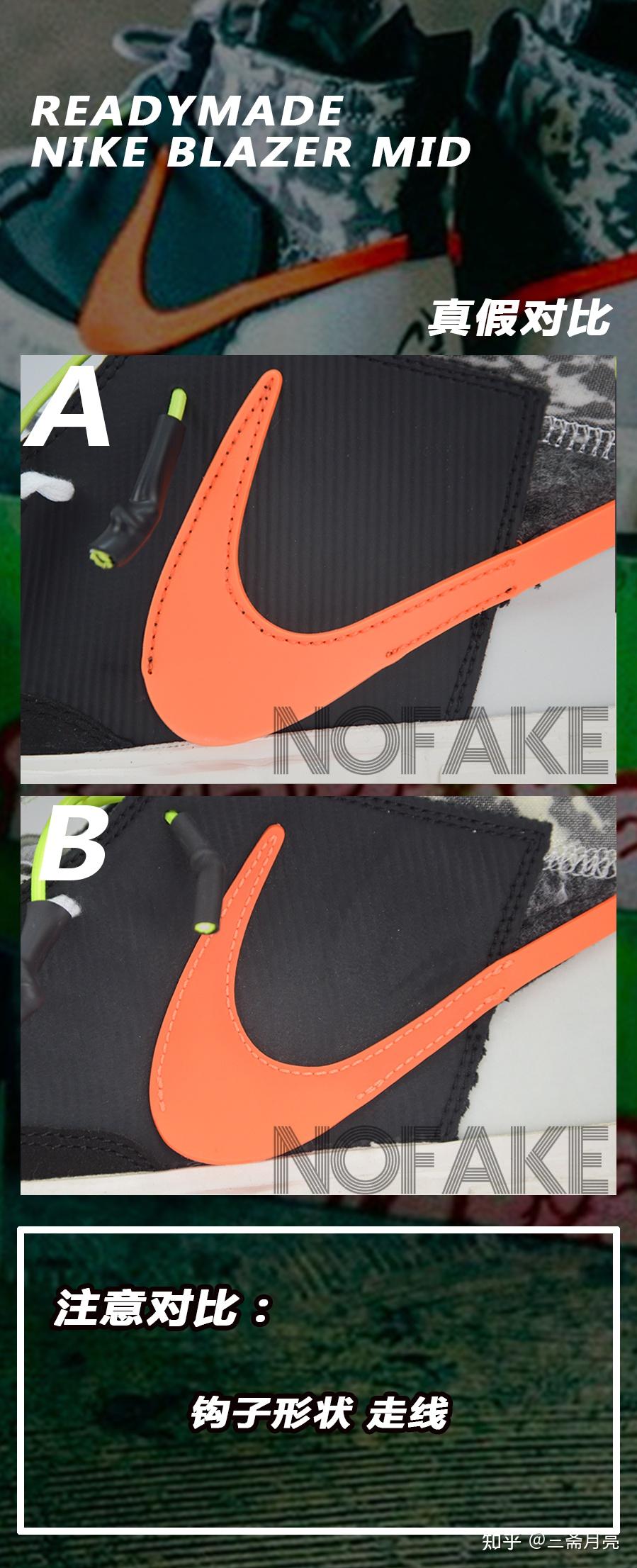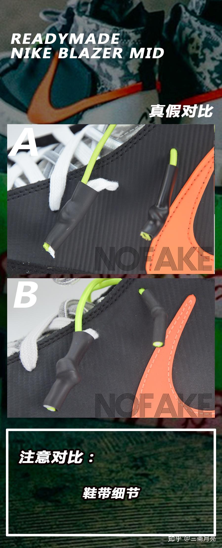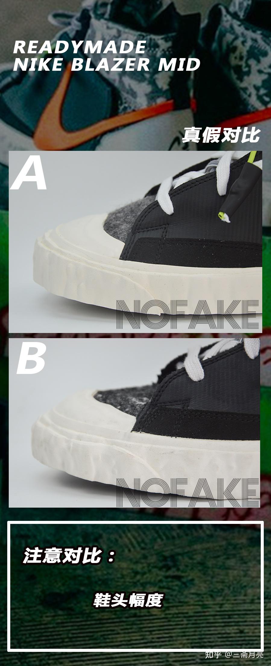 月亮(windrealns)3月中旬在「 READYMADE」刚刚发售时就写了军事机能READYMADE联名nike开拓者是东方文化崛起的象征?螺旋钩子让价格精品涨 实拍细节全网首发这篇文章,当时上了几个版本的实拍,放到今天来看也是裸鞋级别的。 READYMADE x NIKE BLAZER 很多朋友留言还是有很大的疑问,对这双热度颇高,但是又很小众的鞋款依然有非常大的热情。那么今天月亮(windrealns)就趁着老朋友的测评,给大家看一下具体的细节对比,以便更多的平台买家、二手买家、代购买家去对比自己手中的鞋子,避免损失。今天我们换个思路,用两双非正品来看一看,大家顺便可以翻翻上次的文章,看里面的鞋子那双是错误版A为fake,B为所谓组装裸鞋在原贴对比的留言里,很多中签的真鞋拥有者也是分不清B版本 接下来看月亮(windrealns)的 大家先自行对比一下,月亮的实拍和B类似 说到鞋型,月亮(windrealns)自己也对比了白得的,大家可以看看 继续看 特别是鞋底,这个回收材料的中底是一眼就能分辨 对比在这里 在这里我们先说一下,所谓组装裸鞋,其实并不存在,有些朋友对这些“裸鞋”还是有误解! 就像截图文章中说的“提前货”确实是有的,但是这些鞋子并不是以底面和裁片的形式流出!所谓“提前货”示焚方为了宣传,将成品鞋子送给明星穿着造势、大媒体拍摄宣传、团队公关、主理人自用人情等原因,这类鞋子非常的少,普通消费者几乎是不可能有机会入手的,更不会有大批量流入市场的情况! 像裸鞋圈每次提前释出的版本均为某些团队自主协议下单,以全包的形式下放至裸鞋圈,然后造势形成所谓的“无盒正品”裸鞋,高价出售。 大家可以先来看看你们所说的原厂底面和裁片 这些都是月亮(windrealns)给大家拿到的大厂裁片 大底、鞋带、围条、港宝等等 这是板鞋的围条,裁片在鞋楦上拼接完成后,粘上大底,然后就用围条包裹 后跟裁片 原厂回收材料大底,其实都是本地做的 原供应商的鞋带 后跟裁片 海绵组件 鞋帮大理石纹裁片 内里裁片 对勾组件 鞋舌织唛 鞋面大理石纹裁片 内里海绵及中衬组件 当然还有白色的各种裁片 那么接下来,我们就来看看,A为fake,B为所谓组装裸鞋的详细细节对比 一、鞋头对比 鞋面材质和鞋头形状很明显不同,包括鞋面鞋舌跟走线,A为单条,B为双条 月亮(windrealns)的,鞋面材质花白较多,鞋头包裹整齐 ,过渡明显 看这张,鞋头会有不规则的流状体纹路,这个不是瑕疵,就是风格所在 当然月亮也有自己的对比,大家可以看一下鞋头的,提前zp已经被肢解 二、鞋头侧面对比 A的过于平整,没有那种流体的纹路感而且鞋面材质都不同 月亮(windrealns)的,流体感很明显,鞋头幅度也正确 三、鞋带孔面裁片形状及走线 月亮的,裁片形状和走线细节完美一致 四、大对勾细节 月亮的,这个走线为白色,对比A那是一眼不同啊,钩子的弧度也注意一下。其实还有钩子下的黑色面料,也是不同的 五、短鞋带细节 看月亮的 六、鞋口面料材质 看一下月亮(windrealns)的 大理石纹路正确、走现整齐,关于色差问题,其实新鞋不发黄才是正确的。经过氧化后都会发黄的 七、后跟提拉对比 月亮的,鞋口很收,走线整齐 八、后跟logo对比 月亮的、钩子比例比较大,下面字体粗 月亮的对比大家看下 八、鞋带细节 这次的鞋带比较复杂,有两部分组成 月亮的 九、鞋舌织唛 月亮的,颜色是偏红的 看一下月亮的对比 反面自行对比下 十一、中底细节 月亮(windrealns)的,淡绿色 走线也看下 十一、鞋垫材质及精品胶 月亮(windrealns)的 ,对比了这么多,大家应该对你手中的鞋子有一个大概的了解了八。 后面白色的版本细节也给大家发一下吧 鞋盒呢也是升级了全做旧的原盒 鞋衬纸 钢印 防潮贴 来自日本的军事服装品牌「READYMADE」,日本设计师细川雄太肯定也是对目前的各种所谓流出鞋、提前款、裸鞋都头大至极! 对了各位朋友肯定说现在的情况月亮你还来测评Nike吗?? 月亮(windrealns)微微一笑: 文章所述所拍,均为国产!