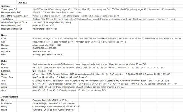 今日拳头的首席设计师Mark Yetter在社交媒体上公布了10.5版本的改动内容,并表示该数据非常接近zzui终版本,但仍然可能会有所改动。 巨型九头蛇 普攻对你的首要目标造成5+(+1% zzui大生命值)的额外物理伤害并对锥形范围内的次要目标造成40+(2.5%zzui大生命值)>>>普攻对你的首要目标造成5+(+1.5% zzui大生命值)的额外物理伤害并对锥形范围内的次要目标造成40+(3%zzui大生命值) 贪欲九头蛇 生命偷取:12%>>>18% 唯一主动-新月:范围由400提高到450 破败王者之刃 近战普攻命中时造成目标8%>>>12%目标额外生命值的额外物理伤害 窃法之刃及幽魂镰刀系列 当有友军在附近时才可触发 疾行之靴 价格900金币>>>1000金币 轻灵之靴 移动速度55>>>60 防御塔镀层 每层镀成赏金从120增加到160 远程英雄对防御塔造成的伤害会减少20% 附近每有一名敌方英雄为防御塔增长的抗性35>>>45 削弱 山隐之焰 奥恩 活体锻炉(被动) 工匠大师: 能给自己升级装备的等级12>>>13 能给队友升级装备的等级13>>>14 腕豪 瑟提 基础护甲:37>>>33 基础生命值回复:1.6>>>1.4 生命值回复成长:0.15>>>0.1 叹为观止(R) 减速效果的持续时间:1.5秒>>>1秒 披甲龙龟 拉莫斯 基础攻速:0.656>>>0.625 殇之木乃伊 阿木木 木乃伊之咒(R) 冷却时间:130/115/100秒>>>150/125/100秒 蒸汽机器人 布里茨 基础护甲:40>>>37 星界游神 巴德 旅者的召唤(被动) 每5个调和之音提供的基础伤害:15>>>12 增强 影流之镰 凯隐 暗裔魔镰(被动) [移除]灵魂掉落量在0/8/12分钟时会提高 [新增]灵魂掉落量会持续提高(效果提高约3%) 利刃纵贯(W) 减速效果:60%>>>70% 法外狂徒 格雷福斯 基础魔抗:30>>>32 魔抗成长:1>>>1.25 穷途末路(Q) 法力值消耗:60/65/70/75/80>>>全等级60 冷却时间:13/12/11/10/9秒>>>12/11/10/9/8秒 冰霜女巫 丽桑卓 寒冰碎片(Q) AP加成:0.7>>>0.8 万花通灵 妮蔻 成长攻速:3>>>3.5 攻速收益:0.645>>>0.6875 两生花影(W) 被动: 基础伤害:50/70/90/110/130>>>50/75/100/125/150 缠结倒刺(E) AP加成:0.4>>>0.6 怒放(R) 基础护盾值:50/80/110>>>75/100/125 护盾值AP加成:0.5>>>0.75 卡牌大师 崔斯特 选牌(W) 蓝牌的AP加成:0.5>>>0.9 红牌的AP加成:0.5>>>0.7 战争女神 希维尔 回旋之刃(Q) 基础伤害:35/55/75/95/115>>>35/50/65/80/95 总AD加成:0.7/0.8/0.9/1/1.1>>>0.7/0.85/1/1.15/1.3 狩猎(R) 主动: 加速效果的zzui小值:全等级20%>>>20/25/30% 虚空之女 卡莎 艾卡西亚精品雨(Q) AP加成:0.4>>>0.25 活体武器: 弹体数:10>>>12 虚空索敌(W) 基础伤害:20/45/70/95/120>>>30/55/80/105/130 总AD加成:1.5>>>1.3 AP加成:0.6>>>0.7 活体武器: 冷却时间返还:50%>>>70% 牛头酋长 阿利斯塔 基础生命值:575>>>600 胜利怒吼(被动) [移除]在触发该技能的3秒内,阿利斯塔无法获得胜利层数 琴瑟仙女 婢啡 基础伤害:45>>>49 成长AD:2>>>3 E技能自我加速效果:10%/11%/12%/13%/14%>>>20% 打野英雄 诺克萨斯之手 德莱厄斯 出血(被动) 对野怪的伤害:125%>>>175% 铁铠冥魂 莫德凯撒 幽冥起兮(被动) 对野怪的zzui大伤害:25-120>>>28-164 圣锤之毅 波比 圣锤猛击(Q) 目标zzui大生命值百分比伤害对非英雄单位的zzui大伤害:40/60/80/100/120>>>50/77.5/105/132.5/160 复仇焰魂 布兰德 改动推迟至10.6版本