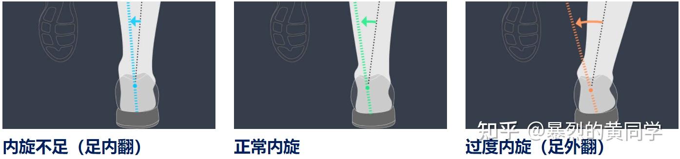 全足着地时: 当进行运动,脚踝与脚后跟产生倾斜,力量向内侧偏移,过度向内旋转,脚跟外部与地面的角度过大,导致体重偏移至足部内缘而非前脚掌。