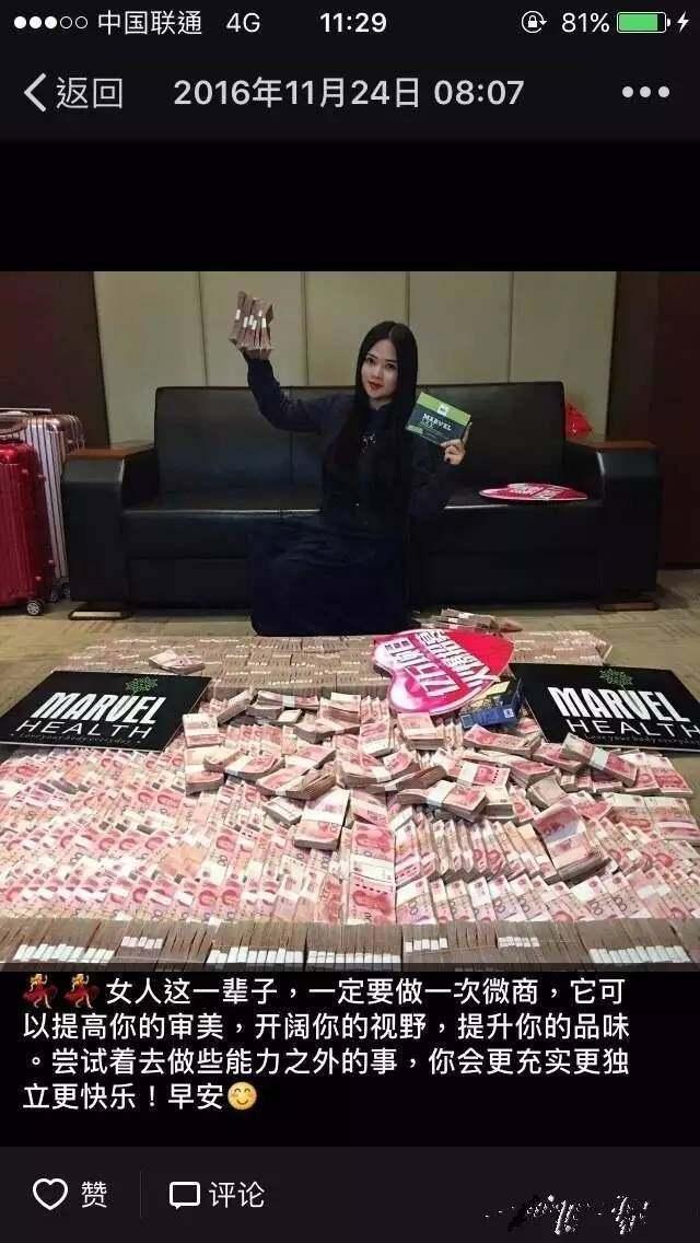 微商是移动互联网发展的一个产物,也是时代进步的必要阶段,其实做微商没什么,靠本事赚钱坦荡荡,但是涉及到虚假宣传就是道德问题了。 今天给大家分享一些让你脑洞大开的朋友圈广告。 先让我笑一会, 典型1 装逼炫富,这个是微商里zzui常用的一个手段,话说是不是跟淘宝卖家精品单,线下骗局请托一样吸引那些想创业的人。 典型2:牛皮大过天,尼玛,总瘤不见了,起死回生,我看你是该吃精品了,你这不是卖东西,你是考别人智商呢! 典型3:百万富翁套现1000元!! 有人说微商有很多骗子,其实骗子一直都存在,任何行业都存在骗子,微商里骗子全是从其他渠道过来的,本身就是骗子,即使不用微信,不做微商,也也会在其他渠道进行进骗,不是有了微商才有骗子,微信只是骗子使用的工具而已,在没有微商时也存在大量骗子。说说你见到那些考验智商或者好玩的朋友圈信息,在下留言。