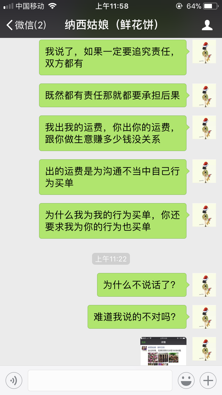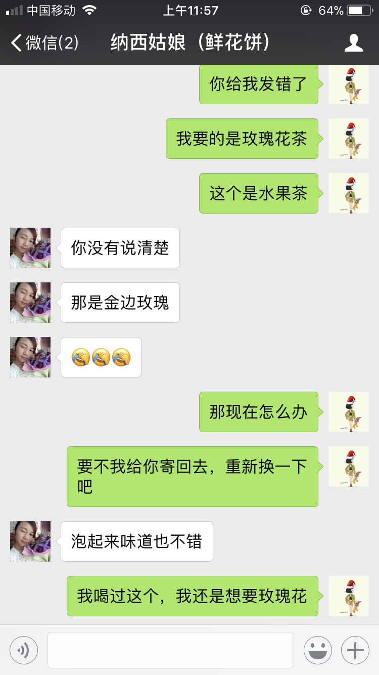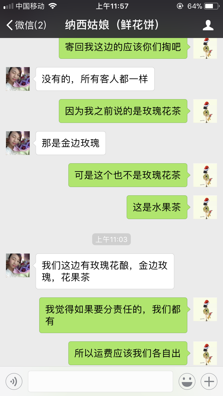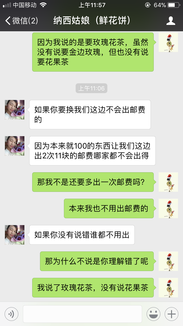 所以我觉得这个卖家对自己的产品根本不了解!如果一定要抠字眼,我虽然没有说要金边玫瑰,但是我也没有要花果茶,我要的是玫瑰花茶!但她一直强调是我说错了,真是无语,她从来不承认是自己也理解错了!她说如果要换,就必须让我出邮费,就是我邮寄到丽江的邮费我出,她从丽江发货的邮费也要我付?试问哪里有这样的道理?如果真的有责任,也是双方都有责任,她从来都不承认自己的错误也不愿意承担责任!后来直接出言不逊,让我退货,还说她11块的邮费就当吃早点了。实话说我当然愿意退货,但是这样的人品,我真的很怀疑我给她退货了,她不给我退钱怎么办?这个时候我终于意识到微信上买东西真的有风险。我给她退货后,她把我微信删除拉黑,不给我退钱怎么办?我对她的所有信息也就只有一个微信而已……在与这个人沟通的过程中,我发现这个人真的非常自私,只看到了11块钱的邮费,连一个人做人zzui基本的道德和人格都没有了!自私,不讲道理口口声声说自己什么十年老店,我真是怀疑。诚信经营都做不到,对自己的产品也不了解!在她后续发的朋友圈里,说古法黑糖有各种口味,而我买三罐根本都没有问我要什么口味