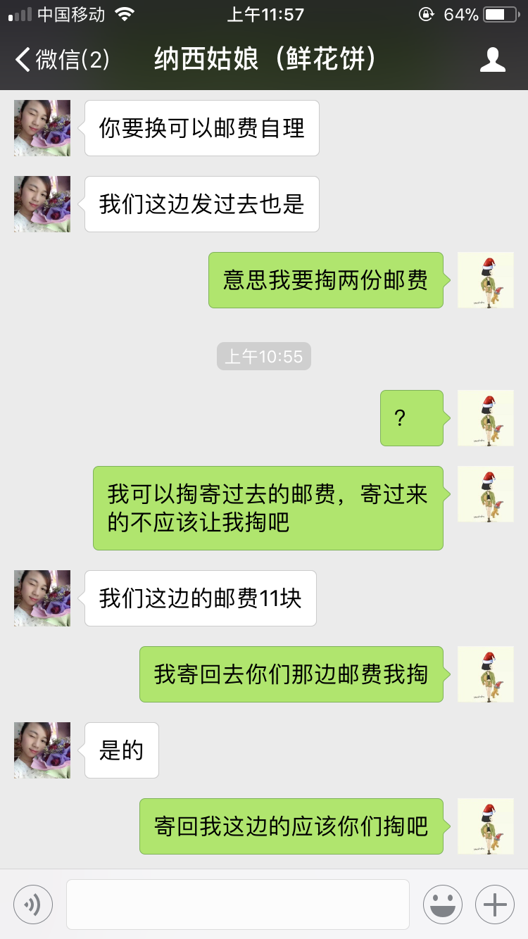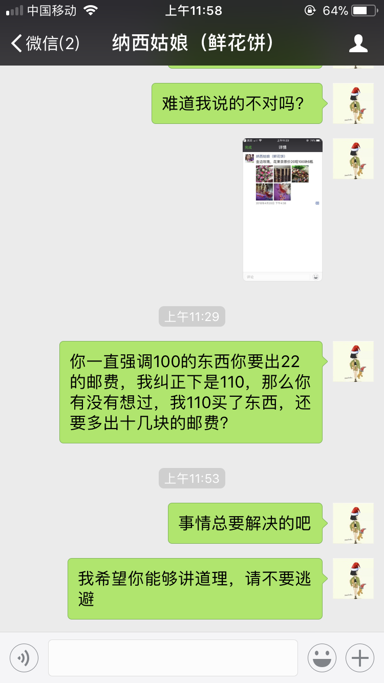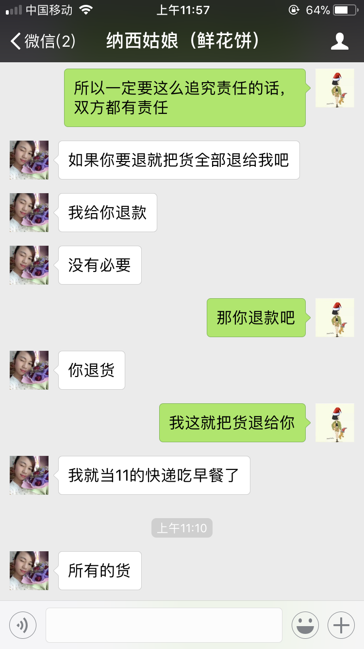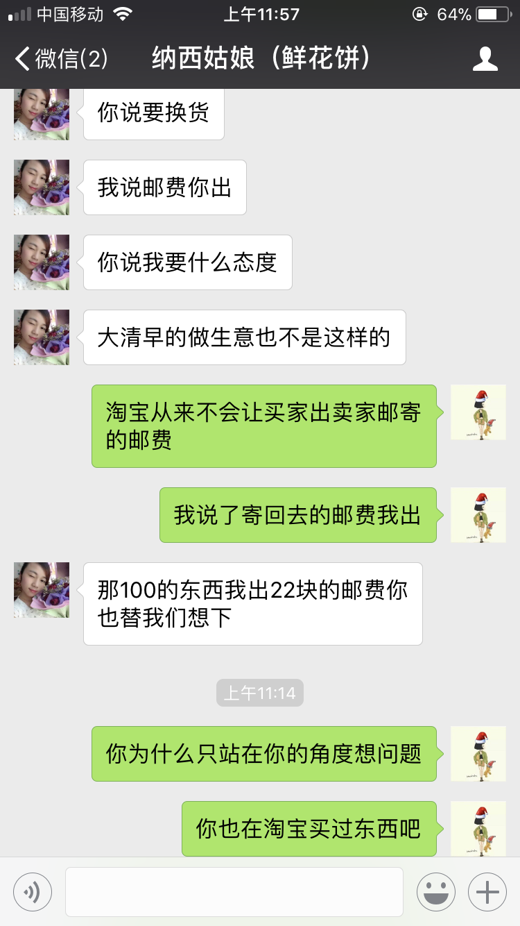 还想说一句,这个卖家说我没有经过她的同意发了她得聊天记录,我想说那也是我的聊天记录!如果自己有理,何惧我发朋友圈,我不仅要发朋友圈,还要大知乎,让更多的人知道!那个长图好像不清晰,等会擦清晰的单图再大上来!