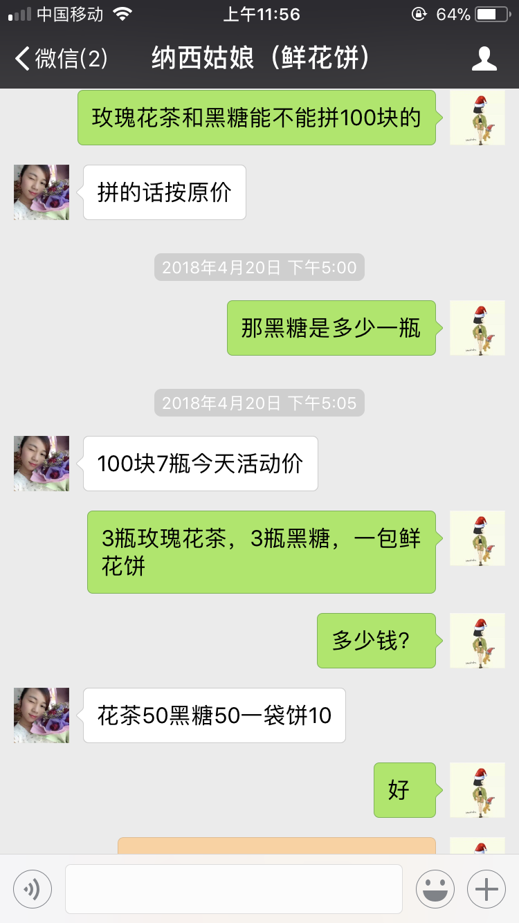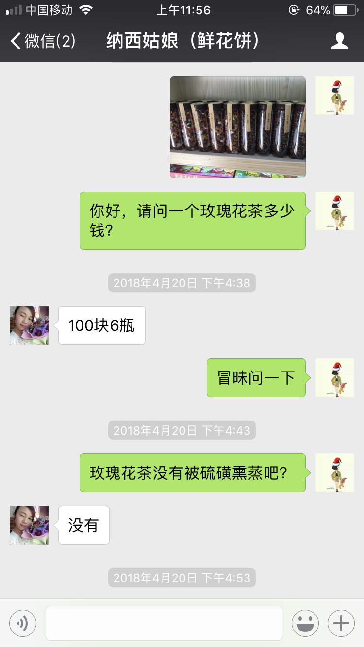 这个卖家是我从亲戚木凤得来的,亲戚去丽江旅游的时候在她家店里买东西,她给邮寄回来的,后来亲戚加了她微信,亲戚说东西还可以,所以我也就加了她微信,准备买点玫瑰花茶!
