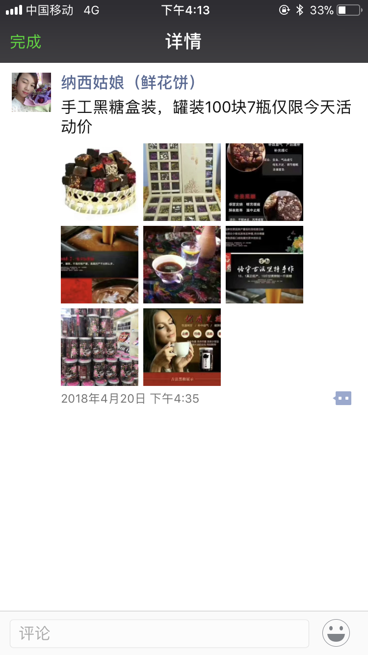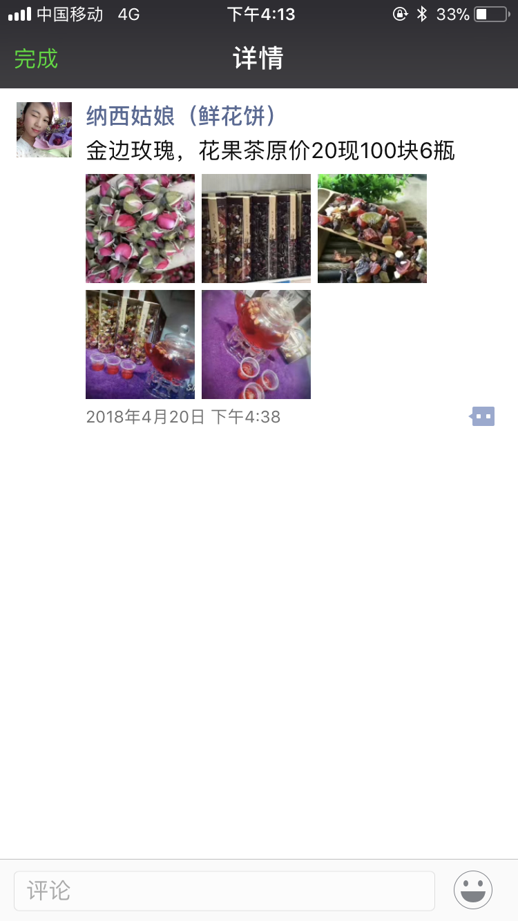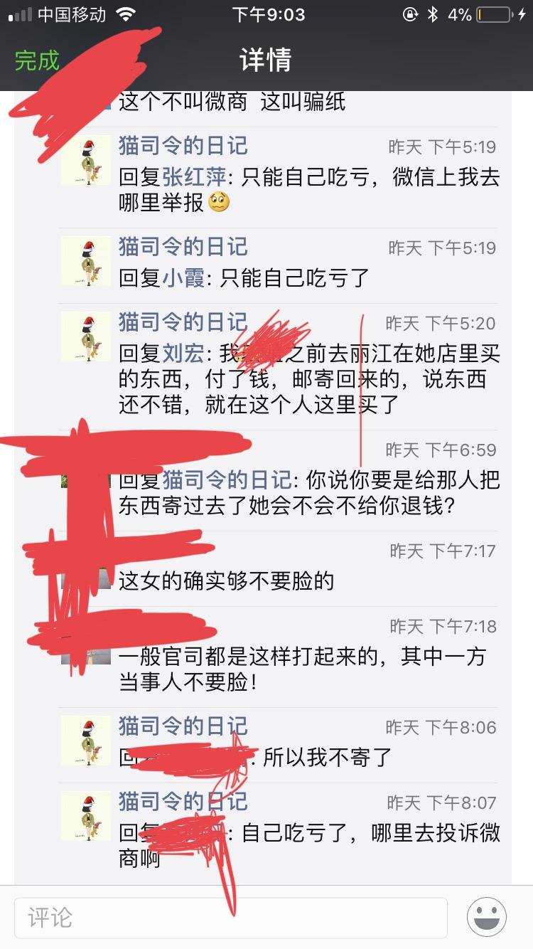 总共在微商里买过两次东西,第一次是班里同学为她的同学发广告,Ta主要是卖新疆特产以及新疆周边几个邻国的东西,比如新疆和田大枣,灰枣,各种葡萄干,巴旦木,酸奶干,俄罗斯紫皮糖以及其它周边国家的叹符饼干之类的。在一个小姐姐这里买的东西真的不错,紫皮糖比超市便宜,灰枣和田大枣也挺好的,感觉个人素质也很高!ta当时跟我在同一个城市,离得很近,原本是包邮的,ta觉得很近就问我能不能ta到这边一个商场的时候我顺便拿一下,我说可以,但是因为在医院上班,所以可能得忙完抽空过去找ta 拿!ta听说后,立马说还是给我邮寄好了,虽然也想省点邮费,但是不好意思打扰我工作!真心觉得个人素养很好,后来看ta朋友圈,可能第一比生意刨去邮费都不挣钱。因为是同学的同学,感觉还挺靠谱的。 还用我朋友圈的截图来说事,我可以把我朋友圈的截图发了,晚上再更,这样的人无论她卖的东西好坏,我觉得人品首先都有问题,是一个丽江卖特产的。这样的人就是要把她公布了,让更多的人知道她的品质,也为了更多的人不受我这样的气! 我朋友圈的朋友并没有表明理解,他所强调的我朋友圈的可以理解的朋友说的是:怎么说,我觉得东西可以,可能就示讽解能力不太对 本来我买那天她发的朋友圈是下图