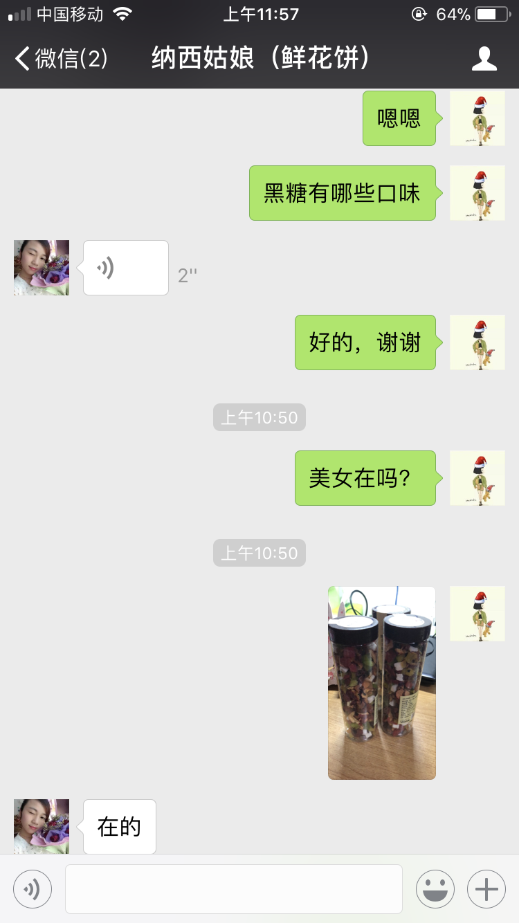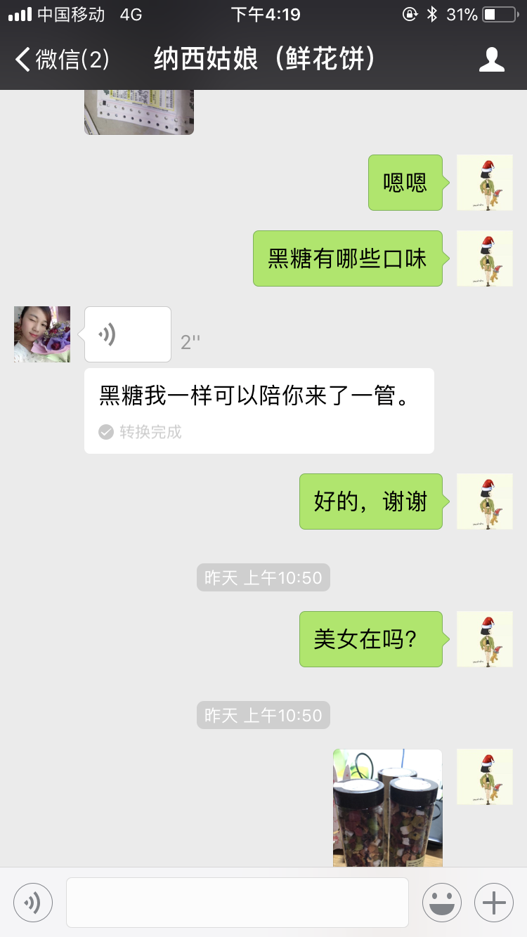 还是我问她,她发了语音,意思应该是黑糖我一样给你配了一罐