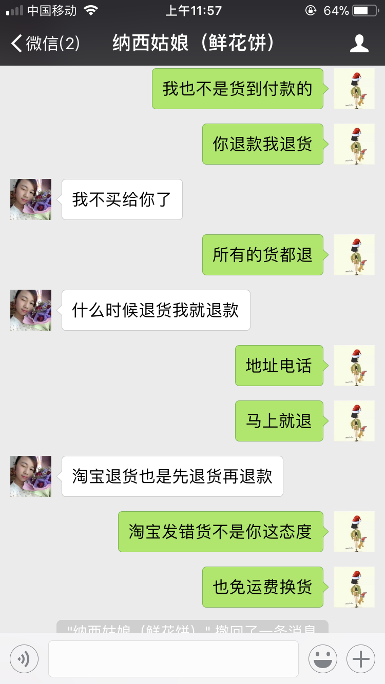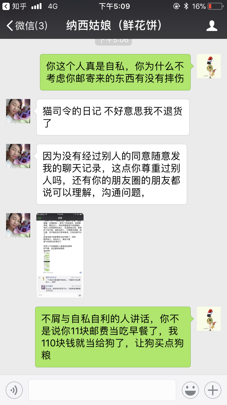 我下午要求退货,她开始一直强调要全部退回,我也说了全部退回,接着她又说等货到了再给我退款。我也没说什么,然后她就又说如果货到了有摔坏,她是不会收的,要拒签!对于这样咄咄逼人的人,我还能说什么!她为什么不考虑给我寄来的货有没有摔坏。从昨天开始沟通到现在,一直都很自私,只考虑自己,从来没有站在对方的角度考戮俘一点!然后还发来我的朋友圈,说我朋友圈的朋友都表示可以理解,示返通问题。还跟我强调互相尊重,没有经过她的同意发了她的聊天记录!what?真是脑子有病无疑了!而且她的理解能力确实有问题。