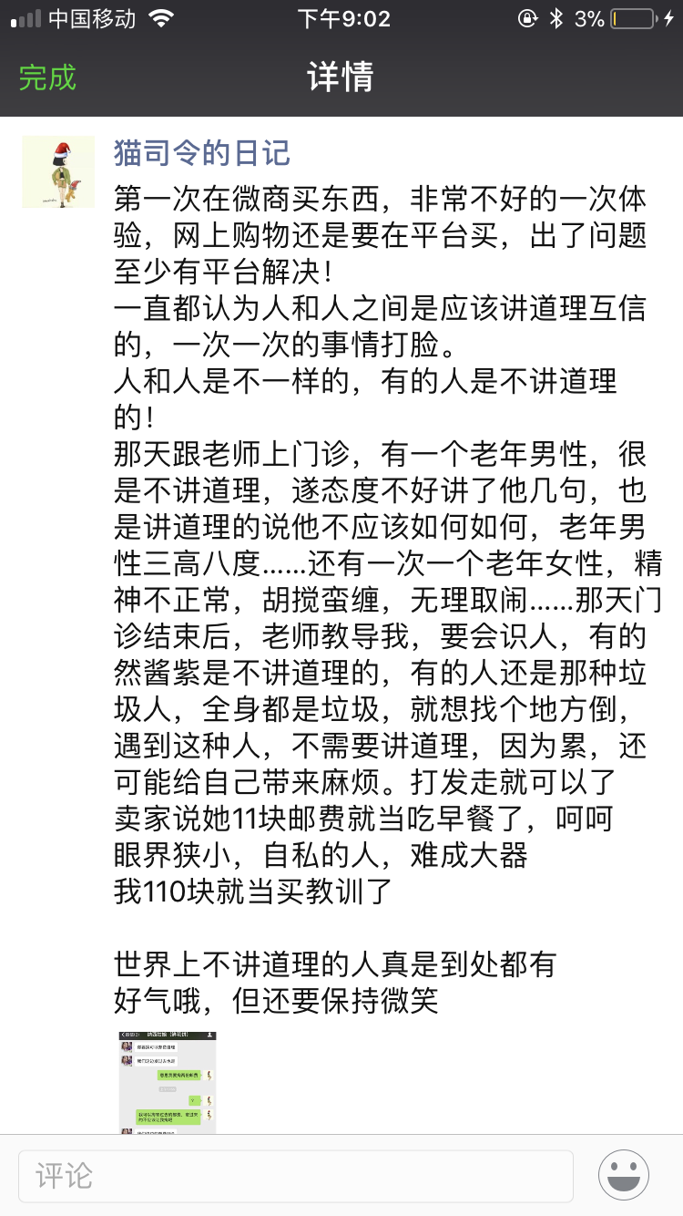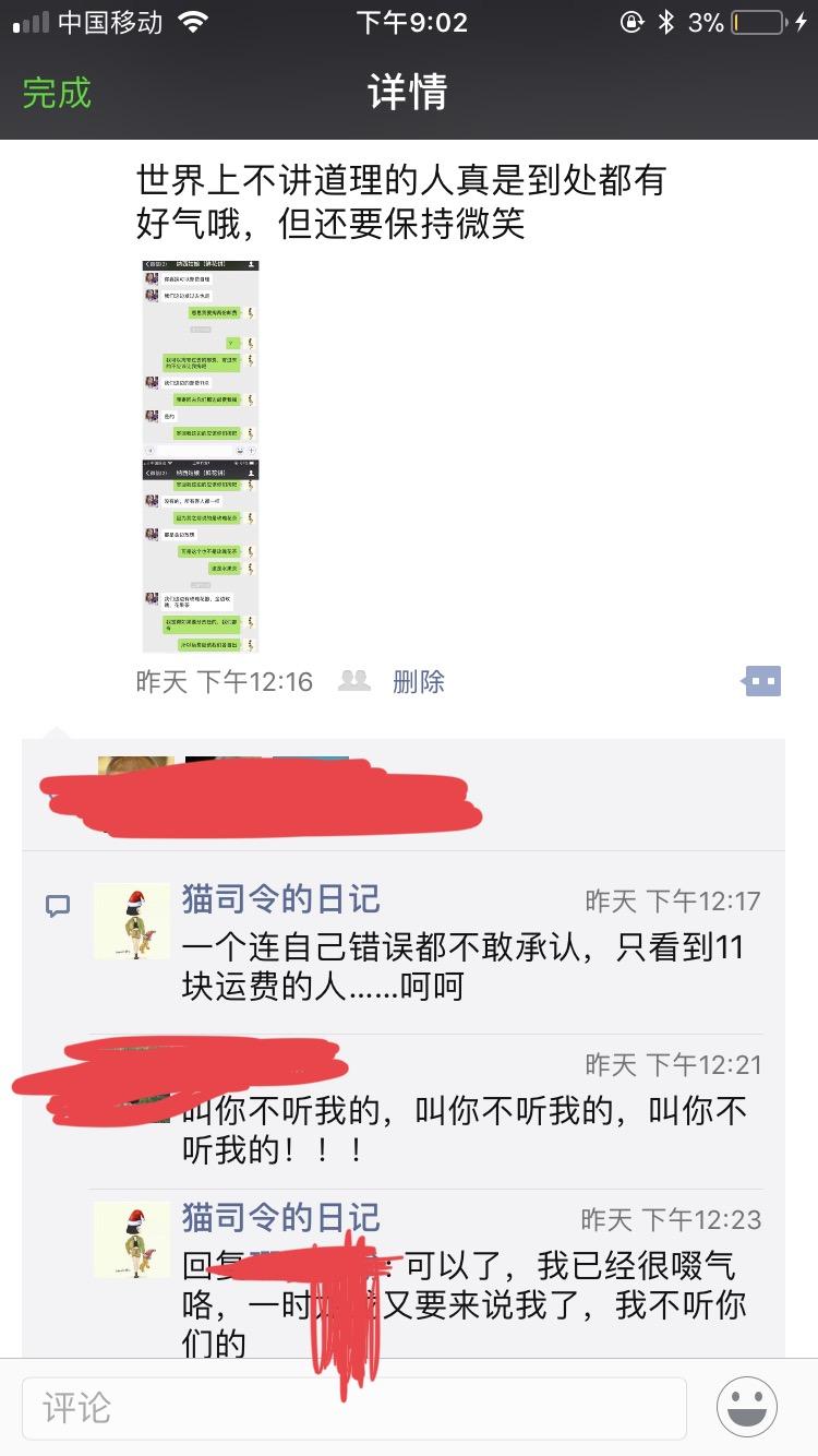 我真是被这个卖家气的不得了,必须骂人了,真的忍无可忍!大家都是头一次做人,为什么要忍!更正一点,朋友圈里说的是第一次在微商上买东西,说错了,应该是第二次,第一次是在同学的同学木凤买的,人很好,东西也很好!