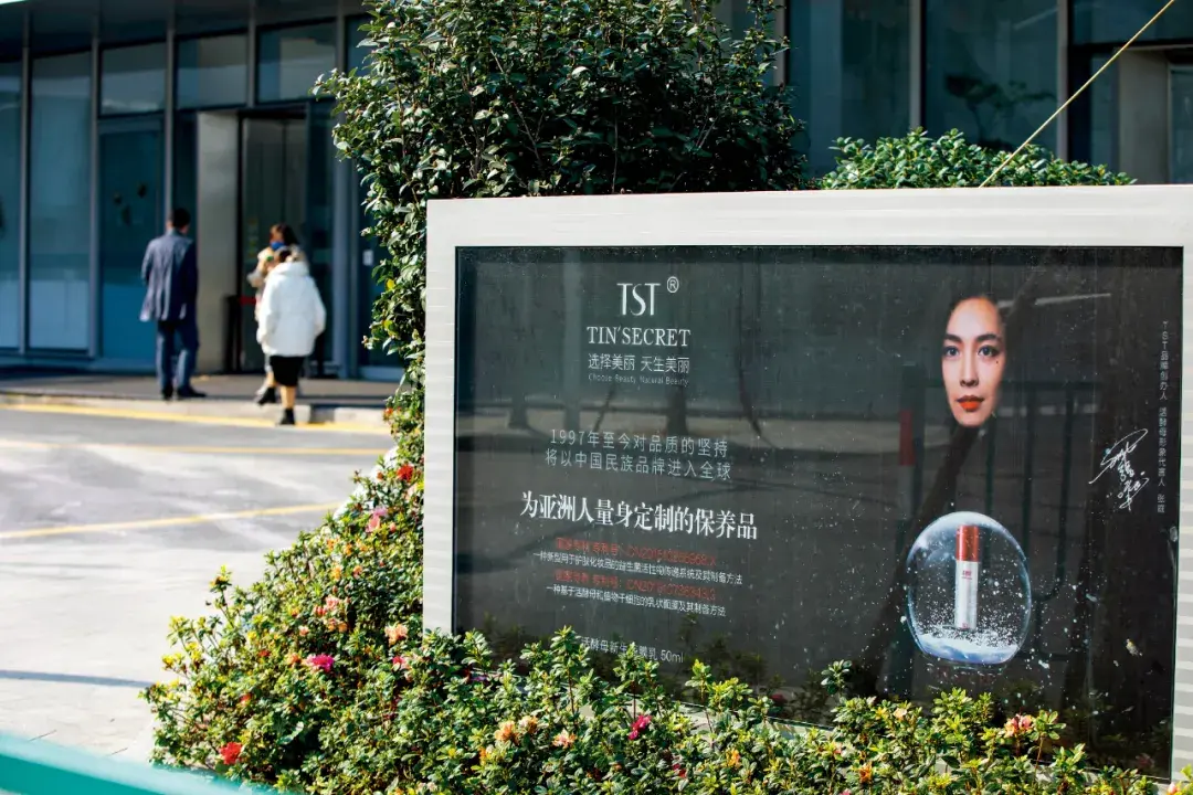 TST庭秘密上海总部大楼前的广告牌。图/IC