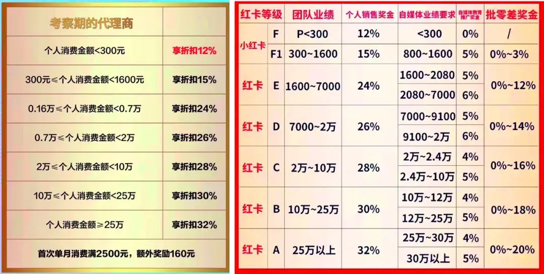 当时这套“金银卡”奖金制度,没过多久便被替换成了“红蓝卡”制度,但规则基本相同。过去的金卡对应现在的红卡,红卡阶段又分7个等级,销售业绩越高,等级越高,个人销售奖金的返点也越多。红卡会员的工资除了个人销售奖金,还包括“代理批零差”和“自媒体推广奖”。所谓“代理批零差”,是下线总业绩以一定比例反哺到红卡会员身上。而如果想拿到“自媒体推广奖”,个人业绩和团队业绩都必须达到一定要求。
