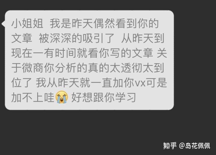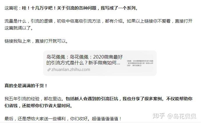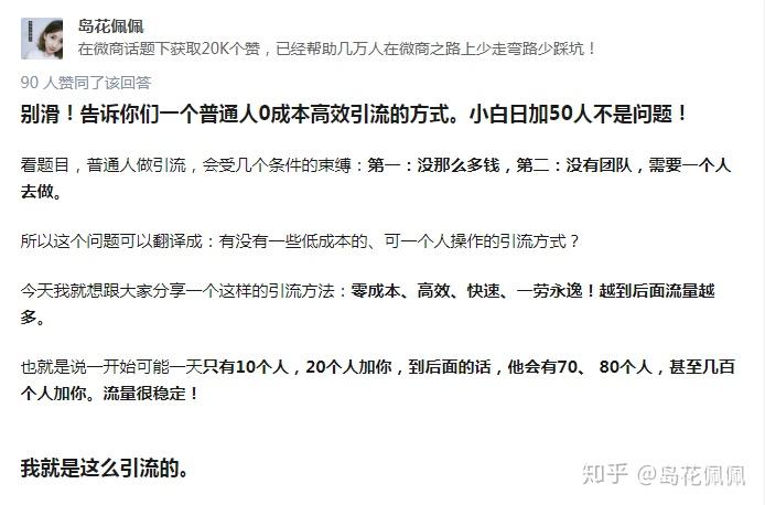 所以能提出这个问题的,是个明白人。 既然问题问的这么清楚明白,我也直接上干货吧! 先给大家看下我的引流成果:一天能加200精准粉。 而且是粉丝加完秒下单。 引流这件事情,你得跟着有结果的人学,才能学到精髓。 所以找岛花是找对人啦! 你只要告诉别人这些内容,别人就会觉得,看了你的文章能收获价值,还会觉得你在这块很懂,看完了,他就会很想找你,咨询你如何解决黑头啊、痘痘啊、斑点等各种问题。 当你解决了他的问题,或者没有解决问题,只要让他有收获,他就会特别信你,这个时候他看到你有卖各种各样的产品,他会想找你买,而且毫不犹豫不还价那种! 这个就像我们去美容院,我们跟美容顾问聊了一会,觉得他很专业,然后体验了一些项目,感受很好,她再推荐些什么产品,我们就会很爽快的买。再贵都买。 因为美容院顾问让我们感受到了价值,所以!为了获取更多的价值,我们愿意付费。 你得先提供价值,才能引流;你得先提供价值,才能获得客户的价值,也就是客户为你付费。 拿岛花来说,我是营销培训的,我的客户是对微商、对个人品牌打造感兴趣的人,那么我就去提供这些方面的价值。 我结合我5年的营销经验告诉用户,如何打造个人IP,如何引流,如何写文案,如何给产品进行定位等等的。 我就持续输出。 我也不打硬广告,但是每天依然很多人想主动加我。为什么呢?因为想在我这获取更多营销的价值。 为什么觉得认识我能获得更多营销的价值?因为我已经给大家提供了很多营销的价值。 我的知乎、小红书、喜马拉雅、微博、公众号等待的,关于营销的价值输出,都有一两百万字了。 这还不够,很多人还想获得更多,所以想进一步认识我。 也确实,认识我之后,他们跟我深入接触,包括就是看我的朋友圈,都能获得超多的价值。因为朋友圈里也有很多营销干货。 我们再回头看看岛花刚开始讲的逻辑:如何引流精准粉丝,其实就是去流量聚集的平台,持续输出价值,然后有需要的人就会主动来找你。 其中的关键点有好几个: 比如:什么是你适合的流量平台,如何挑选流量平台,小红书、知乎、抖音啥的都有流量,哪个适合我自己? 再比如:如何输出优质的价值?文案到底应该怎么写?写引流文案有什么技巧等等的。 这些非常具体的实操步骤,我不在这篇文章展开。 因为关于这些内容,在之前的文章中我已经写过很多很多了。大概十几万字的干货!对! 当然,它不可不是你们看到的一个简单的链接。 里面涵盖了岛花在知乎上关于引流的全部精华! 同时我还跟小白们分享了各种初级、中级、高级的引流案例。如果你想变成引流高手,这篇文章一定要点进去看!! 就像我有很多粉丝,认认真真看岛花的文章,学习岛花的引流方法,现在都加了100多人了! 她留言写的是70,但是zzui近跟我说,已经加了130人了! 所以你们想认真学习引流的,一定要去看这篇链接!(我再贴一次,省的你们往上翻了耶!) 你们看完,一定会庆幸引流的路上遇到了岛花,因为真的可以少走好多好多弯路啊!也可以被少骗好多好多钱!因为里边还分享了岛花的粉丝引流精品的案例! 知道你们不想再看我废话了,那么赶紧去学吧! 但是走之前能不能给岛花点个赞,就是左下角那个三角形,你们的赞,对岛花来说是莫大的鼓励和支持,我会更有动力更新更多更干的干货哒!! 毕竟5年营销经验,我真的是有超多话说!终于看到一个明白人的问题了。终于有人问如何吸引“精准客源”了。