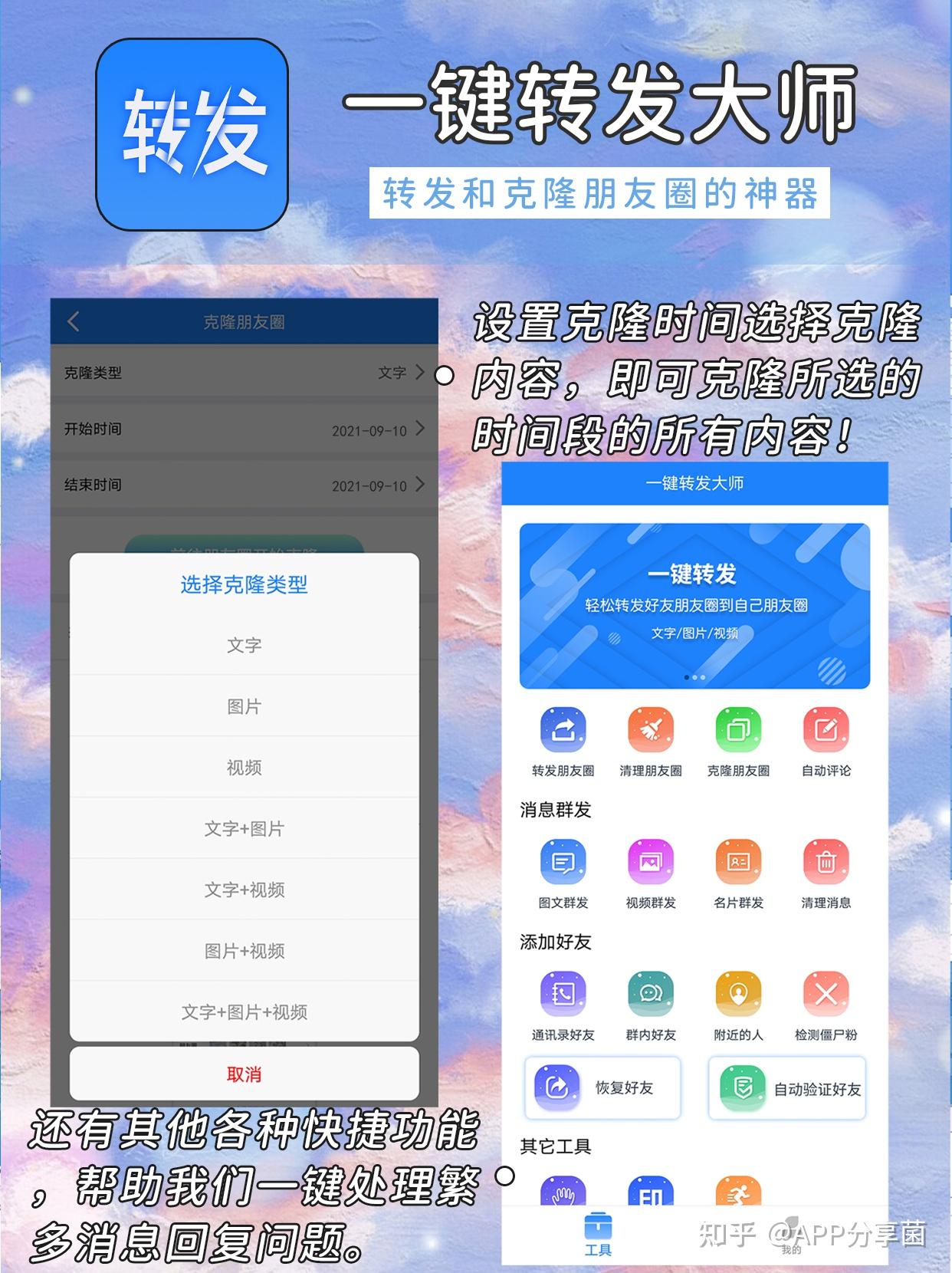 1.转发朋友圈:在公共大朋友圈内看见你需要转发的优质内容,则可使用这功能。只要把你看中的优质内容滑到手机顶部,然后点击“转发”就可把全部内容copy到自己的圈圈内(文字、图片、视频均可copy)9宫格都只需要5秒就搞定