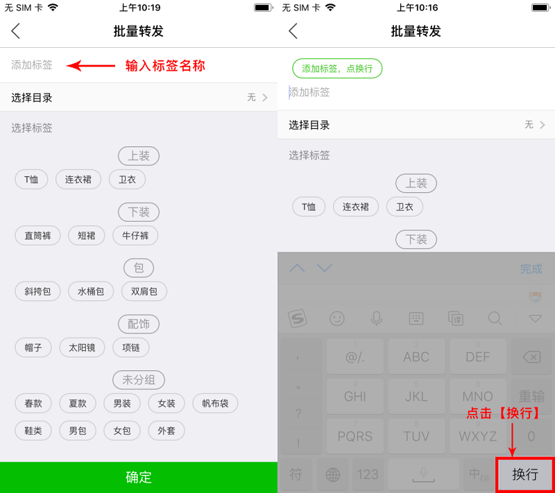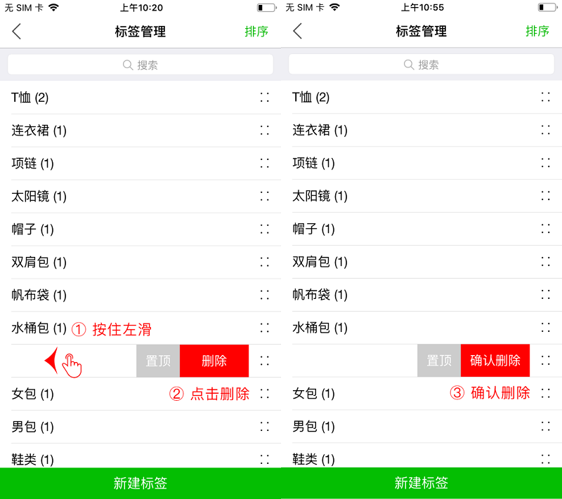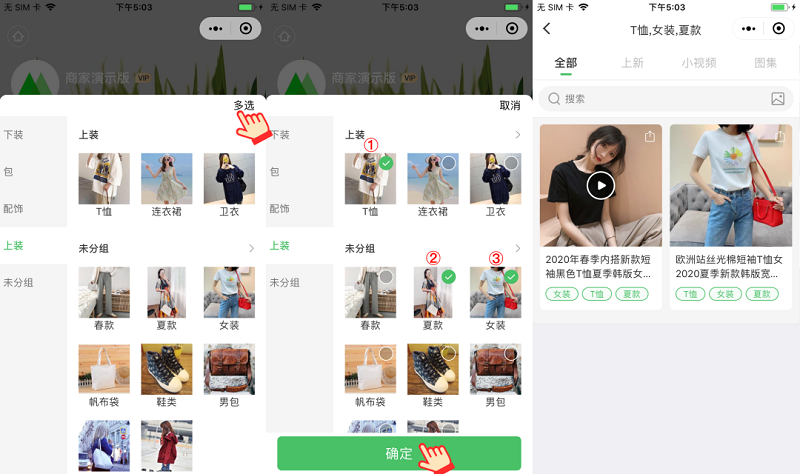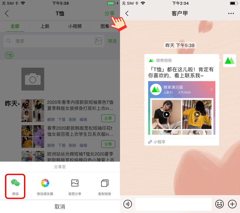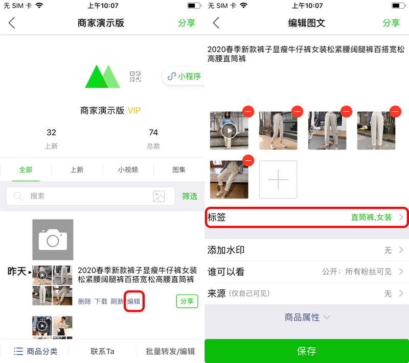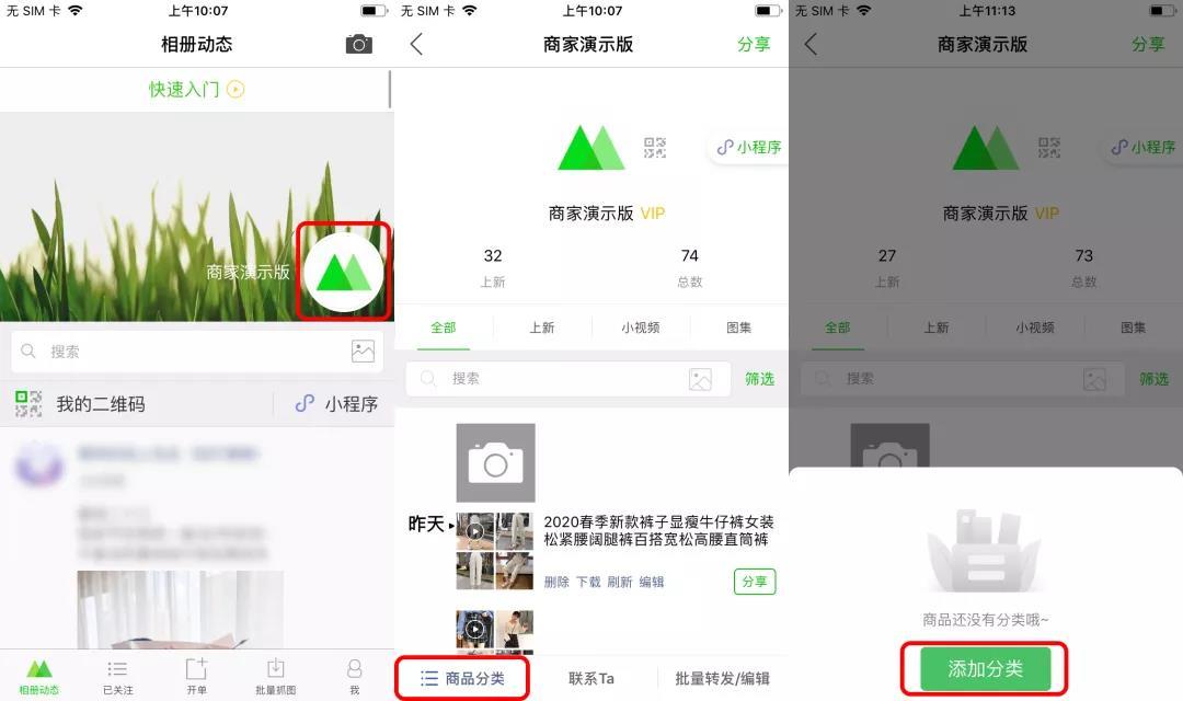 先给大家看两个真实卖家相册的对比图 比起没有分类、不能搜款、密密麻麻的朋友圈,有商品分类的相册就像一个小淘宝,自动把你的相册变身高大上的店铺,激发买家的购买欲望! 商品分类怎样设置? 在微商相册APP,点击自己的头像进入个人相册,点击左下角【商品分类】即可批量给商品添加分类。 如想单独给商品设置分类,点击一组商品图文下方的编辑按钮,进入【标签】即可进行设置。一组商品图文支持打上N个标签噢~ 商品分类在哪里看? 设置完成后,在微商相册APP或小程序点击头像进入个人相册,点击左下角【商品分类】即可查看。 姿势一:查看某一标签商品 点击标签缩略图可查看该标签下的所有商品。 姿势二:查看多标签的商品 点击【多选】并选择2~3个缩略图可查看包含多标签的商品。 独家小技巧 当买家只咨询某一类商品时,如:买家向服装卖家咨询T恤,卖家可以在商品分类中选择「T恤」标签,点击右上角分享到微信,买家打开即可查看店铺中的所有T恤。 常见问题 问:怎样删除标签?答:想删除某一标签,进入【我】-【设置】-【标签管理】-【标签管理】页面,按住标签向左滑动,点击【删除】-【确认删除】即可。删除标签本身不会删除标签下的商品。 问:为什么批量转发/编辑时添加标签不成功? 答:输入标签名称之后,需要点击键盘右下角【换行】按钮,才可添加成功。 问:为什么【多选】后显示无数据? 答:因为【多选】是一种精准搜索,选择的是同时包含标签A和标签B的商品,“无数据”表示相册中没有同时包含标签A和标签B的商品。比如,勾选【双肩包】【T恤】后无数据,说明相册里不存在同时包含【双肩包】和【T恤】这两个标签的商品。 问:商品分类中,标签的封面图可以自定义吗? 答:后续版本支持自定义标签的封面图哦,敬请期待~