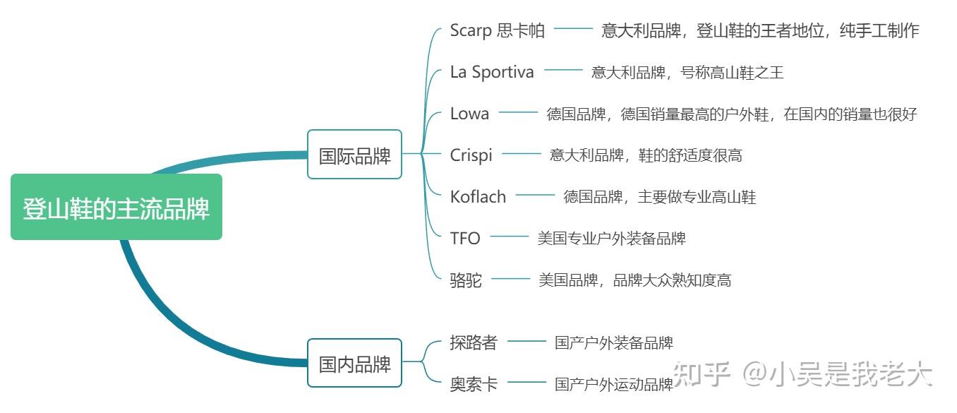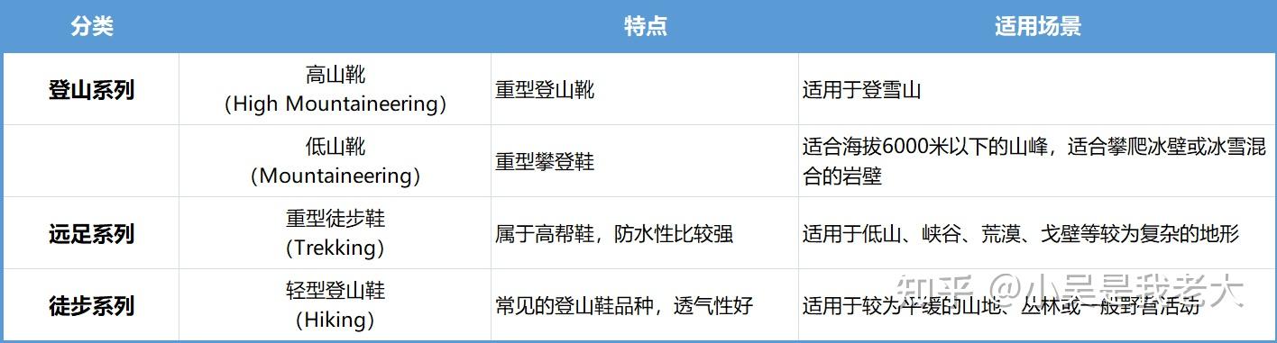 如果你喜欢户外运动?需要一双登山徒步鞋却不知道应该怎么选?关于登山鞋的选购知识似懂非懂或者说毫无概念?不要着急,这篇登山鞋的选购全攻略不就来了。 这是一篇关于登山徒步鞋非常详尽完整地介绍,希望对大家选购登山鞋有帮助,看完能够选到一双适合自己的登山鞋! 全文将从五个方面介绍登山鞋,目录如下: 好了,话不多说,我们进入正文吧! 登山鞋和徒步鞋分不清楚?如我们所知,登山鞋和徒步鞋是有区别的,到底区别在哪呢?看完下面这张图就明白了: 1、登山系列 登山系列的登山鞋是属于专业型的,适合登山、探险、攀岩等复杂地形活动,专门为负重长时间行走而设计,优点是防水、保暖,具有极强的抓地性,鞋子比较重,在1.3kg以上。 1、支撑保护性 2、抓地防滑性 目前登山鞋的主流品牌是以意大利和德国为主,国产品牌的工艺、舒适度不如那些大品牌,性价比不高,在预算足够的情况下,建议选择户外专业品牌的登山徒步鞋。 登山鞋的选购主要根据上述介绍的三大作用/功能(第二部分),来选择其材质、鞋底等,除此之外,选购登山鞋要注意以下几点: 1、远足系列登山鞋推荐 重量在0.9-1.3kg,可负重30公斤以上,一般适用于长途负重的野外徒步,或者是较为复杂的地形。 徒步鞋品牌的王者,这款新一代莫林在重量上达到了更加轻量,SCARPA自主研发科技,强效缓震,降低脚部疲劳度,GTX防水透气面料,雨天也无需担心,保持穿着舒适干爽,这款算是入门的登山款了,徒步鞋的优选,不管是新手还是资深驴友,都很合适,性价比非常高! 这款登山鞋的颜值非常高,满满的机能风,GORE-TEX级别防水+LOWA气候调节系统,二层牛皮材质,透气排湿,保持足部干爽,LOWA的大底稳定结构,耐磨、防滑、抓地力强,可适用于多种户外地形。 零重力系列适合进阶级徒步登山,设计上减轻重量,GORE-TEX袜套结构,防水透气,适合全天候环境使用,SALIX TREK鞋底、底部稳定支撑以及侧面包裹,耐磨耐穿,足以应对不同路面挑战。 登山鞋的实力品牌,号称不需要磨合的登山鞋,GORE-TEX内衬+CBS透气系统,鞋子的透气性和防水性很好,耐磨减震,vibram大底,超轻鞋底,穿着舒适度非常高。 2、徒步系列登山鞋推荐 如果新手想买价格更低一些的,可以看看TFO这款徒步鞋,在功能性上差一些,但前期玩短途是没问题的。 TFO 这款徒步鞋价格比较低,采用了橡胶防滑大底,空气循环鞋垫,透气性好,穿着不闷热,男女款都有 ,如果你是新手尝试,可以选择,长期性的和老精品不建议,功能性不够。 哥伦比亚 这款徒步鞋的设计好看,鞋面透气网布材质,穿着干爽舒适,Techlite超轻中底,能够提供持久的缓震保护及回弹性,奥米户外抓地技术,鞋子的抓地力好,短途旅行选择这个鞋很不错,是性价比非常高的一款徒步鞋。一、登山鞋的分类