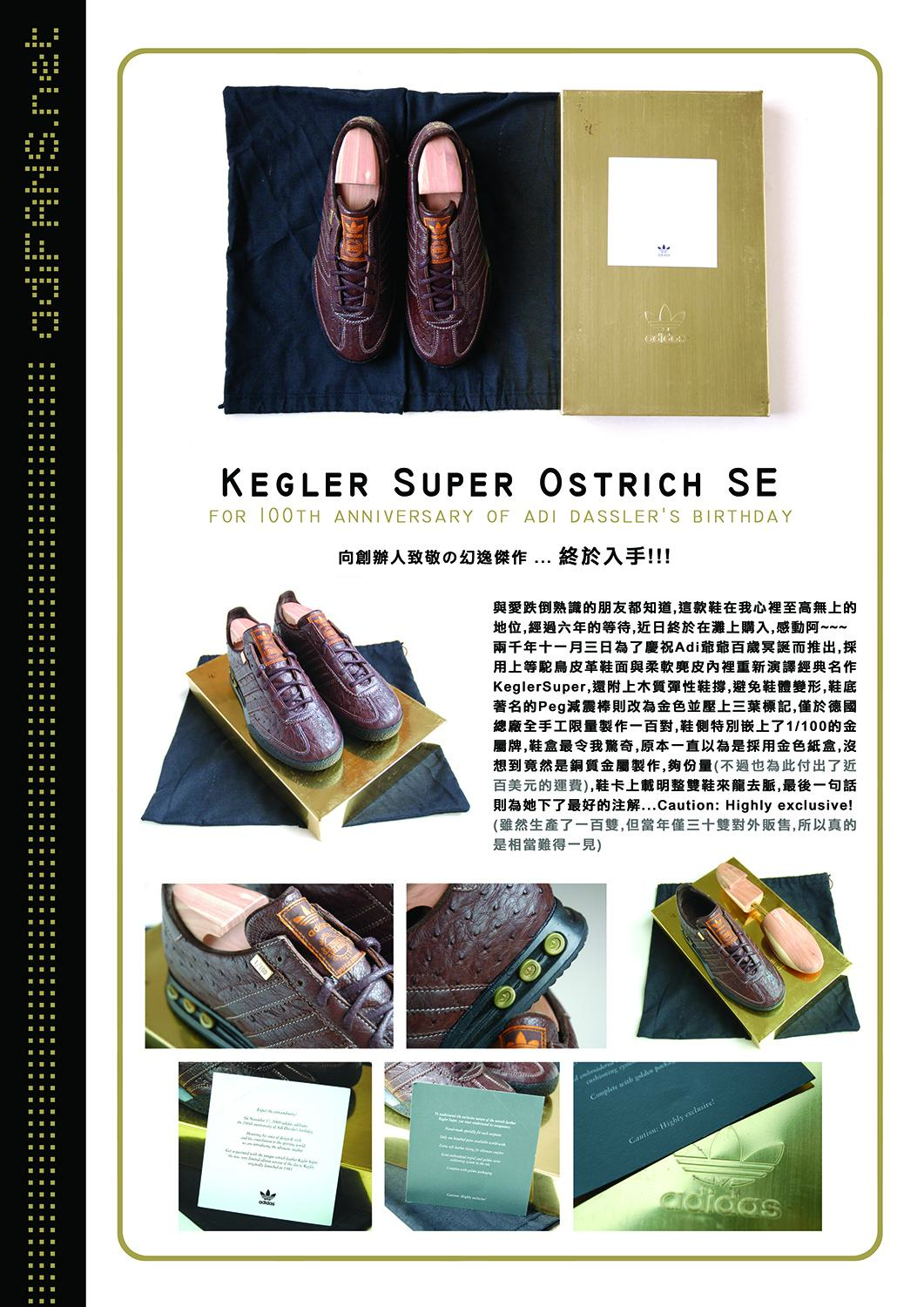 Adi:我zzui老的收藏是 1956 年的 Melbourne 田径鞋,是选手用鞋,比我老了 20 多岁,是我唯一一双 50 年代的鲨鱼皮底。另一双zzui骄傲的收藏应该是为了庆祝创办人 Adi Dassler 先生一百岁诞辰的纪念版 Kegler Super,花了近 5 年才找到一双,是我对老爷爷zzui高的敬意。