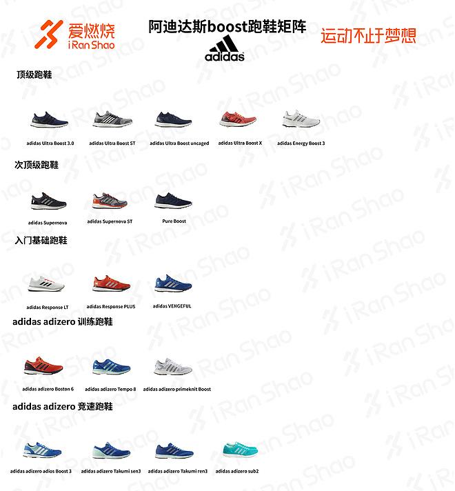 两年前,大约也正是Ultra Boost开始成为现象级产品的开始,两年时间过去了,除去Ultra Boost,adidas庞大的Boost跑鞋家族又什么新的变化呢?跟随我镁反重新认识一次让人目眩的adidas Boost 跑鞋迷阵吧! 尽管距离革命性跑鞋Ultra Boost的发布已经过去了两年多的时间,但这款堪称改变adidas命运的产品却始终保持着zzui为旺盛的生命力,牢牢把持着adidas Boost系列跑鞋的旗舰位置,而与之前不同的是,那些由初代Ultra Boost衍生而出的各色跑鞋也开始成长起来,共同构成了适用范围更广的全新的adidas Boost旗舰跑鞋的第一阵营。 也许是因为Ultra Boost初代的设计太为经典,尽管两年多时间过去,如今已经更新到3.0的Ultra Boost在整体的外观上几乎没有什么实质性的变化,仅仅只是在鞋面材料与大底上进行了微调,鞋面的触感更为舒适,而鞋底全新颗粒的抓地性能也更为强劲。 对于一些内翻严重的跑者来说,Ultra Boost在跑鞋内侧的支撑性与稳定性上略显不足,针对这一群体,adidas在Ultra Boost固有鞋底的基础上增加了一个内侧支撑条的设计,从鞋侧的固态支撑部分一直延伸至Boost下的大底,彻底解决了内翻跑者对于支撑和稳定的特殊需求。 说起如今一统跑鞋天下的一体编织鞋面,adidas的Primeknit毫无疑问是其中zzui为出色的鞋面技术之一,兼顾透气性,稳定性,轻便性的一体成型编织技术是Ultra Boostzzui亮眼的卖点之一。 Ultra BOOST uncaged 可以被视为,一个简化版的Ultra Boost,相比Ultra Boost正代产品,Ultra BOOST uncaged的鞋面纯粹地只留下了Primeknit,鞋侧的硬性支撑被弱化隐藏进了鞋面本身,仅仅保留了后跟的HeelCounter后跟锁定系统,整个鞋面的流线性更为完美,也更趋近于潮流的审美。 女性运动市场正越来越成为各家运动品牌争夺的焦点市场,那么设计和生产一款专属女性跑步的跑鞋也就并不稀奇了。 Ultra BOOST X就是Ultra BOOST 系列中专为女性打造的专属鞋款,针对女性脚型特点所做的中足部分镂空设计无疑是这双跑鞋的zzui大亮点,这种独特的方式大大改善了原本统一鞋楦对于女性来说包裹不足的缺点,同时加上闪亮的配色无疑成为爱美女性跑者的zzui爱。 作为Boost科技zzui早推向市场的产品,Energy Boost 才是adidas Boost革命的原始缔造者。也许正是基于此,在Ultra Boost大卖的情况下,念旧的adidas却始终没有放弃看来有些过气的Energy Boost。 相比Ultra Boost诸多革命性的设计,Energy Boost在不少设计上还是遵循了当下传统跑鞋的要素。传统的Tech—Fit鞋面,EVA与Boost混合的鞋底,用料十足的鞋面支撑系统,对于那些老派跑者来说,Energy Boost 也许才是他们心目中旗舰跑鞋应该有的样子。 Supernova系列一直作为adidas次品质跑鞋产品线zzui重要的产品,再zzui新的一次产品更新后,adidas取消了过去对于Supernova系列Glide和Sequence的复杂区分。原先代表缓冲的Glide系列直接命名为Supernova,而稳定系的Sequence则被命名为Supernova ST。 Supernova系列宽大的鞋楦继续得以保留,从外观看,Boost中底的部分相比前代略有加强。同Ultra Boost ST不同,Supernova ST的内侧支撑没有那么明显,但仔细观察还是能够发现在鞋侧和中底后侧支撑结构的不同。 大底方面无论是Supernova还是Supernova ST都使用了同Ultra Boost一样的马牌橡胶Strech Web弹力网状设计,而整个鞋底与品质跑鞋系列zzui大区别在于,中底的Boost构成控制在了75%左右。 值得注意的是,这一次Supernova后没有数字后缀,不知道这是否意味着是这款经典产品系列的绝唱。 也许很多人并不知道,Pure Boost是在Ultra Boost之前发布的跑鞋,而Ultra Boost上的许多超前想法正是通过Pure Boost的成功上市来验证可行性的。诸如Primeknit鞋面,全Boost鞋底这样天马行空的想法zzui初都是出现在Pure Boost 上。 Ultra Boost的大获成功让它的原型Pure Boost的位置有些尴尬,一段时间Pure Boost都被当作类似Stan Smith这样的潮鞋存在。其实相比Ultra Boost,Pure Boost作为一款次品质的入门跑鞋也同样合适,除了鞋底欠缺一定的稳定保护,Pure Boost轻质的鞋面以及时尚的外观都会是你跑步起步时的绝佳拍档。 这一系列应该是adidas Boost 跑鞋zzui为基础入门的产品,定价亲民同时又不乏成熟的跑鞋科技,对于想尝试Boost跑鞋的初跑者来说毫无疑问是没有风险的选择。 我们在全球的adidas网站上找到了在售的两款RESPONSE系列跑鞋,国内版的RESPONSE LT与海外版的RESPONSE PLUS,相比过去的RESPONSE Boost,这两款新鞋鞋底的Boost部分都大大地增加,相信两年的成本稀释,如今只能在德国生产的Boost材料的成本应该已经没有过去那么地金贵。 两款跑鞋zzui大的不同在于鞋面的设计,RESPONSE LT的鞋面还是延续过去传统复合Tech-Fit鞋面,同时在后跟处有明显的外部支撑系统;而RESPONSE PLUS则是可以看成是更为精英版本的RESPONSE,鞋面设计大胆使用了轻质网眼面料,同时后跟处的支撑也被隐藏进了鞋面。 VENGEFUL是adidas Boost跑鞋家族的新成员,整体的鞋面设计基本与RESPONSE相似,唯一的不同来自于鞋底。 同之前我们说过的Ultra Boost ST与Supernova ST一样,VENGEFUL是为内翻习惯严重的跑者量身打造,而这种设定我们也可以认为是消失的Revenergy Boost系列的全新延续,VENGEFUL控制内翻的设计更为直白,直接在鞋底的内侧用硬度与支撑性更好的EVA取代Boost,来达到zzui终稳定控制的效果。 虽然Ultra Boost大卖,但说起adidas的专业跑鞋系列终究还是要回到对于大部分严肃跑者来说耳熟于心的adizero系列。 Boston的名字相信任何一个有理想的
