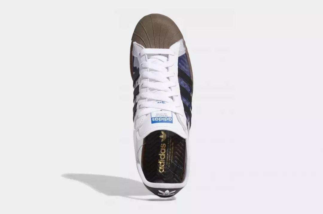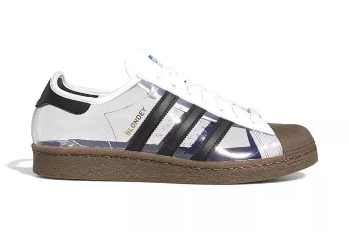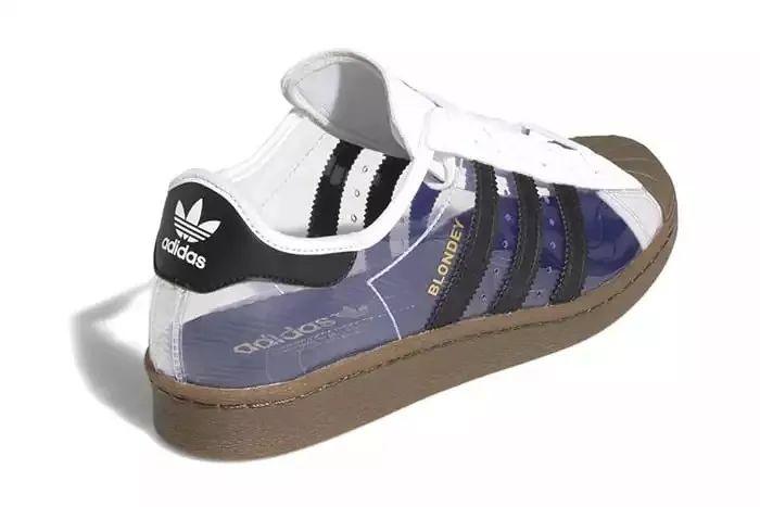 当然,除了鞋侧身采用完全透明的特殊设计,我们依然能看到标志性的Adidas Logo,设计者也用 Blondey 代替了鞋身侧面原有的 Superstar Logo ,中底与鞋头部分均是皮革材质。