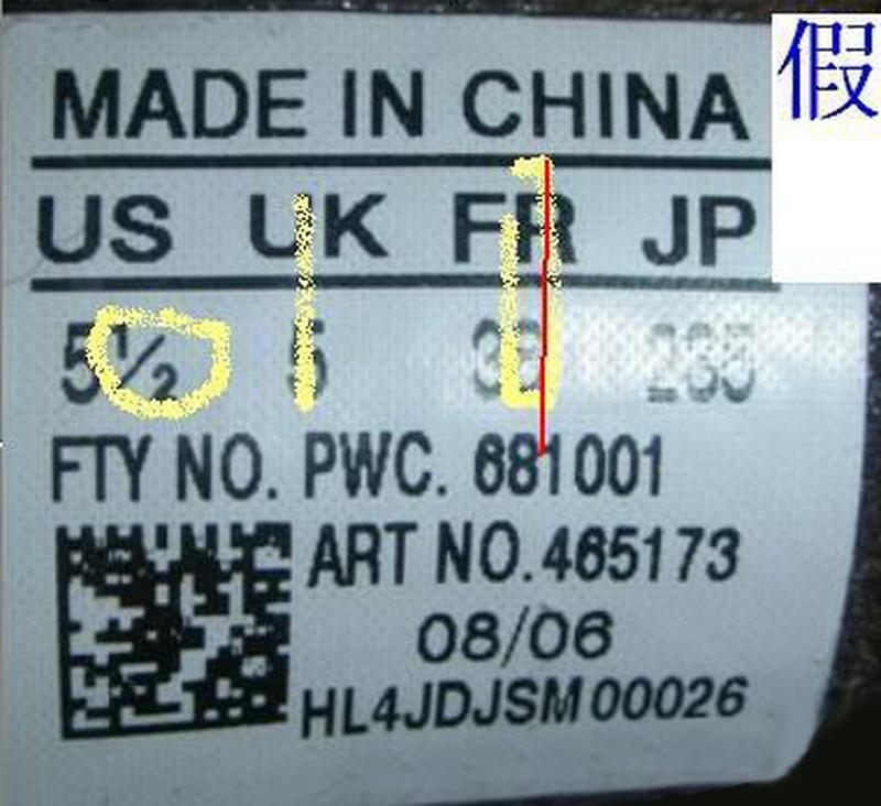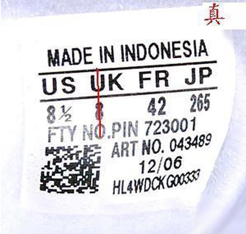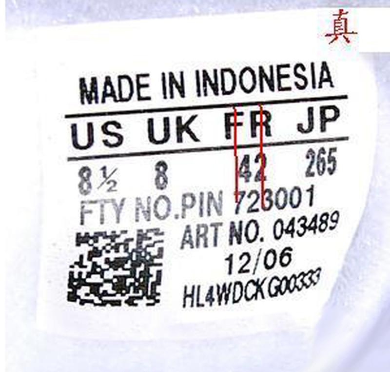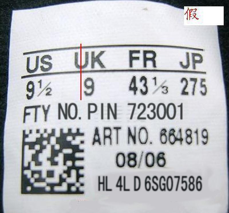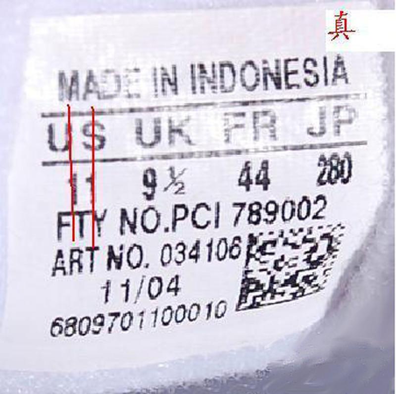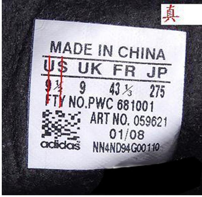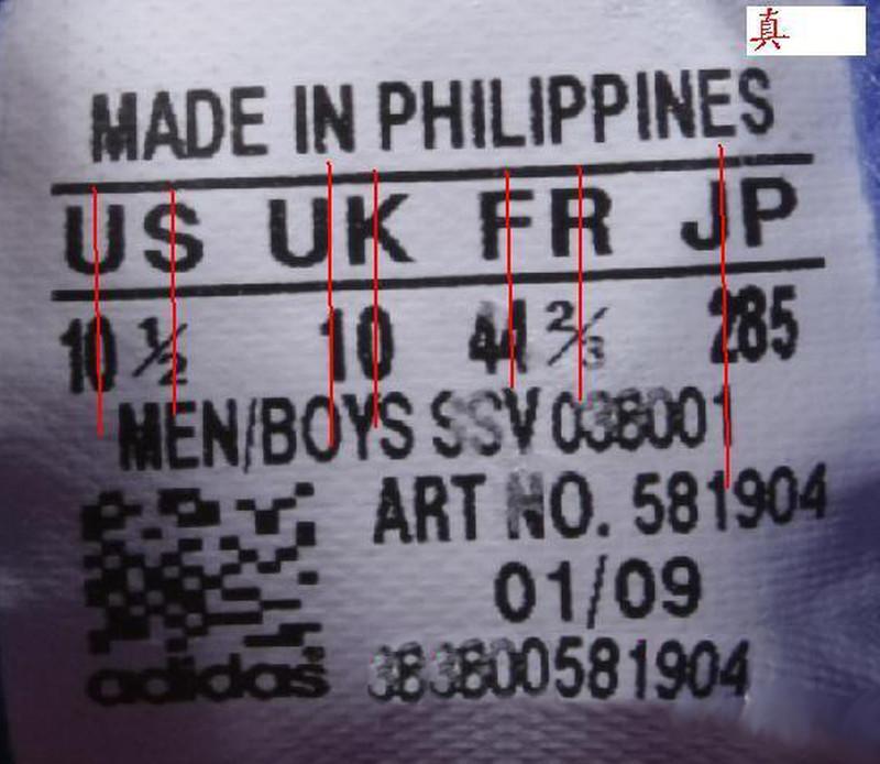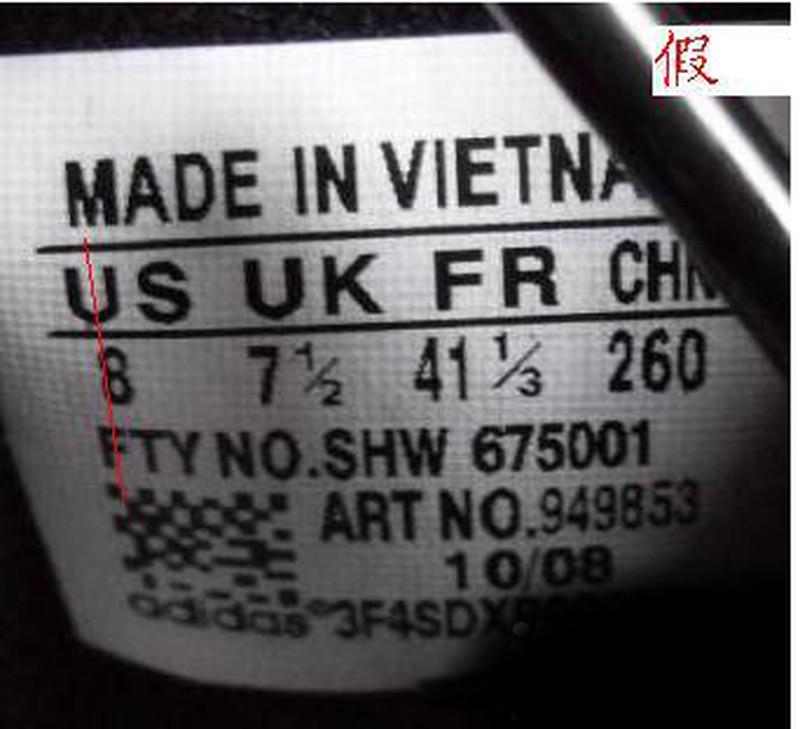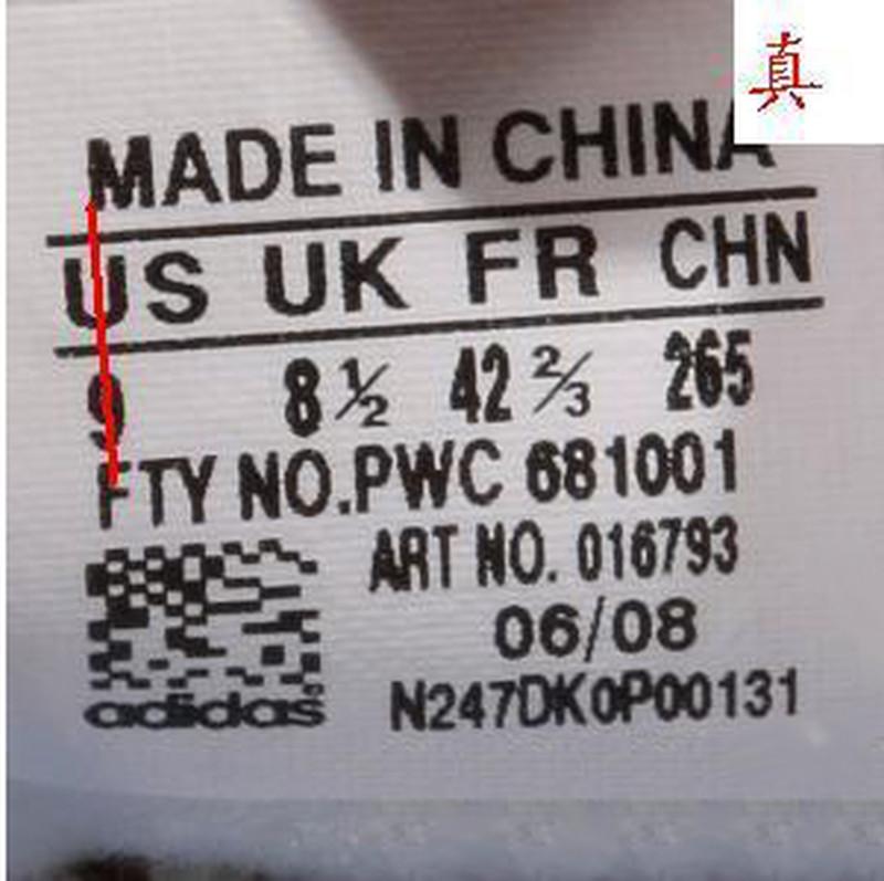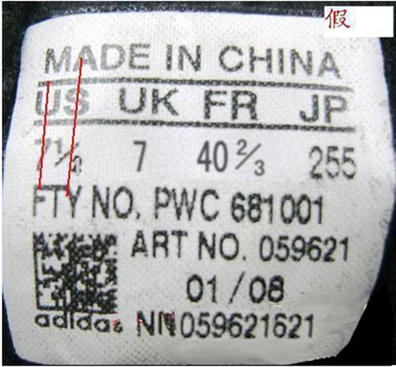 adidas三叶草鞋标辨别方法 ADIDAS 三叶草 鞋标辨别精华贴 很多顾客一直比较头痛的问题就是花几百快递钱买双假鞋,因为不会鉴别,还一直以为是真鞋,在朋友面前或者很多场合出糗,所以为了帮助所有爱好三叶草的朋友解决这个问题,本文转载的这篇网络上流传的关于辨别真假三叶草的帖子,供大家交流。 辨别三叶草的真伪,有一个常用的方法,看鞋标。至于有的朋友说的,做工不好,胶味重等说觉得是假货,这些都不足以判断鞋子是不是正品,正品在你眼中不一定做的好,假鞋在你眼中也可能你觉得做的好,真鞋不一定没有胶味,假鞋也有可能你觉得没有胶味。 如何辨别三叶草鞋标: (一) 对齐方式 (1)首先就US 来说,如果下边的数字是1位整数,那么数字在字母‘U’的正下方,是1位整数加1/2分数,那么整数数字在字母‘U’的正 下方,1/2 分数在字母‘S’的下方偏左一点。 如图1 1位整数真假对比图 整数‘9’在字母‘U’的正下方 如图2 1位整数加分数真假对比图 如果US 下边的数字是2位整数,那么十位数字与字母 ‘U’ 的右边竖杠大致对齐(没有完全在一条线上),个位数字在S的正下方,如果US下边的数字是2位整数加分数 1/2,那么整数的2位数字在字母‘U’的下方,1/2分数在字母‘S’的正下方。 如图1 2位整数真假对比图 个位数‘1’在字母 ‘S’的下方 十位数 ‘1’紧挨在字母‘U’右边竖线延长线的右侧 而不是在字母‘U’的下方。 如图2 2位整数加分数真假对比和上边一位整数加分数,大致一样的。 (2)就 ‘UK’ 来说,基本和‘US’一样的对齐方式。 如图 (3)就‘FR’来说,如果是两位整数,那么个位数字与字母‘R’对齐,如果是两位数字加分数‘1/3’或者‘2/3’,那么两位整数与字母‘F’对齐,分数与字母‘R’对齐。 如图 1两位整数真假对比图: 个位数字‘2’在字母‘R’的正下方。十位数字‘4’紧挨在字母‘F’中线延长线的右侧,而不是‘F’下边。 太长了, 后面的的有时间再来接着上