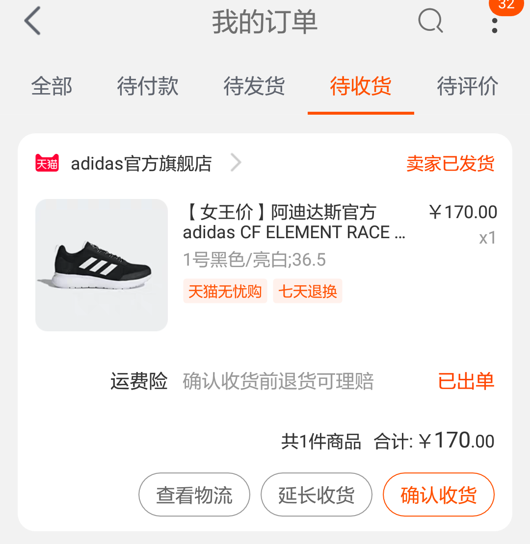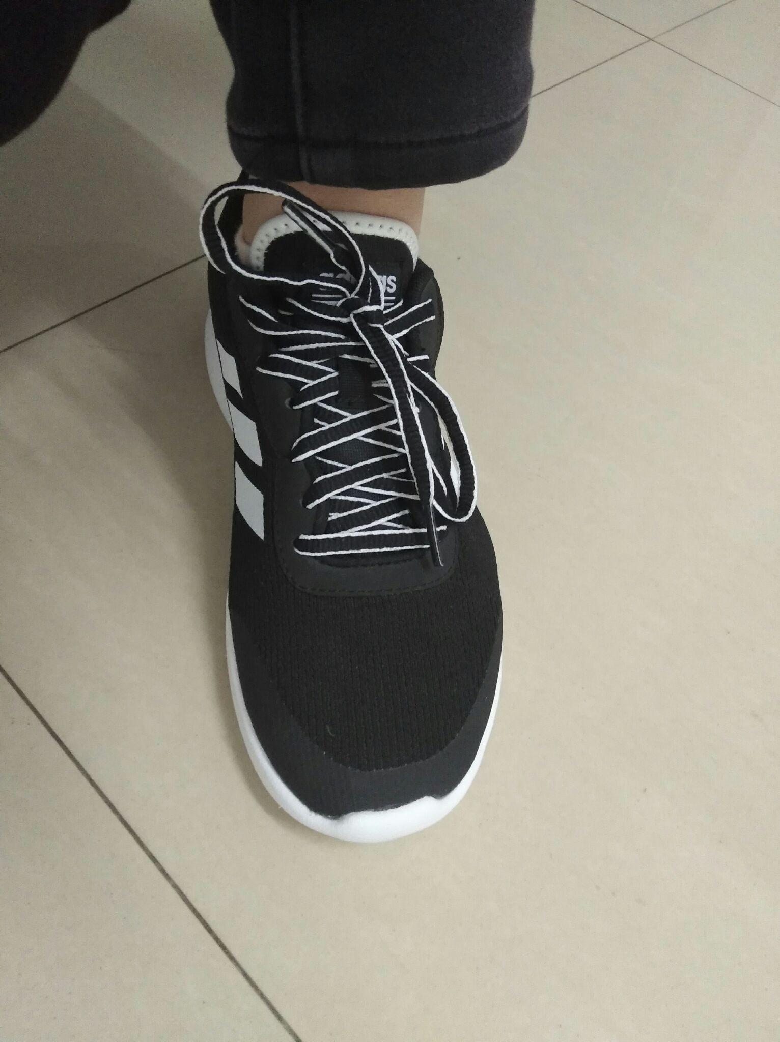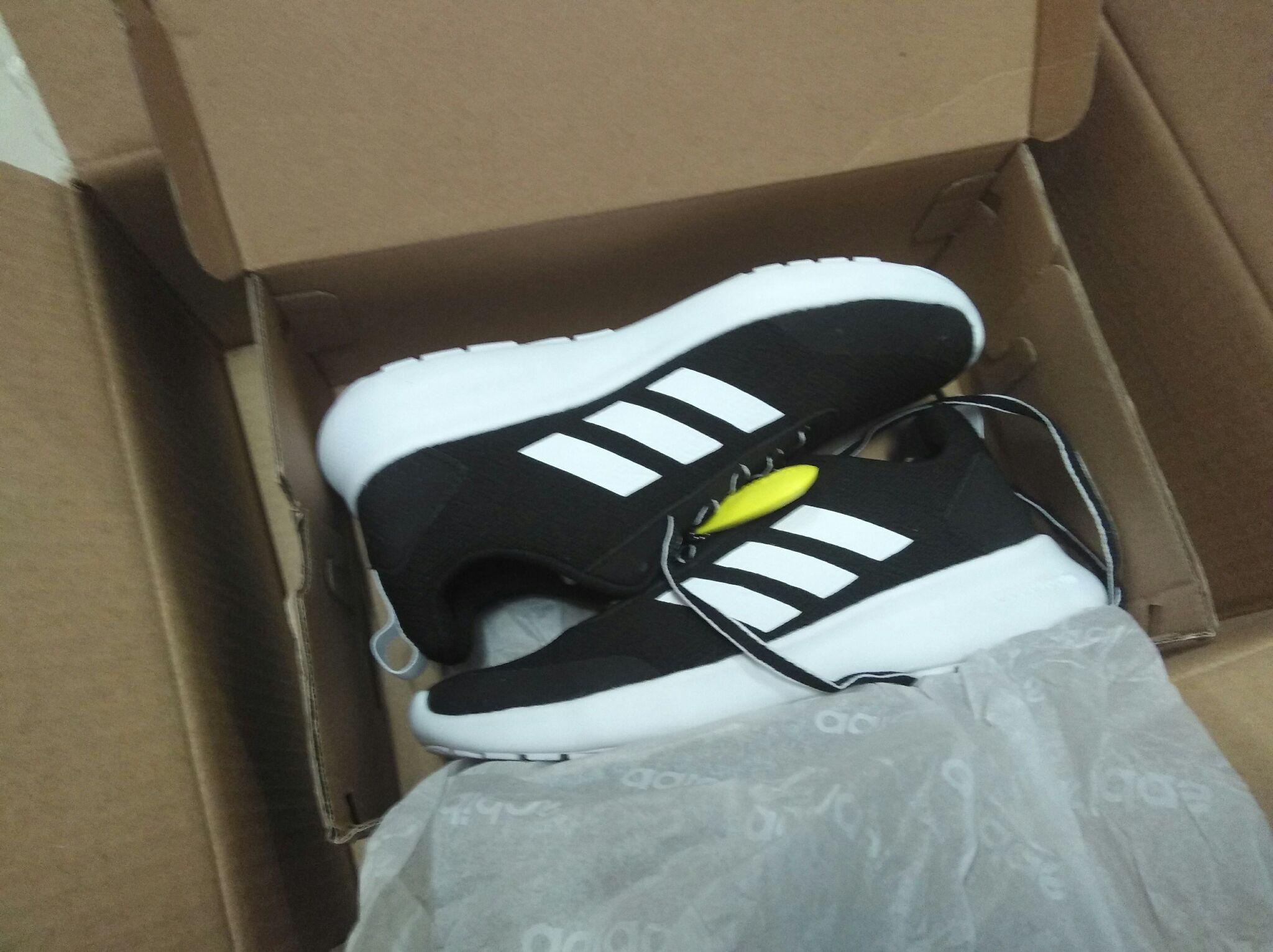 昨天趁女王节打折,去淘宝阿迪达斯官方旗舰店入手了一款阿迪达斯跑步鞋。眼巴巴等到0点迅速下单,精品到这双170块阿迪达斯。先晒购买记录: 不得不说,顺丰的物流还是蛮快。北京安检加强还可以在发货后一天内送到,物流体验还是蛮不错的! 下面就是激动人心的开箱环节! 从顺丰拿到后外包装是这样的,感觉有点廉价,包装也不是很好。 打开看里面有另一个盒,这个盒更破,还有一张出货单。 好在鞋还是好好地放在盒里,有纸减震。 因为选的是基础款,感觉上脚挺白搭的,穿什么裤子都好看。我这条是普通黑色牛仔裤,之后试了一下阔腿裤也很好看。 (这张图倒着照得,效果不太好ho) 下面说一说穿着感想: 上脚效果非常棒!本来以为会特别显脚大但是意外地没有!因为我本身脚小且瘦,怕阿迪不适合买的时候特别犹豫,但是没有想到特别显小!吹爆阿迪! 面料厚度适中,透气而且挺舒服的,脚感不错,跑步也很合脚减震,接下来春夏两季可以穿个爽了 ! 总之阿迪的鞋上脚是真舒服,基本款都这么惊艳,以后要多多买啦! (图片没有滤镜,在较暗光源下拍摄。)