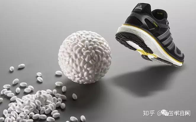 那么这个TPU又是什么呢?说白了就是我们平常说的塑料泡沫。boost是由上千个E-TPU(通过将普通TPU材料进行了发泡处理,TPU颗粒在高温高压下像爆米花一样发泡膨胀到原来体积的10倍)构成,再将这些发泡颗粒聚集成型便成为运动鞋的boost中底。