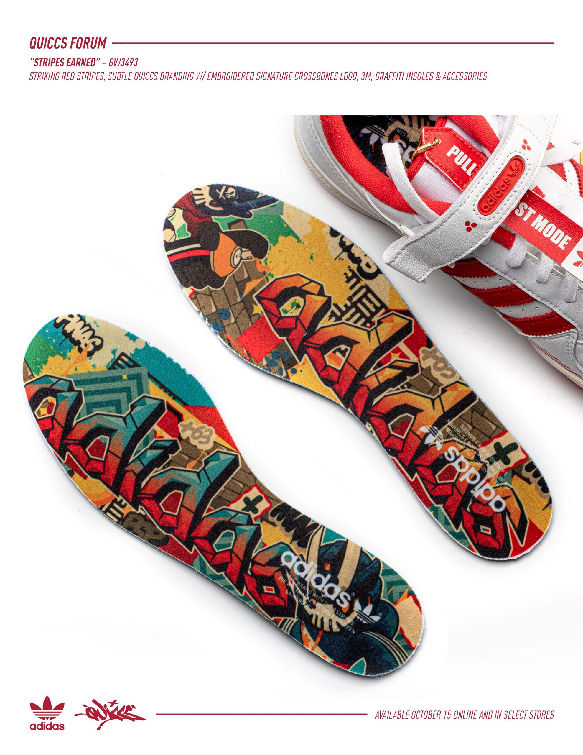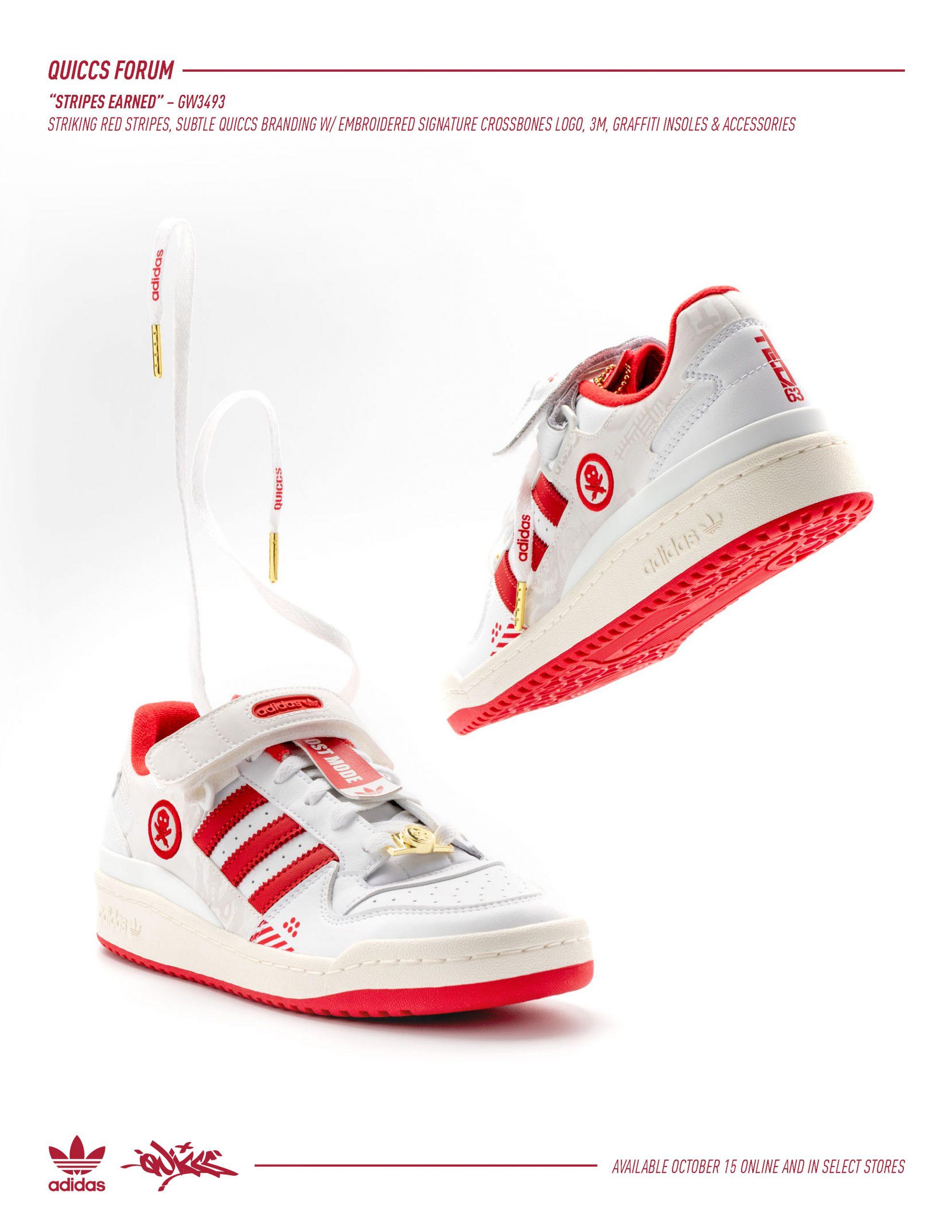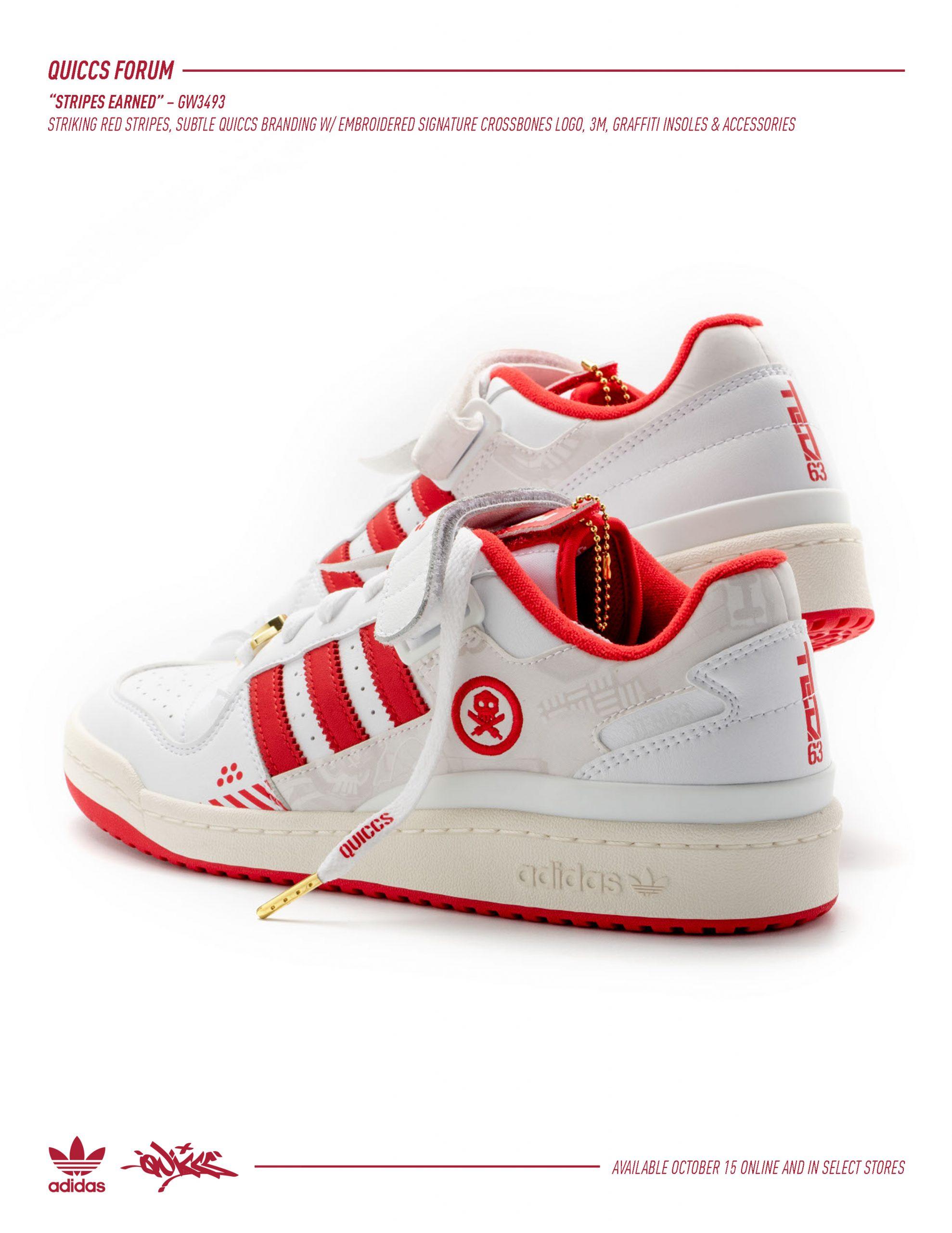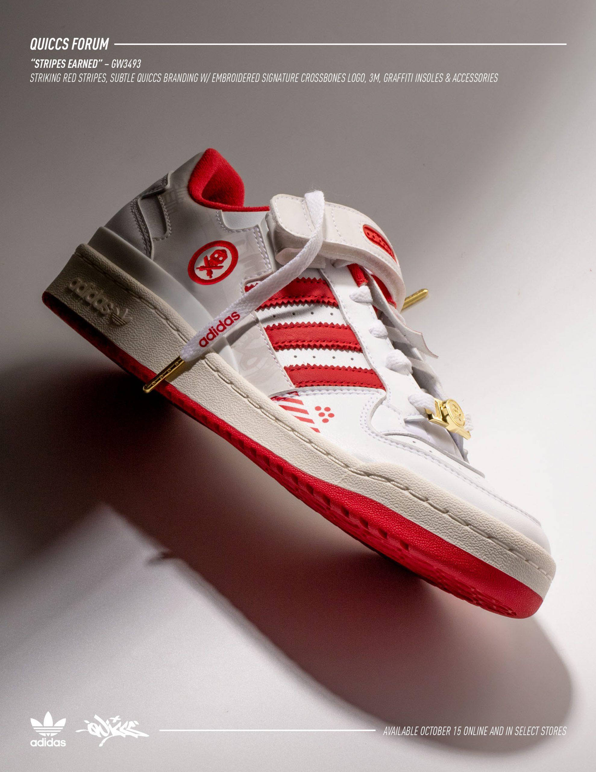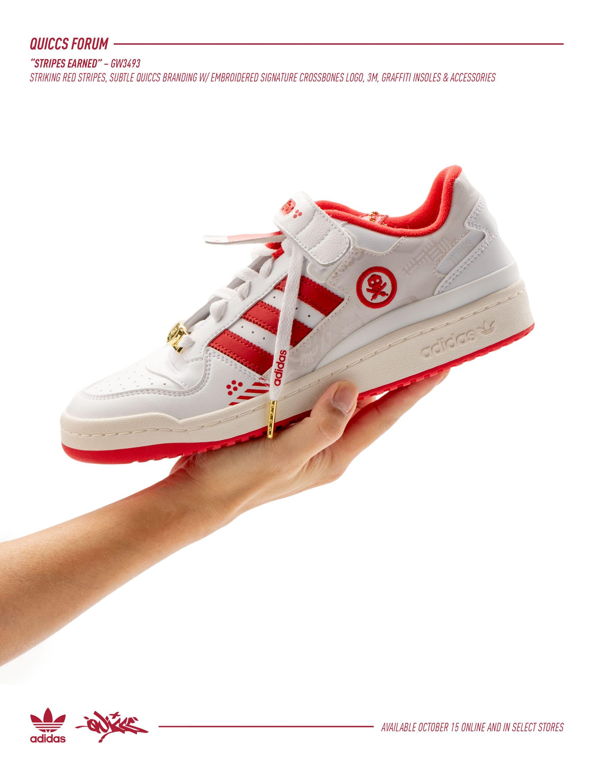 2021年11月,继早先建立合作关系后,艺术家Quiccs再次通过他的创造力和艺术语言,重新诠释了adidas Originalszzui具标志性的Forum鞋款。 作为首个与adidas Originals打造合作鞋款的菲律宾人,玩具设计师兼视觉艺术家Juanito“Quiccs”Maiquez加入到了由全球艺术家和运动员组成的精英行列当中,通过其重新设计的Quiccs FORUM鞋款,期待传递一个信息——激励人们勇于拥抱开放生活态度,不害怕去创造新的可能性、机会和体验。 “自从与adidas Originals开始合作以来,我就希望能够激励他人,通过激情、耐心和努力工作,可以将梦想变成现实。创作一双属于自己的“三条纹”鞋款是我一直以来的梦想,现在我很荣幸可以和我的同胞以及全世界分享这双标志性的adidas Originals鞋款,其设计正是源自我的激情和创造力,” Quiccs说道。 醒目的红色代表了他对adidas Originals的向往和热情,这双全新的Forum鞋款象征着合作的成果和梦想的实现。受到Forum 84 Low OG“Blue Thread”和“Pine Green”配色的启发,Quiccs重新设计了Forum,将该鞋的经典外观与他的个人品牌融合在一起,体现了Forum追求自我表达和创新想法的精神初衷。 Quiccs具有个人特质的艺术语言通过诸多设计元素呈现,比如交叉骨标志和“TEQ63”字样,标志性的形象设计还出现在了鞋身的3M元素之上,并以金色logo的形式呈现于后跟部分。此外 而鞋身上的绑带同样是此次Quiccs FORUM鞋款的特色所在,拥有三种可互换的绑带设计,为穿着者提供了自我表达和风格探索的更多搭配选择。adidas Originals x Quiccs FORUM鞋款建议零售价1,099元,将于2021年11月5日在平台独家发售,敬请关注。???????