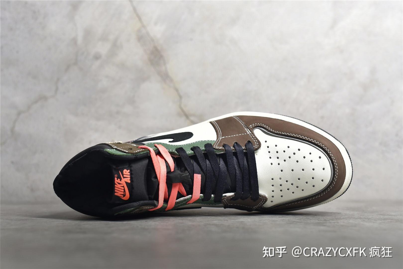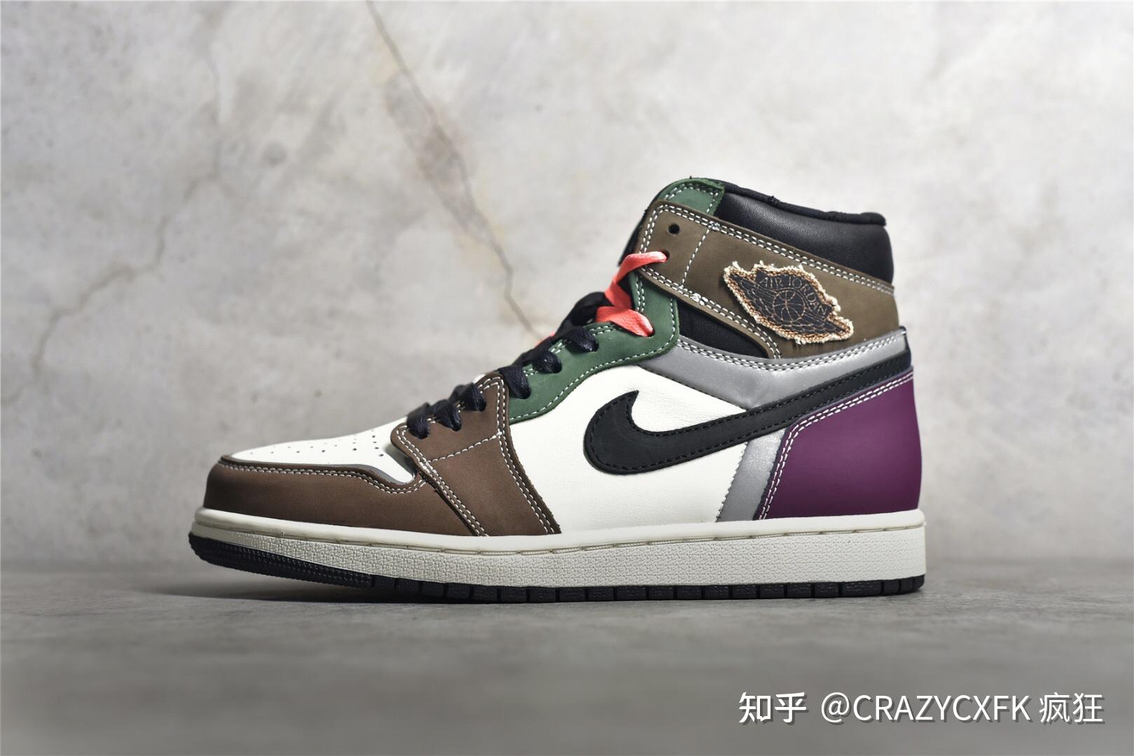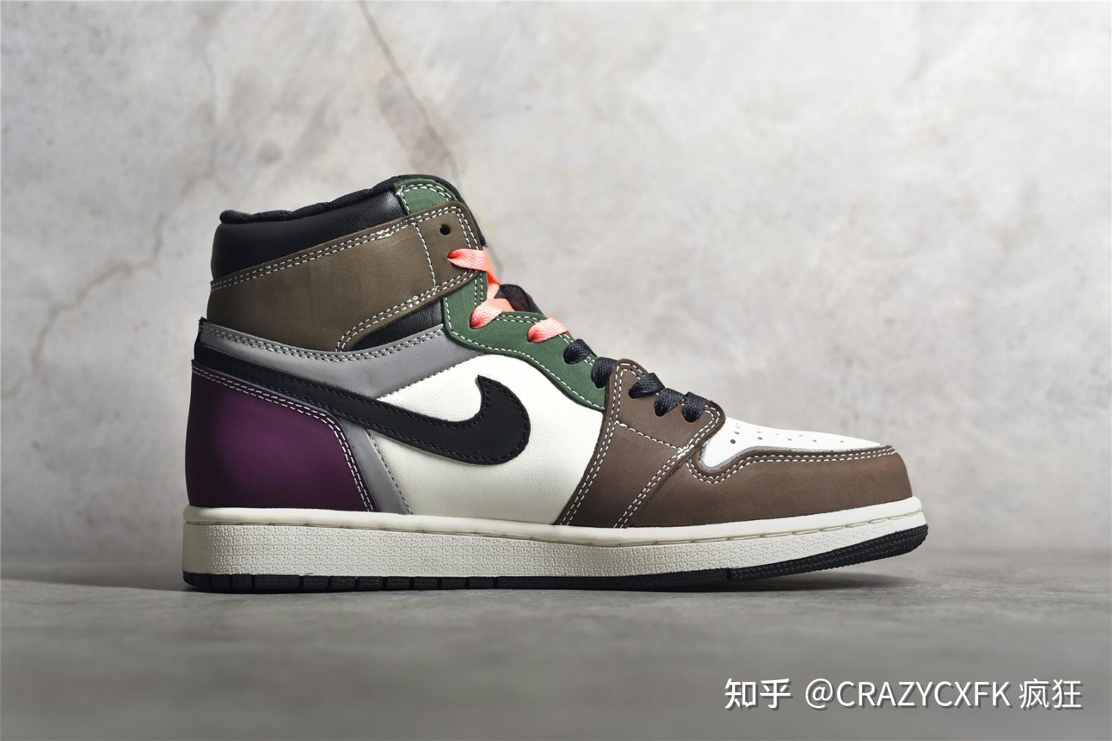 乔丹 Air Jordan 1 High OG Hand Crafted 缝合怪彩色拼接高帮运动鞋 货号DH3097-001。构色丰富,层次鲜明,细节融入3M反光鞋材。白色中底和黑色外底,搭配黑橙双色鞋带。鞋身用摩卡棕、黑紫色、白灰色和绿色拼接,看鞋穿鞋见名字。