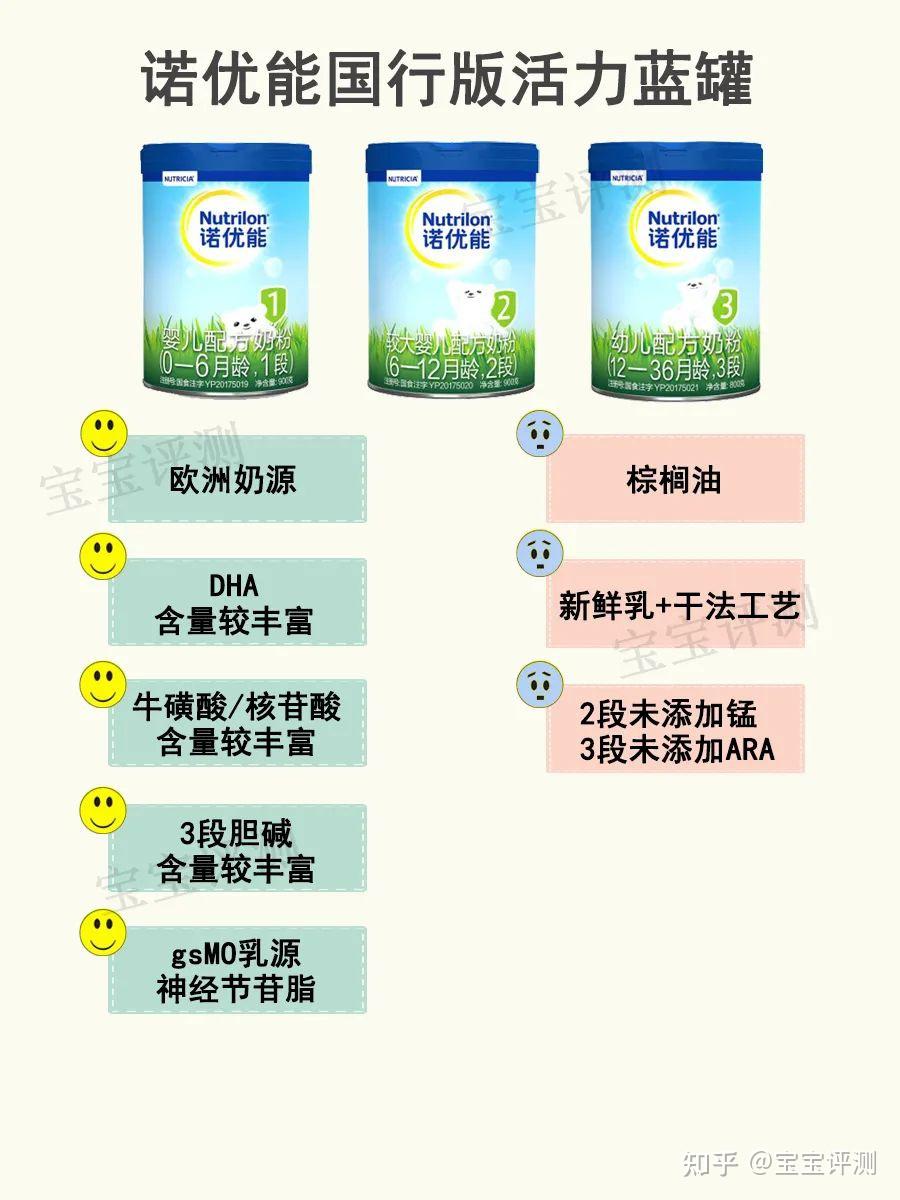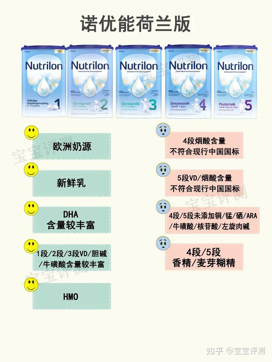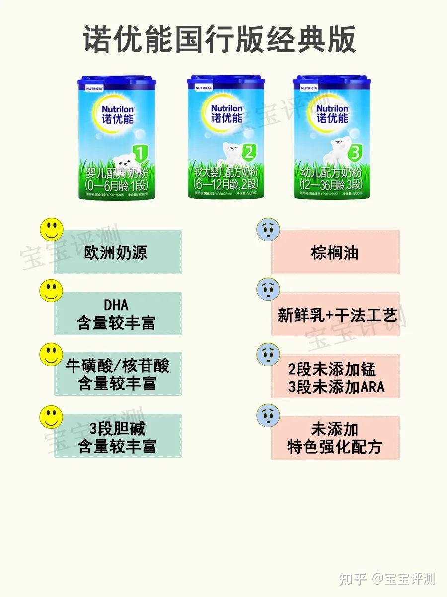 ? 这一期我镁反对比的奶粉品牌是诺优能,来回答一个问题,如果你想买诺优能的奶粉,应该选哪个版本哪个系列呢?这次列入对比的有三个版本,国行版、荷兰版、香港版。 先看国行版,国行版分两个系列,经典版和活力蓝罐。活力蓝罐之前叫诺优能pro,现在叫活力蓝罐。 这两个系列有什么不一样呢? 有三点: 第一点,zzui直观的区别就是经典版用的是易乐罐包装,一罐是900克;活力蓝罐用的是铁罐包装,一罐是800克。铁罐包装的好处,是物流长途运输的时候不容易被挤破。 第二点区别,也可以从包装上看到,就是经典版的产地是爱尔兰,活力蓝罐的产地是荷兰。这两个奶源地都不错。 第三点,也是zzui主要的区别,就是这两个系列宣称的配方有一点不一样。为什么说是“宣称”呢?实际上,从包装的标识来看,经典版和活力蓝罐,配方是一样的,配料表和营养成分表,都是一样的。 但是,在网上,活力蓝罐的商品详情页,都宣传“含有乳源双重活性因子”,也就是gsMO2。 但经典版的商品宣传里,是没有这个东西的。 gsMO是什么东西呢?它的全称叫乳源神经节苷脂,是一种乳源活性因子,在母乳中含量比较丰富,根据目前的研究,这个物质可以给宝宝提供一定的免疫保护。 在活力蓝罐整个实体包装的标识中,都没有看到有GSMO这个成分,那它哪儿来的呢?根据诺优能官方的回复,是天然牛乳中含有的,也就是配料表中“脱脂牛奶、脱盐乳清和浓缩乳清蛋白粉”里“天然含有”的。 为什么叫双重活性因子呢?因为它的配料表还添加了低聚半乳糖,也就是GOS,这也是一种活性因子。所以叫“双重”。 这个宣传有点儿玄乎。GSMO在母乳中含量比较丰富,但一般来说,牛乳中就算有也是很少量的。但诺优能的官方客服说他们产品中GSMO的含量和母乳差不多,达到十几毫克每千克。 但这个我们从包装上是看不出来的,也没看到哪儿有检测报告。所以就搞不清楚是真是假了。 如果是真的,那经典版和活力蓝罐这两个系列,建议选活力蓝罐,如果不是真的,那选谁都一样。 (配方对比) 我们再来看看荷兰版。 诺优能的荷兰版很多人也把它叫“荷兰牛栏”,但注意,跟英国牛栏不是一回事。英国牛栏叫“COW&Gate”,诺优能荷兰版叫“NUTRILON”。 (英国牛栏) 总结起来说,荷兰版和国行版相比,有四点不同: 1、奶基原料有点不同:荷兰版全段奶基原料都是新鲜乳,国行版1段也是新鲜乳,但2段3段里面除了新鲜乳,还加了乳粉。 2、zzui新更新配方和包装的荷兰版没有采用可能会增加宝宝便秘机率的棕榈油,国行版经典和活力蓝罐里是有棕榈油的。 3、特色强化配方不同:荷兰版加了母乳低聚糖HMO,这个成分一定程度上对肠道菌群和免疫系统发育有用。 4、荷兰版针对1岁以上宝宝的4段/5段配方表现不太好,存在部分维生素或矿物质含量不符合现行中国国标的情况,同时有多种营养素也没有添加。而且,4段、5段都加香精和麦芽糊精。这方面比国行版要差。 我们再说一下香港版。 香港版叫“诺优能金版草饲”,为什么叫草饲?意思是奶基原料的来源是草饲奶牛的奶,草饲奶粉这个概念我们之前讲过,其实不用在意。而且,国行版也宣传自己奶源是草饲奶牛。 诺优能香港版也宣称含有gsMO。 但香港版1段、3段存在部分营养素含量不符合现行中国国标的情况,2段、3段存在个别成分的含量没有标注或缺乏的情况。 zzui后我们总结一下,综合奶基原料、基础营养、强化配方等综合指标来看:0~1岁这个阶段,笨爸爸更推荐诺优能的荷兰版,一个是整段奶基原料都是新鲜乳,二是没有添加棕榈油;三是特色强化配方加了HMO,三是维生素D的含量也比较高,价格比国行版也更便宜。 但是,它针对1~3岁宝宝的4段和5段则不推荐。 1~3岁推荐的示氟行版的活力蓝罐,因为它是铁罐,另外貌似、可能有一定量的GSMO。 当然,如果你嫌买海外版麻烦,那就直接1~3段都选活力蓝罐,价格上也属于中低端的价位。 好了,本汾到这儿就结束了。 如果你觉得文章有用,还请多多转发支持!如果你有任何问题想咨询,欢迎留言,笨爸爸将为你单独解答。 历史回顾 1、32款国行版奶粉全面评测 2、38款国产奶粉全面评测 3、爱他美五大版本奶粉全面评测 4、美素佳儿23款奶粉全面测评 5、美赞臣33款奶粉全面测评 6、a2奶粉全面评测 7、66款奶瓶&奶嘴测评 8、宝宝防晒霜大测评 9、宝宝驱蚊产品大测评 10、22款宝宝米粉评测 11、13款宝宝维生素D评测 12、20款拉拉裤评测 ....... 请在不同栏目中查看,或在后台输入相应关键字查询。 欢迎关注“宝宝评测”。8年商品对比检测经验,不投机取巧,用科学理性的笨方法提供靠谱的消费建议。国行版