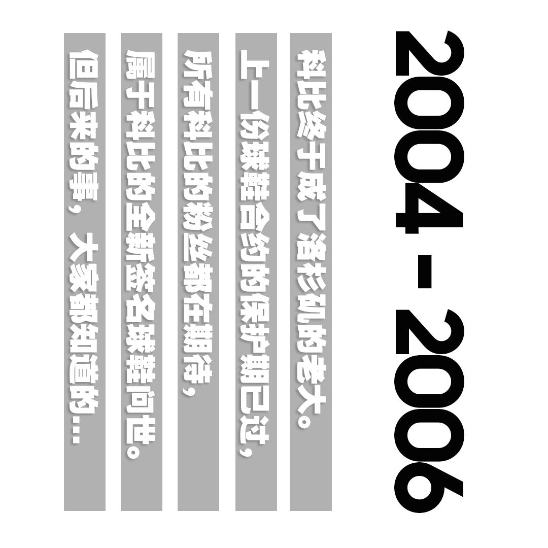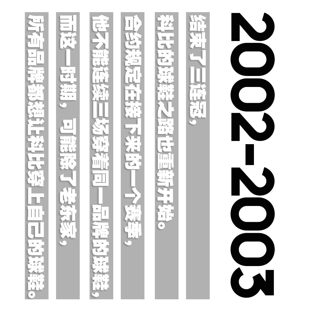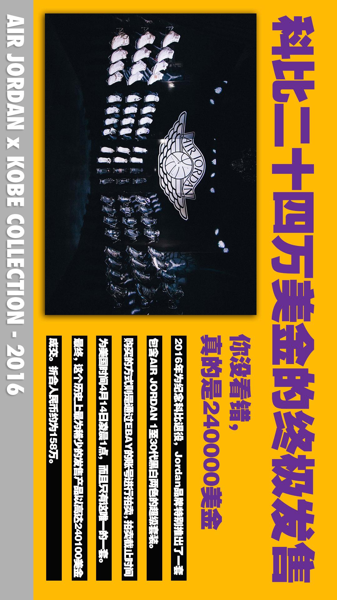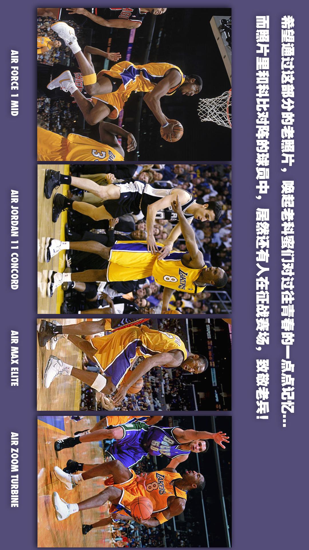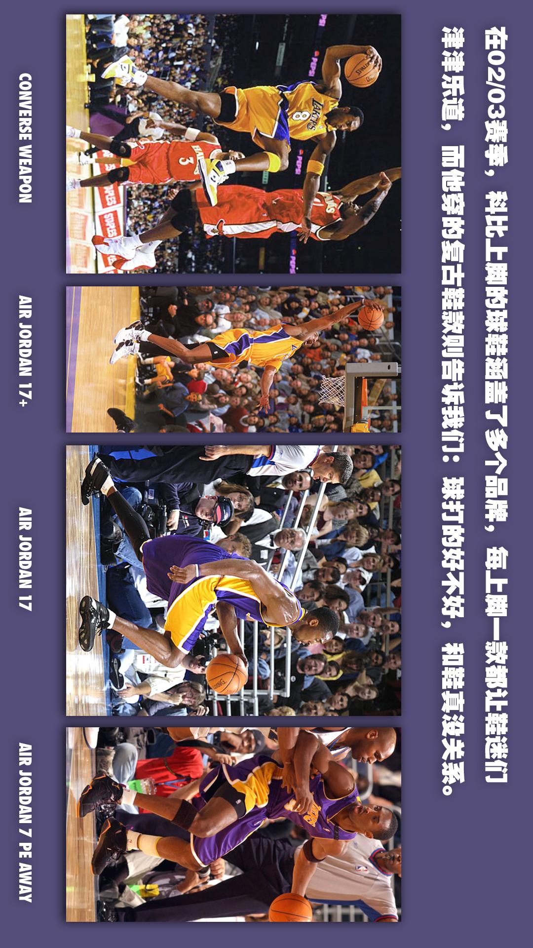 本文首发于我的个人微信公众号:SoleFresh 如要转载请经本人同意,且注明出处。谢谢。 前言1: 因为考虑到大部分朋友都是拿手机浏览,所以图片采用横版。 请大家将手机横着浏览,如有不便,敬请谅解。 图片较多,阅读全文大约需要十分钟。 前言2: 原本是计划在12月19日科比球衣退役那天发布的内容,但因为查询资料所以耽误到12月22日才发布。所以就免去原本在公众号上开头那一小段矫情的文字,直接上干货吧。送给所有喜欢科比,以及喜欢球鞋的朋友们。 前言3: 文中内含81款曾由科比代言的市售版球鞋,每一款所登出的配色我都添加了发售时间及货号。想要收集的朋友可以按货号在搜索引擎搜索。另外还纪录了部分我个人认为十分有意义的未市售Sample版球鞋的介绍。不过例如Hyperdunk 08鞋面加ZK4鞋底这种测试版Sample我并没有加入,主要觉得这种测试版意义不大,另外类似的Sample产品图我还存有很多。如果大家有兴趣,今后我会专门整理一篇介绍科比的开发阶段Sample样品的专题。 OK,不废话了。跟随那些科比曾经拍摄的球鞋广告,来一起回顾这位乔丹时代之后,NBAzzui具影响力的球星的球鞋历程吧。科蜜记得点赞~哈哈~ zzui后的小得瑟一下:那个夏天, 我!见!到!了!科!比! 你!们!羡!慕!吗!? OK,谢谢大家抽时间浏览。 更多关于球鞋系列的整理收录,欢迎关注我的微信公众号:SoleFresh 2018年即将到来,在这里先祝愿大家新年快乐。也鞭策一下自己努力加油,争取在新的一年能让SoleFresh成为一个大家看过都能有一些小收获的球鞋自媒体。