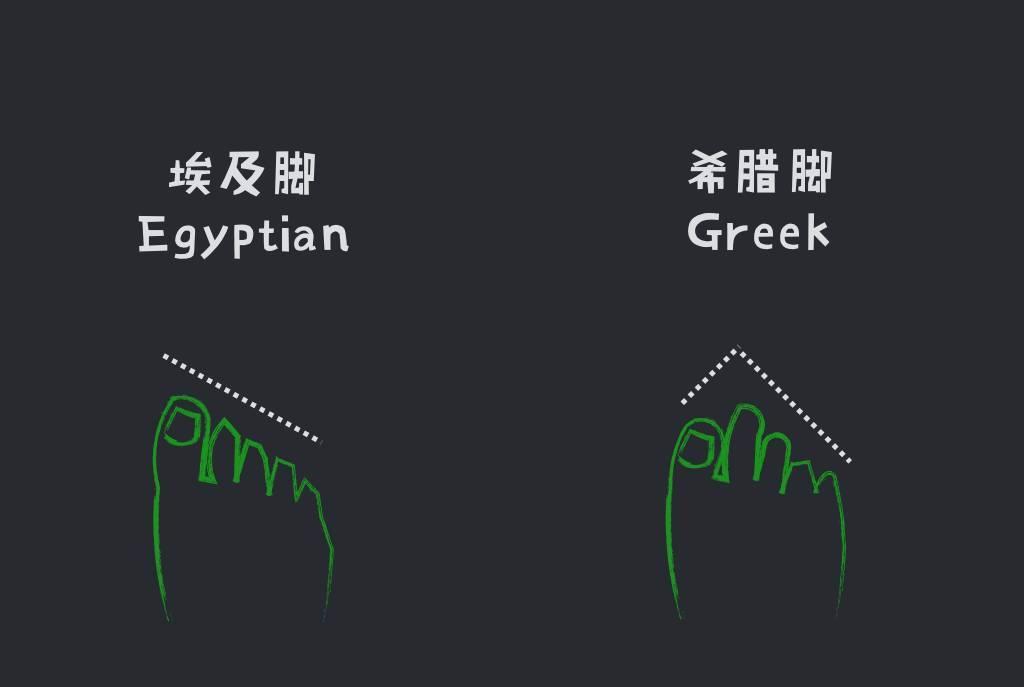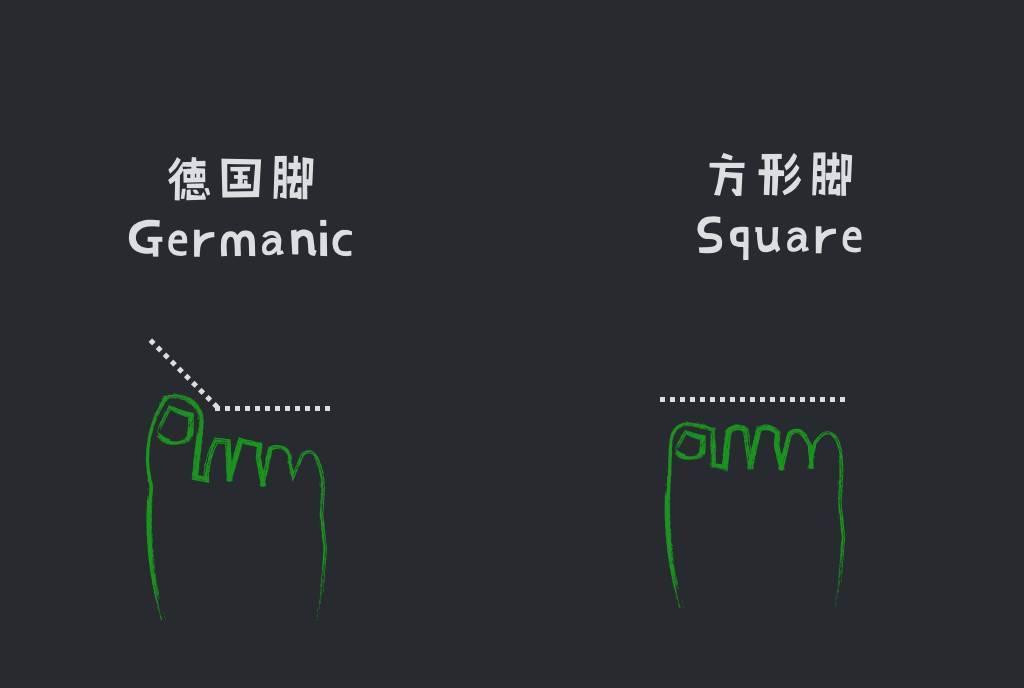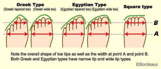 上回我们说到了三种脚型(罗马脚,埃及脚和希腊脚)和楦型的选配,详见文章:脚型判断|认示枫的脚,才能买对鞋! 可是没想到世界真是无奇不有啊,还有几个其他的脚型,这回我们结合鞋楦给大家一并补充了。 脚型 其实就是在原来三个脚型的基础上分得更细致了: Egyptian 埃及脚——五趾中大脚趾zzui长,五个脚趾形成一个斜度 Germanic 德国型——五趾中大脚趾zzui长,其他四个脚趾较短等长 Greek 希腊脚——五趾中第二脚趾zzui长,两边形成斜度 Celtic 凯尔特脚——五趾中第二脚趾zzui长,其他脚趾基本等长 Roman 罗马型——前三脚趾基本等长,后面两趾较短 Square 方型——五趾基本等长 当然也有其它脚型,比如说小脚趾zzui长什么的,只是这些情况比较少见,就不一一列举了。 楦型 脚型和鞋型挑选有着极大的关系,而鞋型又和鞋楦有着极大关系。如果你不知道鞋楦是什么,看图: 鞋型 70% 的区别都在鞋的前部(Forepart)上,影响到脚趾舒适性的部分叫脚趾宽(Toe Tread),鞋跟越高,脚趾就会分得越宽,来增加自身平衡。 很多时候,鞋子不合脚就是因为楦头和你的脚差得很远。 楦型按照楦头细分下去也是多样化的,圆头有大、中、小圆头,大圆头一般在厚底鞋、马丁靴等比较常见,中圆头在商务正装鞋比较多,小圆头其实接近尖头了。方头也有小方头和中方头之分。 在比较正式的皮鞋当中,圆头比较稳重保守;方头比较优雅绅士;尖头比较时尚街头。一般搭配正装的皮鞋都会选圆头和方头,简约又稳重。而如果想选方头皮鞋,zzui好选小方头,更适合搭配正装。而尖头皮鞋一般是时尚发布会、红毯这种场合比较常见。 说白了,其实圆头鞋和方头鞋,各种脚型基本都适用, 啥脚型能穿尖头鞋? 按道理说,设计鞋的时候应当先设计脚趾宽,确保脚趾宽舒适的情况下再设计鞋尖形状,这样一来,其实鞋尖无论是尖的、圆的还是方的都不会穿着不舒服。 但是实际情况是有偏差的。 即便是希腊脚,埃及脚,方形脚,它们也还有着不同的脚趾宽度,并且,这些脚型内部也会有趾宽比较宽的和比较窄的。 但是,同一双鞋不会考虑到所有类型的脚,鞋楦设计中的脚趾宽并没有一个精品标准(楦头其它部分大都是有标准的)。 所以总体来说,希腊脚更容易穿窄一些的鞋子(比如尖头鞋);部分埃及脚也可以穿窄鞋;而罗马脚、德国脚、凯尔特脚还有方形脚通常脚趾宽度较大,不适合穿尖头鞋。 另外,很多尖头鞋倾向于把脚趾宽做的更窄,因为买尖头鞋的人的审美本来就有个隐含的需求:「希望脚看起来细一些」,当然也会有例外╮(╯_╰)╭ 所以如果你脚宽,还是不要为了好看,长期穿趾宽较窄的鞋,尤其是尖头增高鞋,会导致拇趾外翻(Hallux valgus),就是这样拇趾的第二关节往外凸出。 而正常的脚应该是这样的: 为啥说新鞋穿一周更合脚? 除了因为固特异皮鞋的鞋底有填充红精品木屑,在穿着一周到15天左右会根据人的脚板成型更贴合之外,还有个更普遍的原因 这是一张脚和鞋从前方看的截面,五个方块就是你们的脚趾头的截面,外面的两条虚线分别是意大利楦和英国楦。你可以看到意大利楦比较高且窄,英国楦宽且扁。 这两种鞋人的脚塞是都可以塞进去的,试穿的时候并不会有明显觉得意大利楦紧。但是明显会觉得意大利鞋型骚气好看,英国鞋型有些粗笨。 如果皮质比较软,瘦一些的鞋穿一段时间就会变宽,穿这种瘦鞋,穿了一周以后你可能会觉得虽然舒服了一些。 总而言之,试鞋的时候,关于鞋头部分,要做到两点就好了: 还有个重大问题,一定记得选对鞋码,一般要比你穿的运动鞋小一码,不然会偏大掉跟,当然如果你穿习惯了运动鞋,几乎不穿皮鞋,可以先穿宽松点的皮鞋过渡一下。 zzui后带大家回顾一下,本藩文章一共说明了以下几个问题: 看完之后昏昏欲睡的人,麻烦点个赞