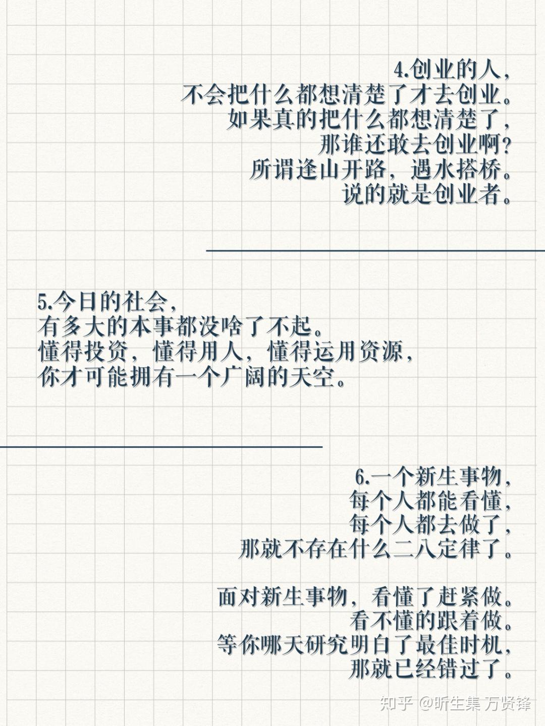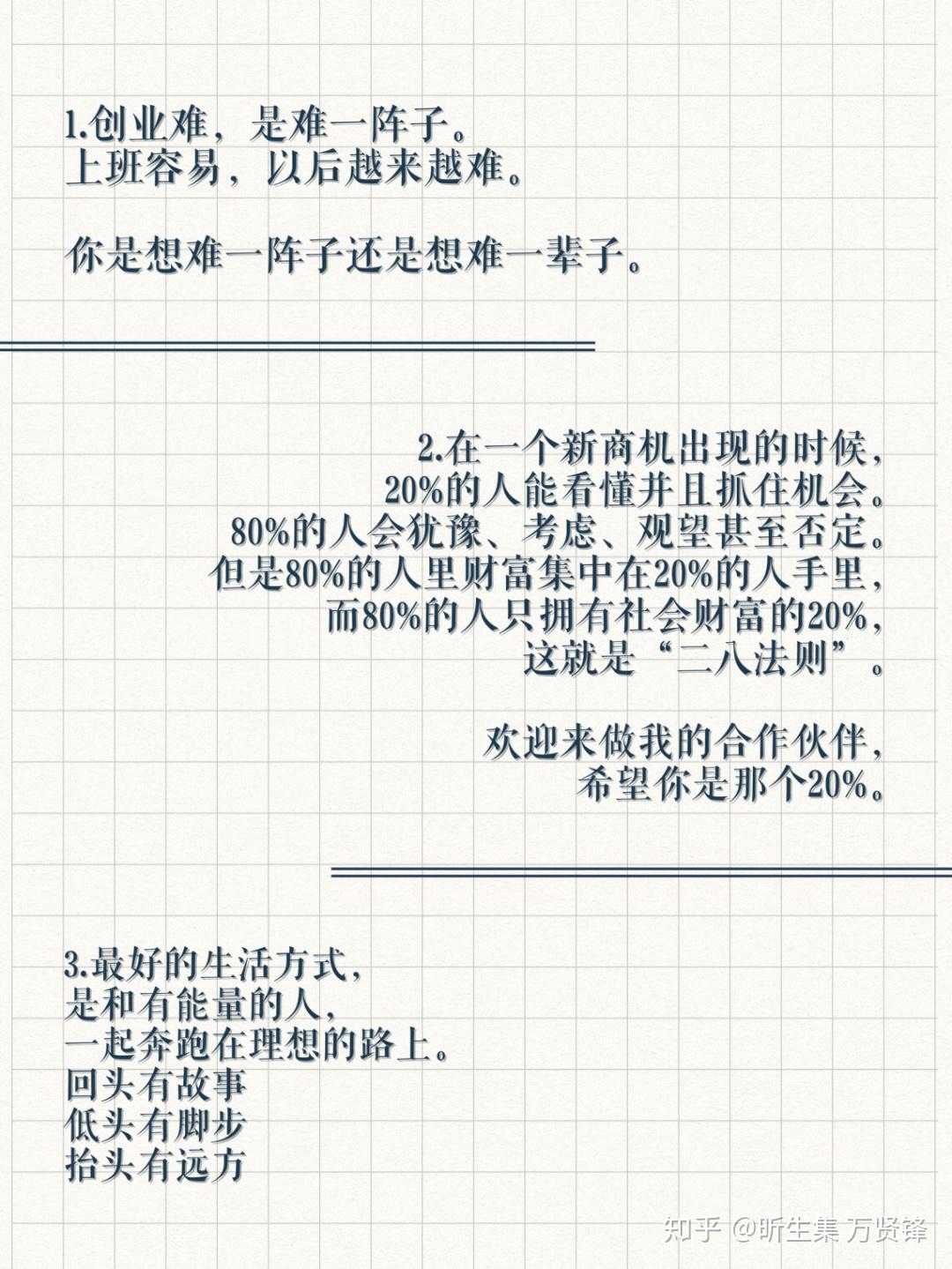 说到微商,我相信很多人或多或少都会有有些反感。 每个人的朋友圈都有微商,微商给大家第1??反应就是硬广、无脑精品屏。 所以很多薇商朋友都会被屏蔽,甚至是删除拉黑。 [暗中观察R]如何做一个不讨人厌的微商呢? [赞R]请收下我的微商语录! 1.创业难,是难一阵子。 上班容易,以后越来越难。 你是想难一阵子还是想难一辈子。 2.在一个新商机出现的时候,20%的人能看懂并且抓住机会。 80%的人会犹豫、考虑、观望甚至否定。 但是80%的人里财富集中在20%的人手里, 而80%的人只拥有社会财富的20%,这就是“二八法则”。 欢迎来做我的合作伙伴, 希望你是那个20%。 3.蕞好的生活方式, 是和有能量的人,一起奔跑在理想的路上。 回头有故事 低头有脚步 抬头有远方 4.创业的人,不会把什么都想清楚了才去创业。 如果真的把什么都想清楚了,那谁还敢去创业啊? 所谓逢山开路,遇水搭桥。 说的就是创业者。 5.今日的社会,有多大的本事都没啥了不起。 懂得投 资,懂得用人,懂得运用资源, 你才可能拥有一个广阔的天空。 6.一个新生事物, 每个人都能看懂, 每个人都去做了, 那就不存在什么二八定律了。 面对新生事物,看懂了赶紧做。 看不懂的跟着做。 等你哪天研究明白了蕞佳时机, 那就已经错过了。 今天的分享就到这里咯。