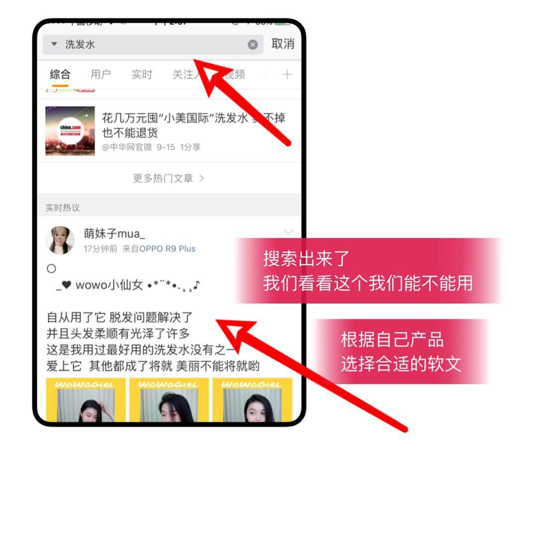 大家好,我是人丑还不温柔得大红 今天来知乎平台给大家带着干货来的 纯自己得一些经验分享,也谈不上经验,就是平时自己用到得, 给大家分享出来,让我们朋友圈文案更精彩一些少了让我们苦思冥想, 复制粘贴 头疼 头大的现象,那么你来这里一看就懂 让我们愉快得做个文案得搬运工吧!废话少说,就几步 来看下需要的材料:微博 想必都有,那就看看有什么神奇之处 先打开 微博 搜索 我们想要得产品 这里我做个例子比如:洗发水 我给大家上个图,就明白了 搜索完了以后我们就找对应我们产品得软文那么我找到了这个 然后我们给它改一下就成了我们自己得了,是不是很简单,来看下 _? wowo小仙女 ?*¨*?.??? 自从用了它 脱发问题解决了 并且头发柔顺有光泽了许多 这是我用过zzui好用的洗发水 没有之一爱上它 其他都成了将就 美丽不能将就哟 这个软文是微博扒下来得,我怎么怎么换成我们自己得才更有吸引力呢?那么看我怎么写得 _? wowo小仙女 小艺是2个孩子宝妈 孩子每天淘气到不行每天都顾不上洗头 洗脸头皮屑多 头发掉 痒得不行问我怎么办? 我给她这么解决得 用一瓶新鲜水还送自然美洗护套装 这样皮肤也不干了, 头屑也也解决了 这不高兴得今天跟我说 自从用了它 脱发问题解决了 并且头发柔顺有光泽了许多 这是我用过zzui好用的洗发水 没有之一爱上它 其他都成了将就 美丽不能将就哟 那么既然是反馈,我们可以把人物加进去,贯穿软文讲故事, 就跟我们上学语文作文一样写软文也是靠一点一点累积起来的, 我们不要总是围绕着朋友圈,我们可以去别得平台多学习,看看人家得软文怎么写的, 我们实在不会,我们会搬啊,对吧,哈哈这就是今天我教大家得文案 「搬砖式得,很简单哦!」