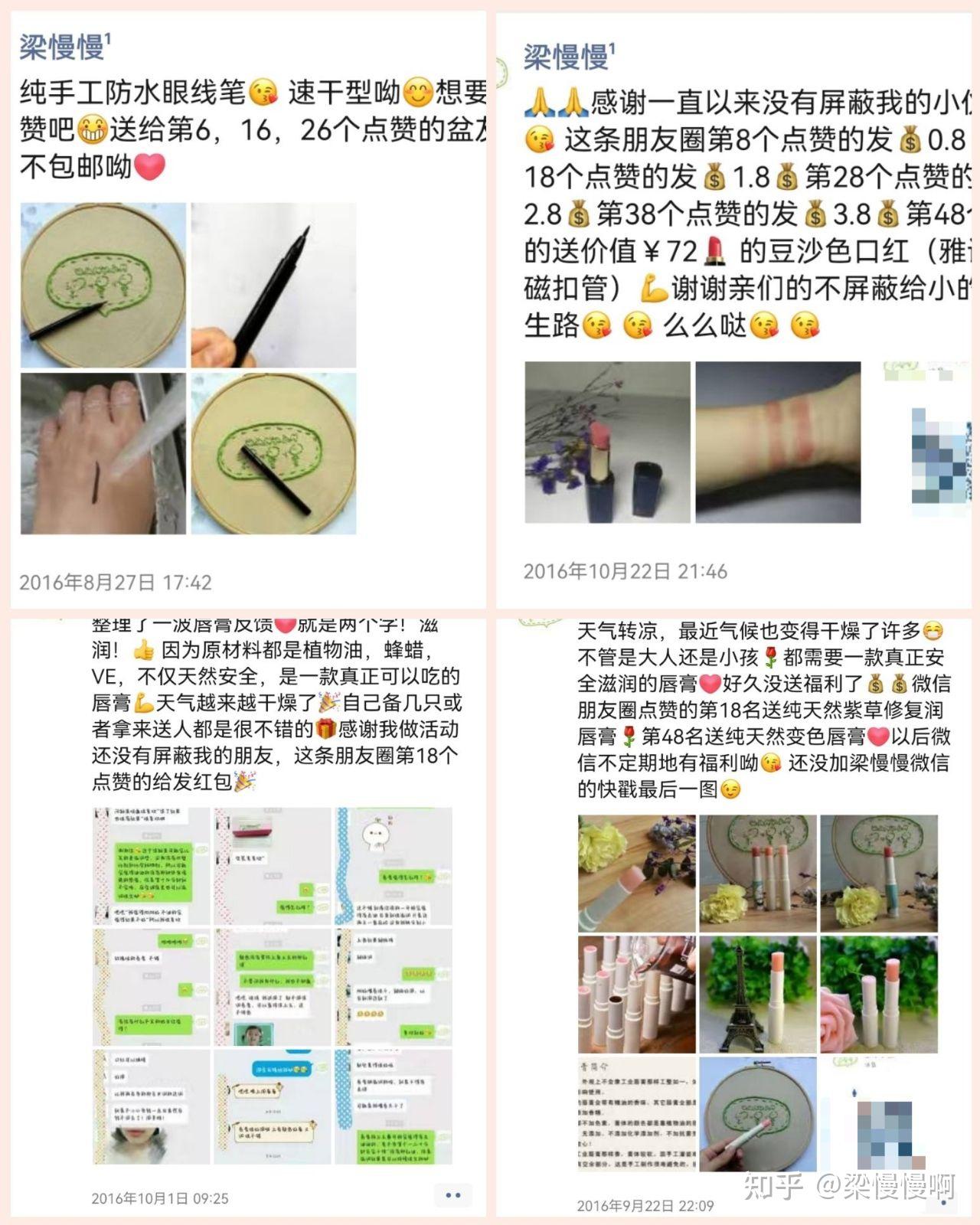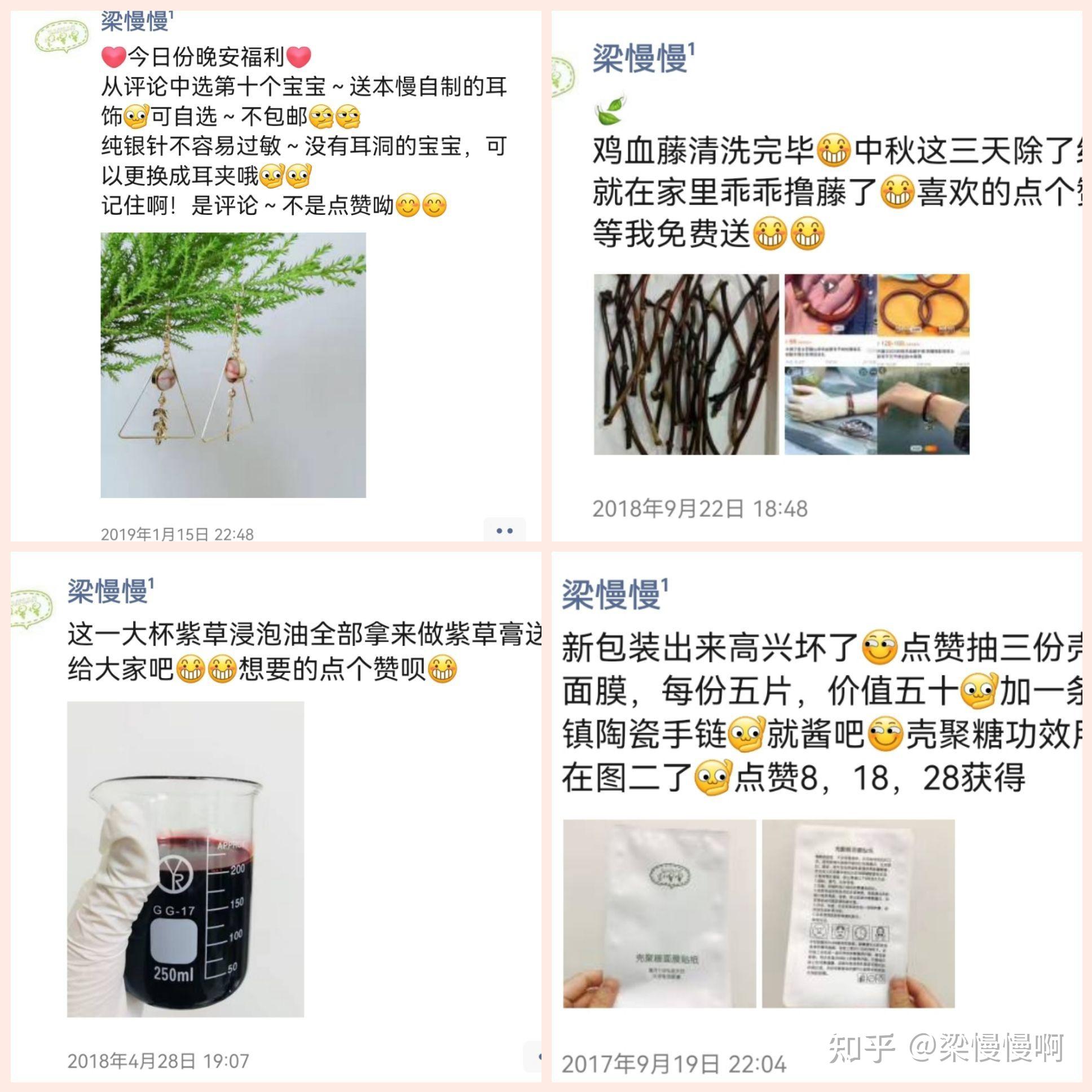 我自己还会经常自己做一些手工,或者是自己调配护肤品瓶瓶罐罐的,或者是自己品牌的新产品,来送给朋友圈的好友。来进行互动。