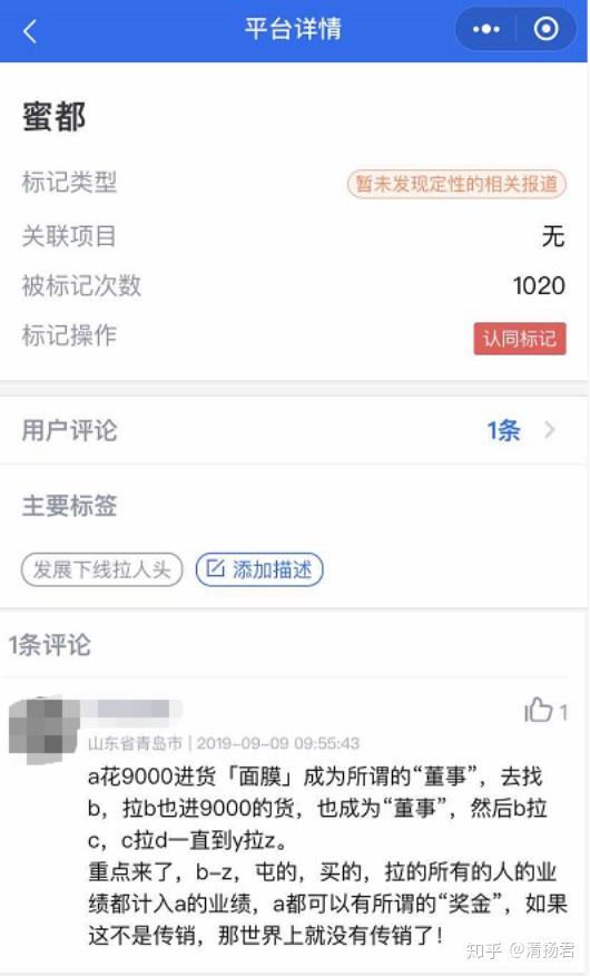 上文中,清扬君介绍了蜜都代理商“朋友圈”的秘密。本文接着带大家了解“新微商模式”下的蜜都微商。 公开资料显示,蜜都微商是由广州蜜都化妆品有限公司运营的。企查查显示:广州蜜都化妆品有限公司(本文统称“蜜都微商”),成立于2016年11月4日,注册资本100万元,实缴资本0元。法定代表人、实际控制人李麟持股43.7%,股东陈志昊持股42.3%,股东谭善成持股14%。 上篇文章中,清扬君看了蜜都微商的代理商小吴(化名)的朋友圈之后,觉得蜜都微商在代理商的宣传中真的是微商界的“王者”,精品佛代理商只要选择蜜都,只要努力了,月入几万至几十万都轻而易举。那么到底是蜜都微商的产品足够厉害,还是代理模式别具一格呢? 根据小吴提供的蜜都代理商经常宣传使用的蜜都素材库,清扬君发现,里面的产品很多都涉嫌虚假宣传。比如: ? 蜜都燕窝臻耀美肌面膜,宣传“深层修护肌肤,由内而外白皙焕采”; 蜜都冰透雪肌防护喷雾,宣传“无惧夏日阳光,保护肌肤、打造日光抵御屏障”; 蜜都24K金玻尿酸原液,宣传“98%纯度纳米金箔,提升白皙度”; 蜜都二裂酵母赋活紧致安瓶原液,以成分暗示产品具有“调节免疫力,帮助增强肌肤代谢”、“帮助促进胶原蛋白和弹性蛋白的合成”、“促进胶原蛋白合成、帮助抵御阳光对皮肤的伤害”等内容。 经查询发现,以上产品均为非特殊用途化妆品。其中: 蜜都燕窝臻耀美肌面膜,备案编号:粤G妆网备字2019176479。而“白皙焕采”显示是禁用于该产品宣传的美白类特殊用途化妆品功效。另外,2019年12月16,该产品在备案后检查中因“产品安全技术相关资料不全”被责令改正。 蜜都冰透雪肌防护喷雾,备案编号:粤G妆网备字2019054525。而“无惧夏日阳光、打造日光抵御屏障”显然是在宣传禁止用于非特殊用途化妆品宣传的“防晒”作用。另外,2019年12月16,该产品在备案后检查中因“产品安全技术相关资料不全”被责令改正。 蜜都24K金玻尿酸原液,备案编号:粤G妆网备字2019287873。而“提升白皙度”是明显的宣传美白作用。另外,该产品成分表中只有“金”成分,并非98%纯度纳米金箔,该产品涉嫌虚假宣传。 蜜都二裂酵母赋活紧致安瓶原液,备案编号:粤G妆网备字2020093078。根据《化妆品卫生监督条例》对化妆品的定义,化妆品不具有“调节免疫力,帮助增强肌肤代谢”、“帮助促进胶原蛋白和弹性蛋白的合成”、“促进胶原蛋白合成”的功能范围,涉嫌虚假宣传。 值得注意的是,蜜都产品的生产厂家广州蝶泉化妆品有限公司(以下简称“蝶泉公司”),曾被行政部门多次处罚。 2018年5月21日,蝶泉公司因在未依法报批建设项目环境影响评价文件的情况下,擅自投入建设,被从广州市从化区环保局责令停止建设,并处罚款30974.05元; 2018年1月31日,蝶泉公司因未能提供如实记录员工三级教育和日常安全生产教育培训的资料,被广州市从化区安监局罚款10000元; 2016年8月26日,蝶泉公司因生产未取得特殊用途化妆品批文的化妆品,被广州市从化区精品监局罚款、没收违法所得、没收非法财物; 2016年4月6日,蝶泉公司被广州市精品监局警告。 小吴提供的《蜜都3.0模式商业计划书》显示,蜜都微商的代理商有两个级别,分别是20箱3200元经销商(董事)和5箱1100元经销商。 但实际上,20箱经销商只是zzui低拿货价的门槛,蜜都微商采用的并非以往的级别制,而是按月以拿货量为基准的奖励制。 按照蜜都微商培训老师的讲解,蜜都代理商的利润来源有三种,分别是零售利润、差价利润和团队奖金。 值得注意的是,在灵鲲金融风险查询举报中心平台,“蜜都”已经被标记1020次。还有网友评论称:“a花9000进货面膜成为所谓的‘董事’,去找b,拉b也进9000的货,也成为‘董事’,然后b拉c,c拉d一直到y拉z。重点来了,b-z屯的,买的,拉的所有人的业绩都计入a的业绩,a都可以有所谓的‘奖金’,如果这不是传销,那世界上就没有传销了!” 此外,清扬君发现,在闲鱼二手电商平台,蜜都微商产品在大量低价出售。以零售价59元一盒的蜜都臻耀美肌面膜为例,5箱代理的拿货价为22元一盒,20箱代理的拿货价为16元一盒,而在闲鱼平台上很多商家以9元左右的价格在出售,该价格远低于蜜都代理商的zzui低拿货价。 为什么会出现这种情况呢?清扬君觉得有几种原因:1、代理商囤货太多,为了止损或回笼奖金低价甩买。2、金字塔高层的代理商完全可以享受下线们带来的业绩奖励,手里的货已经不需要正常销售,放在手里也是放着,低价处理算了,还能挣点钱。 清扬君认为第2种原因占比应该居多,因为除去zzui初的20箱货的门槛,代理商已经不需要自己订货了,甚至不需要赚代理差价和零售差价了,直接大量发展代理、鼓励代理发展代理就可以赚钱了,既省钱又能快速致富。 不过,zzui终接盘的会是谁呢?