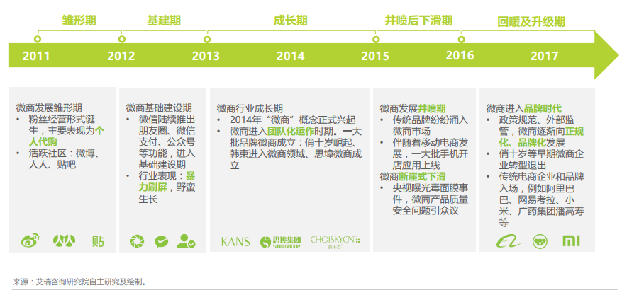 微商发展历程 从野蛮生长走向规范化,微商发源于个人代购,移动端和社交应用的发展为微商提供了生根发芽的土壤。一如所有的新生事物,微商的发展也经历了从野蛮生长到规范化的过程。 2011-2012年,微商发展雏形期 2012-2013年,微商基础建设期 2013-2015年,微商行业成长期 2015-2016年,微商发展井喷期 2016-2017年,微商进入品牌时代 趋势: 一、微商B2C模式代表未来发展 二、微商将走向规范化和品牌化 三、微商推广方式更加多样化 四、微商生态化发展 易店无忧:用心做好每件事,为了广大的电商爱好者和实践者能便捷、安全、舒心的转让和购买网店而存在的一个网站。 数据来源于艾瑞咨询微商是指企业或个人通过微信、微博等互联网社交平台进行商品线上分销的商业活动,是一种社会化分销模式,人人都可以成为微商体系下的分销者。从zzui终销售端来看,主要有两种模式:一种是企业基于微信公众号开设微商城的B2C模式;一种是个人基于朋友圈开店的C2C模式。